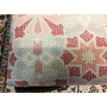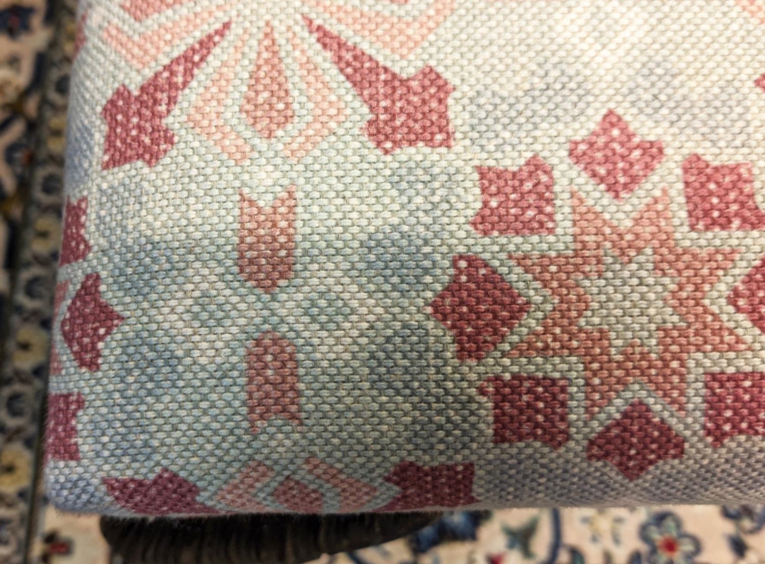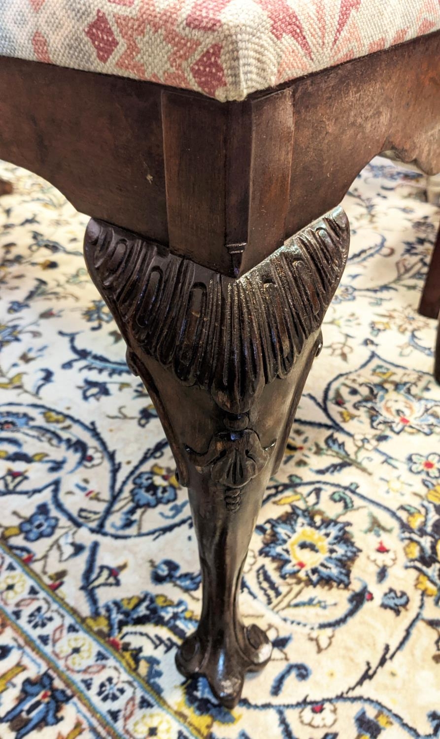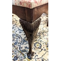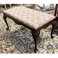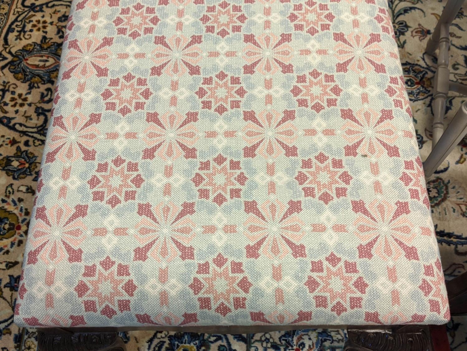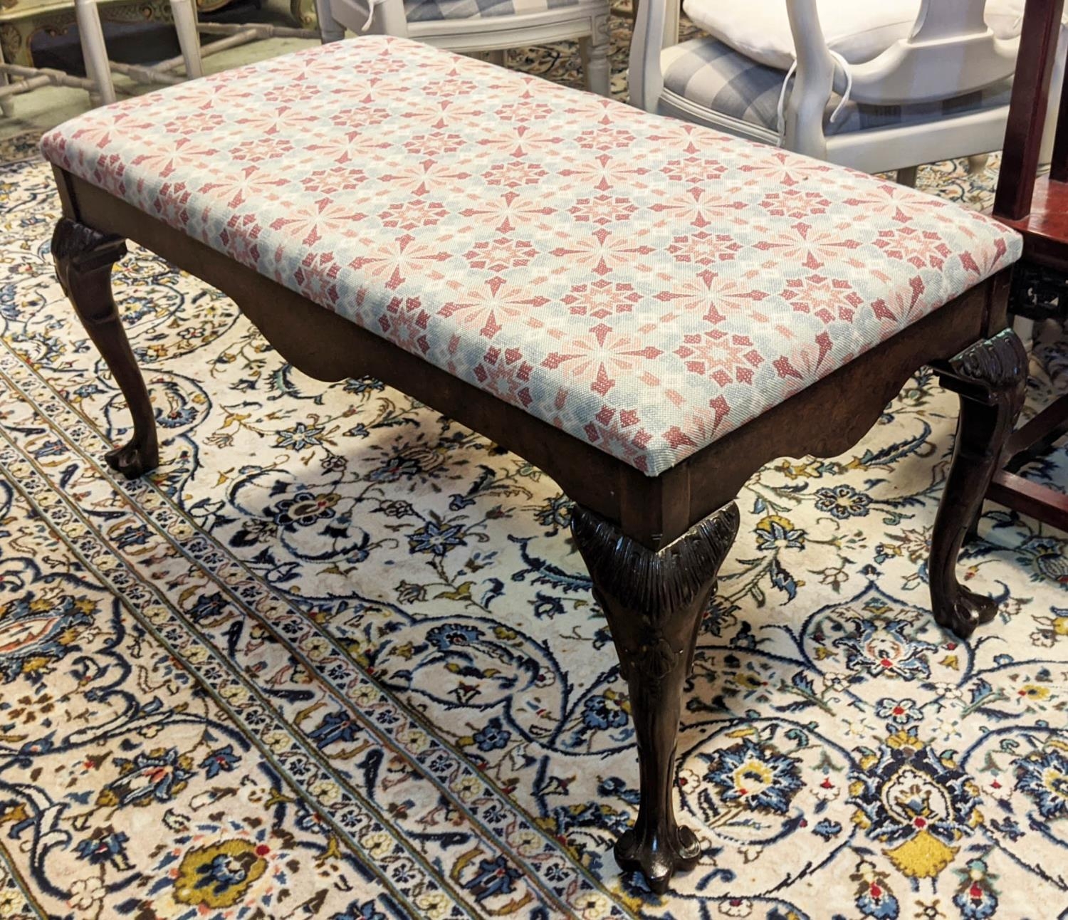 WINDOW SEAT, 50cm H x 102cm W x 52cm D, Georgian style walnut, with geometric upholstery.