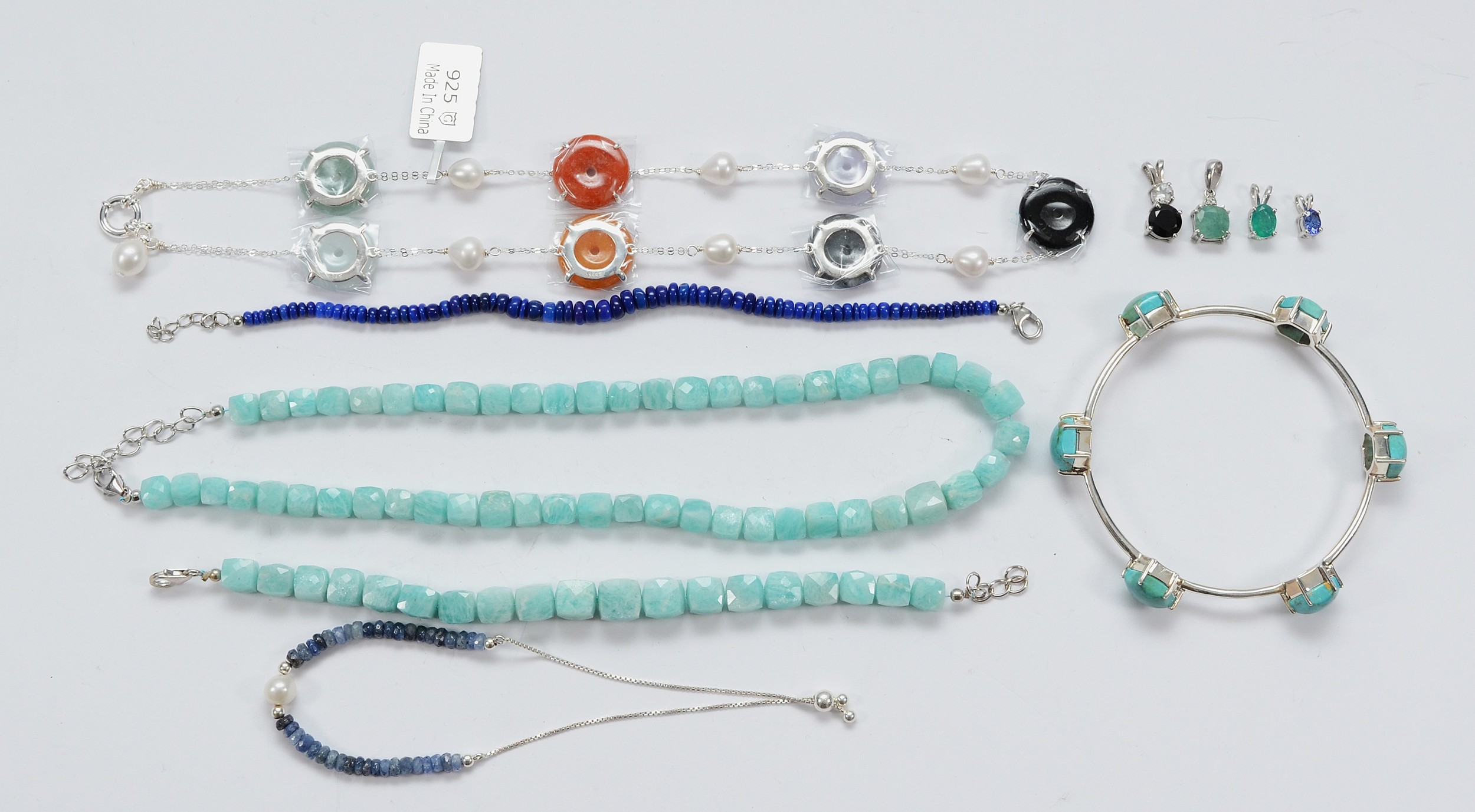 Two 925 silver necklaces, three 925 silver beaded braceletsm a 925 silver turquoise bangle, and four 925 silver gemset pendants, 132g