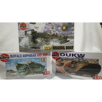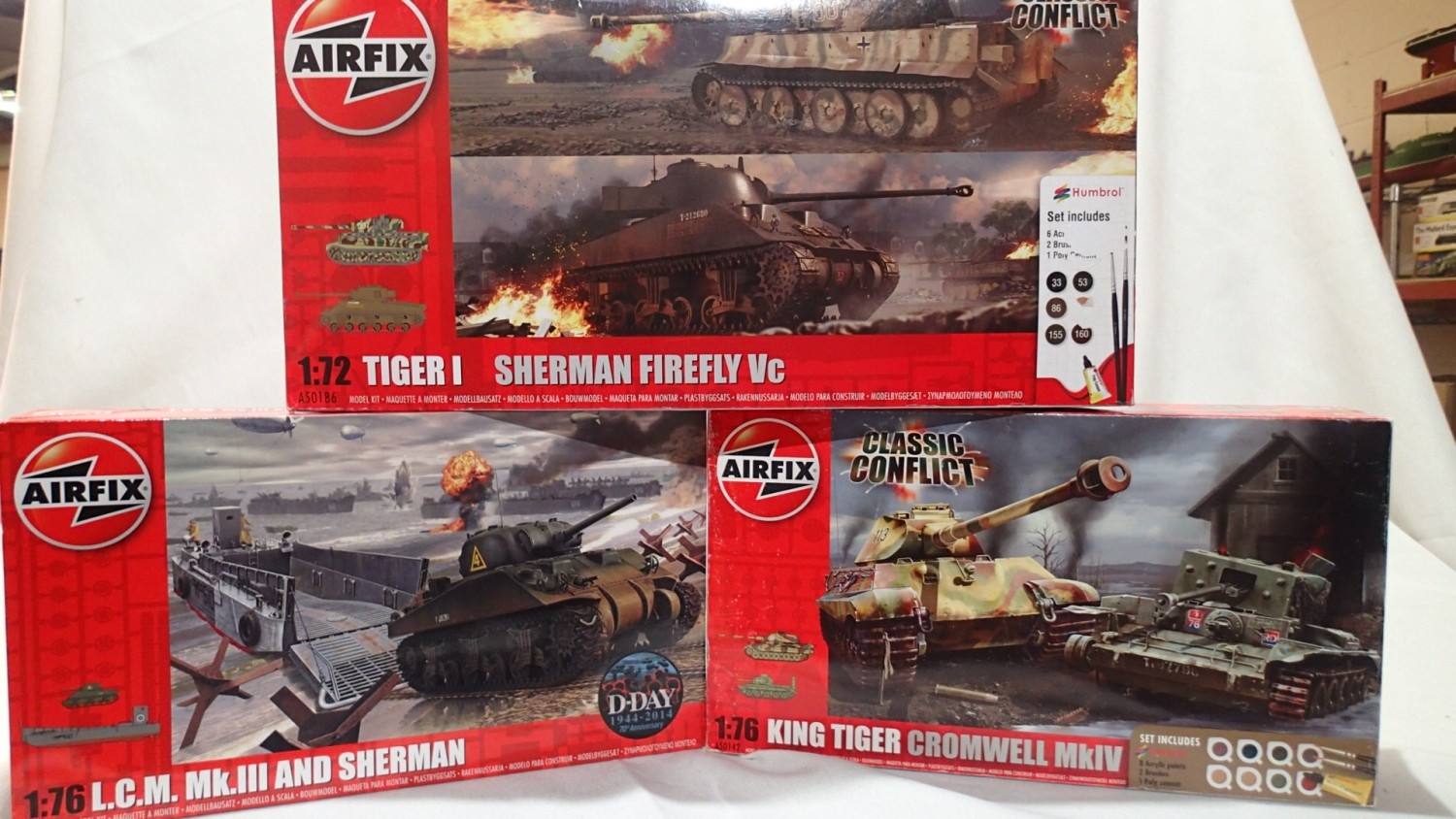 Three Airfix 1/72 and 1/76 scale military related, 2x vehicle kits. Tiger + Sherman, LCM + Sherman, King Tiger + Cromwell, appear new, unchecked. UK P&P Group 2 (£24+VAT for the first lot and £5+VAT for subsequent lots)