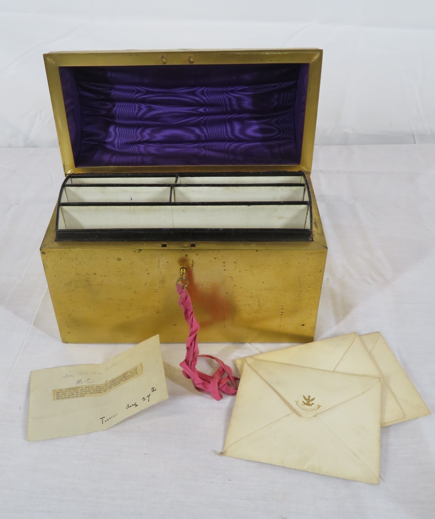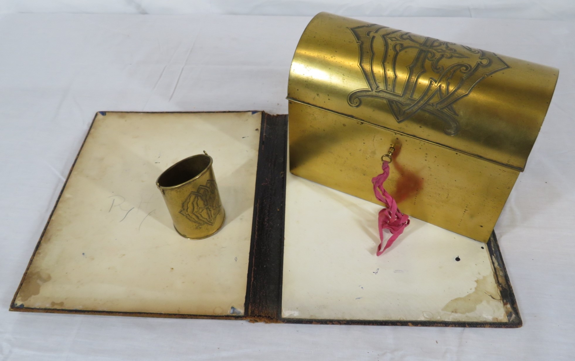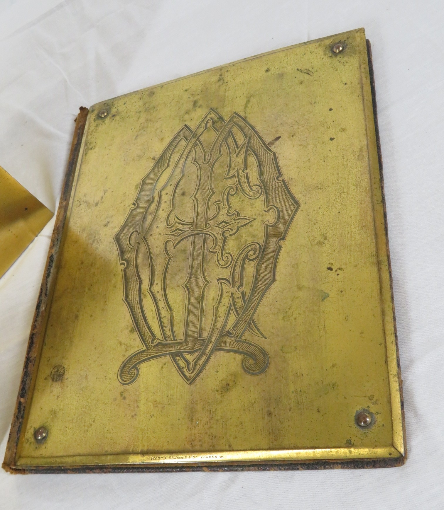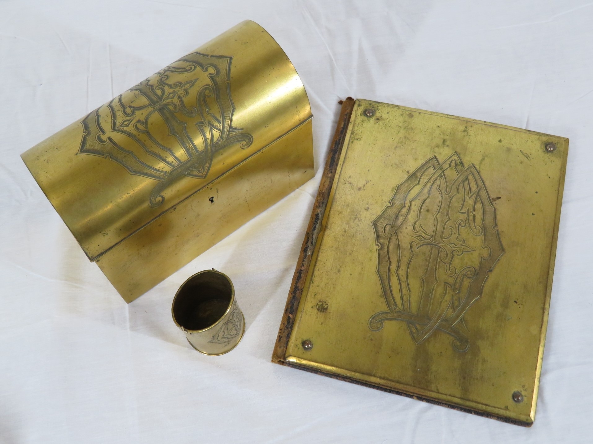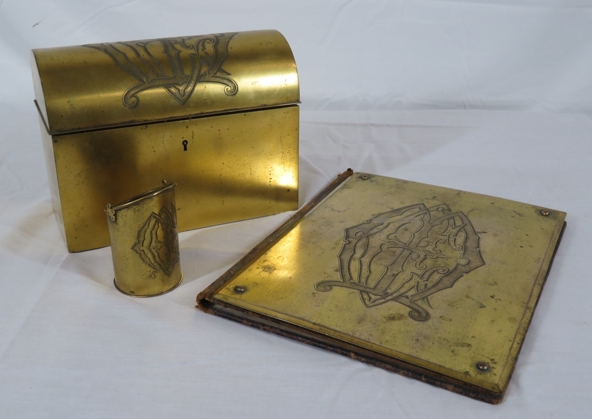 Edwardian style brass desk set with domed stationery box, pad and pen holder, with heraldic decoration by Fitzmaurice West 1 St James's St London, active 1841-82, Very high end items by Royal Appointment Paper Cutting Lt Clement G Mead MC