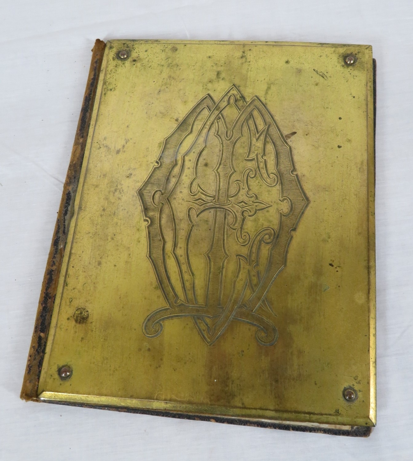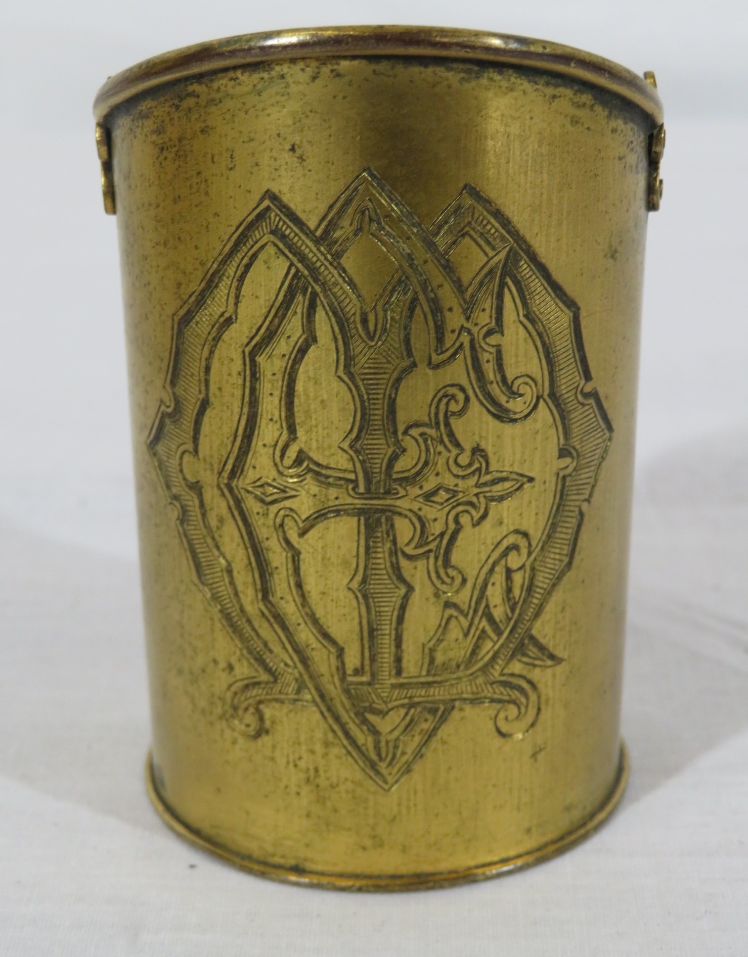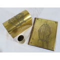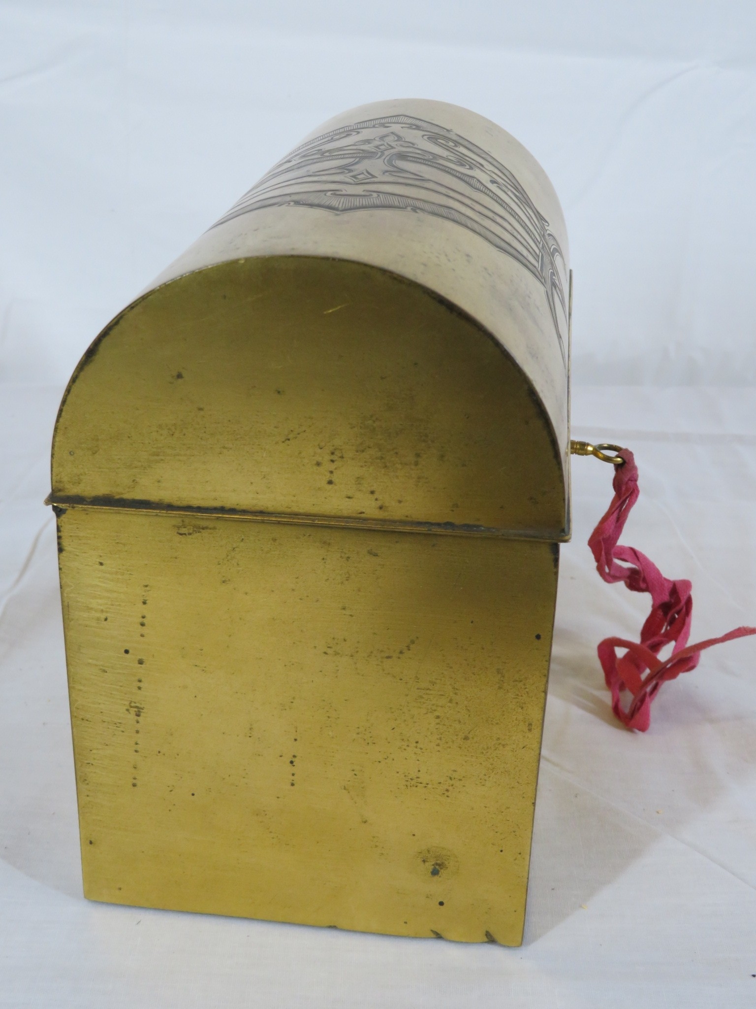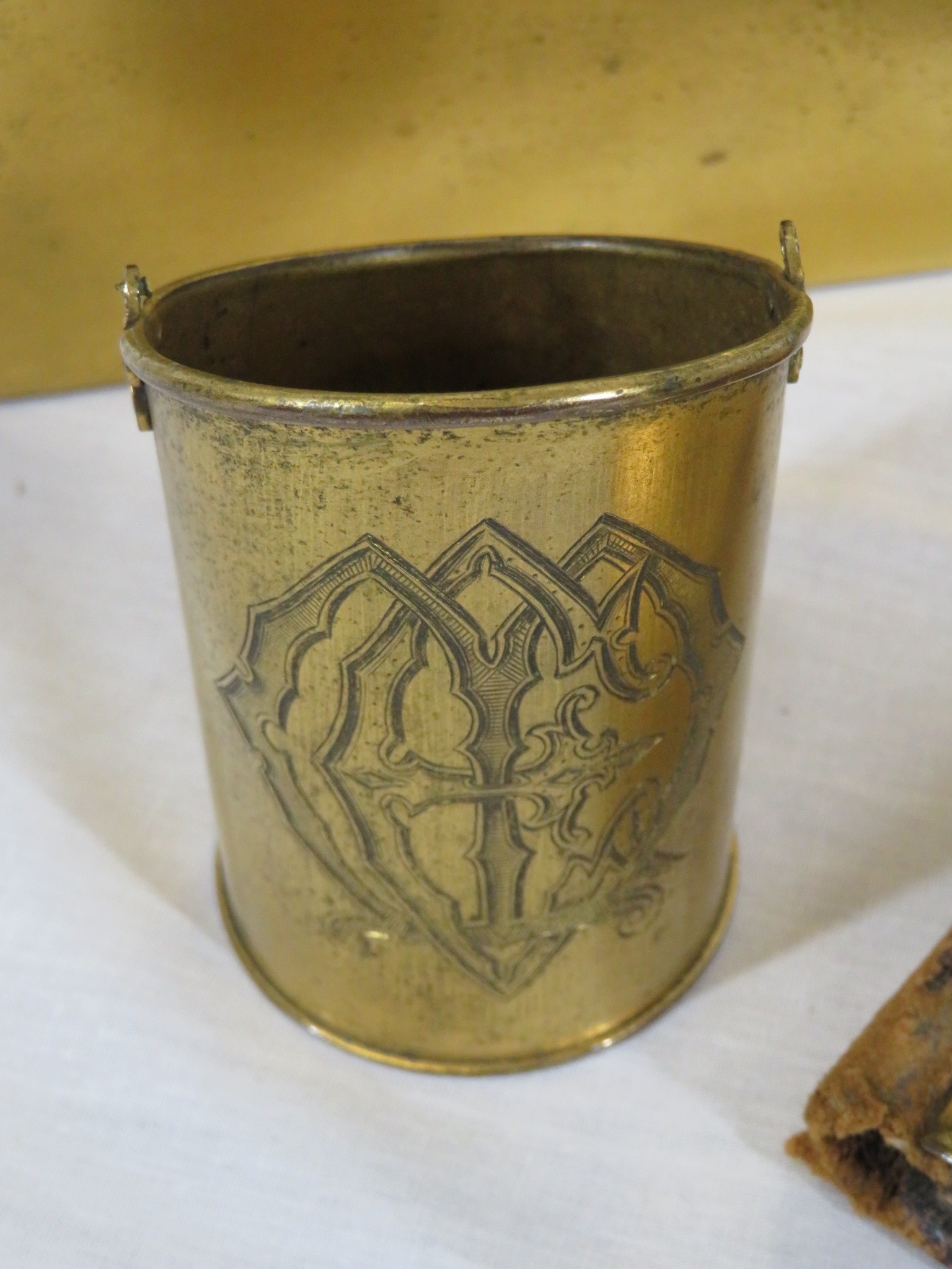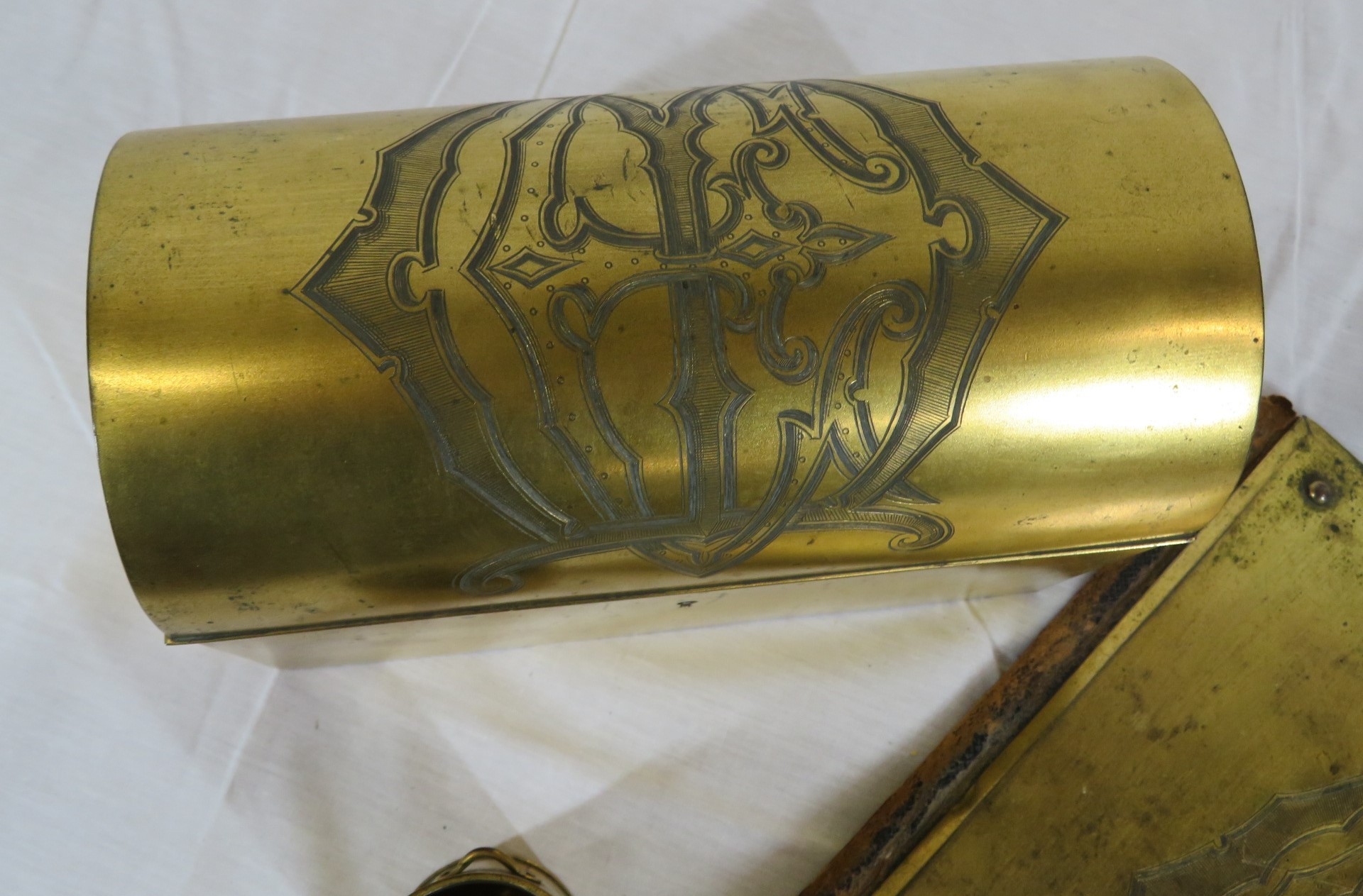 Edwardian style brass desk set with domed stationery box, pad and pen holder, with heraldic decoration by Fitzmaurice West 1 St James's St London, active 1841-82, Very high end items by Royal Appointment Paper Cutting Lt Clement G Mead MC