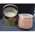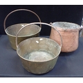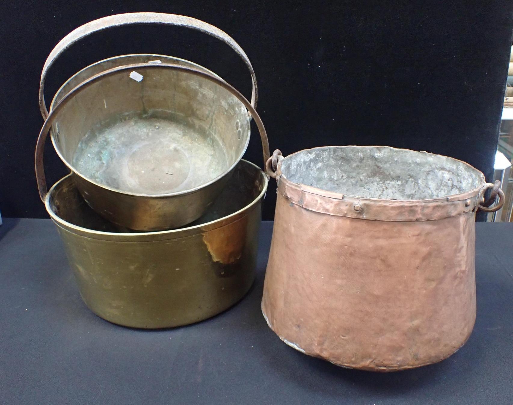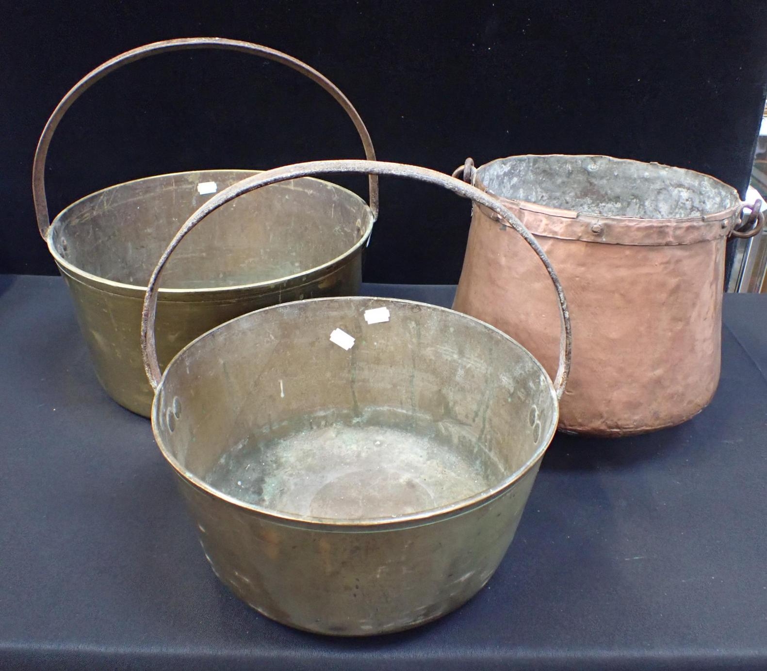 TWO HEAVY-GAUGE BRASS PRESERVING PANS with iron handles, and a copper bucket (old repair) (3)