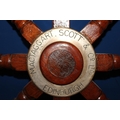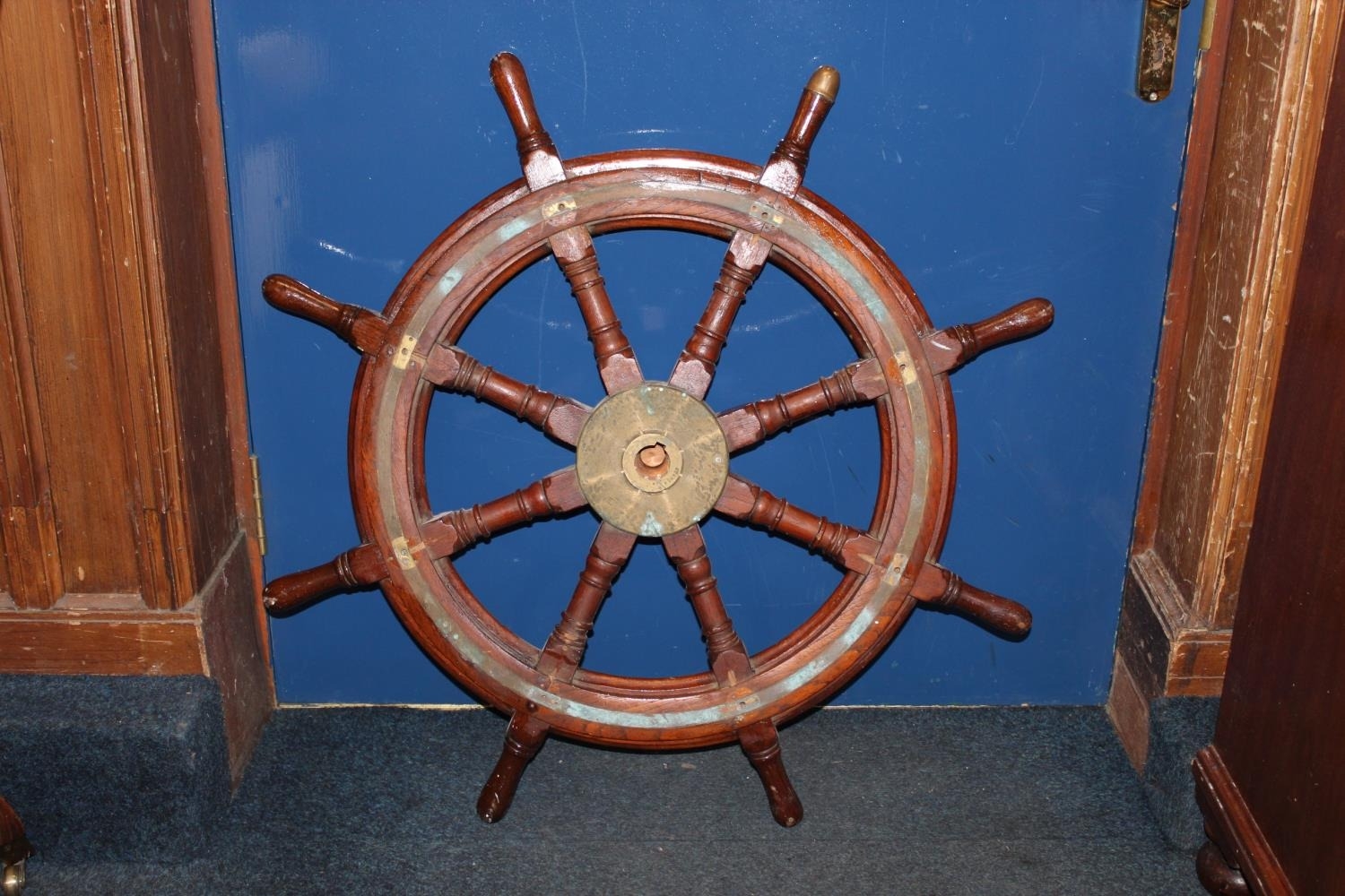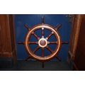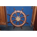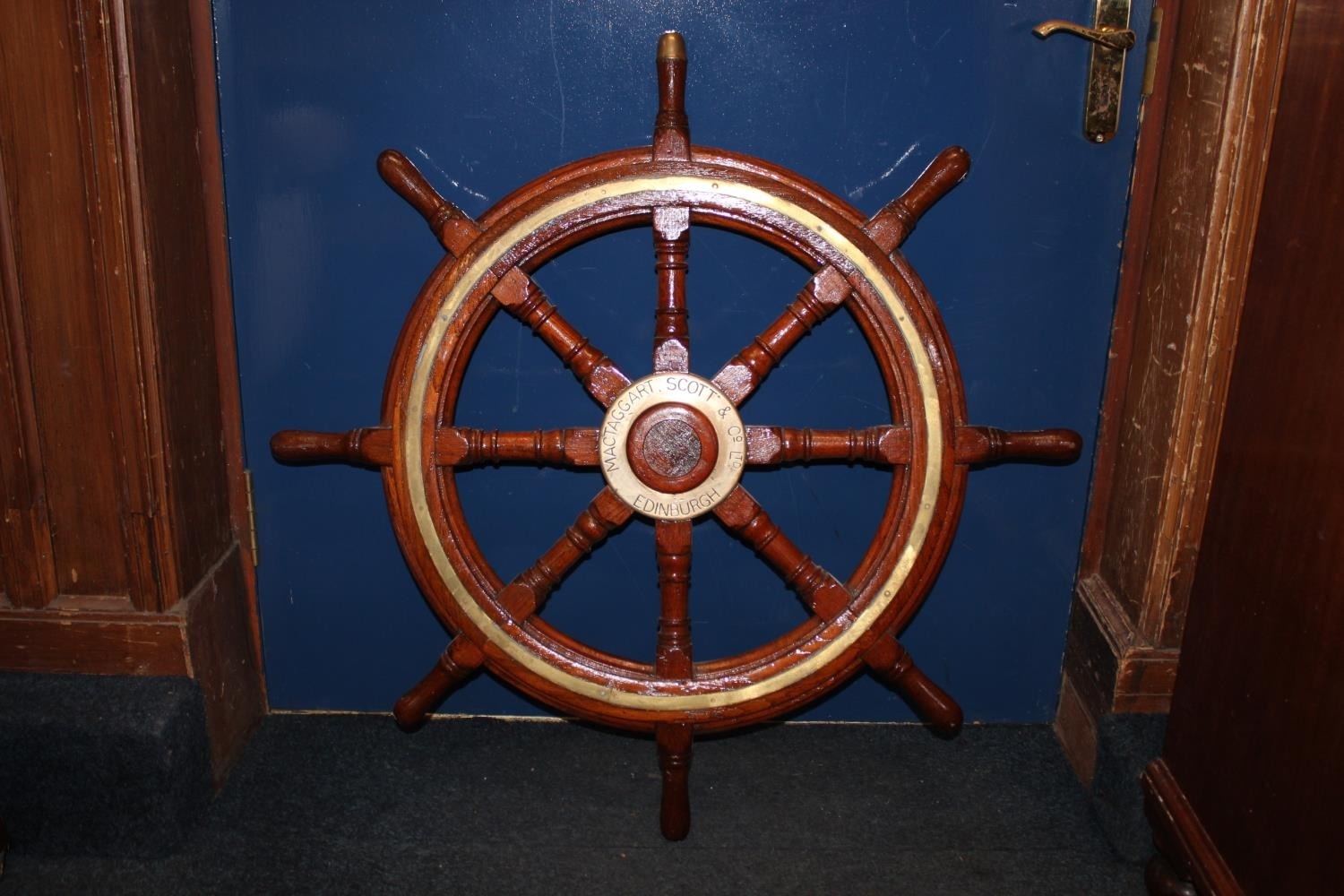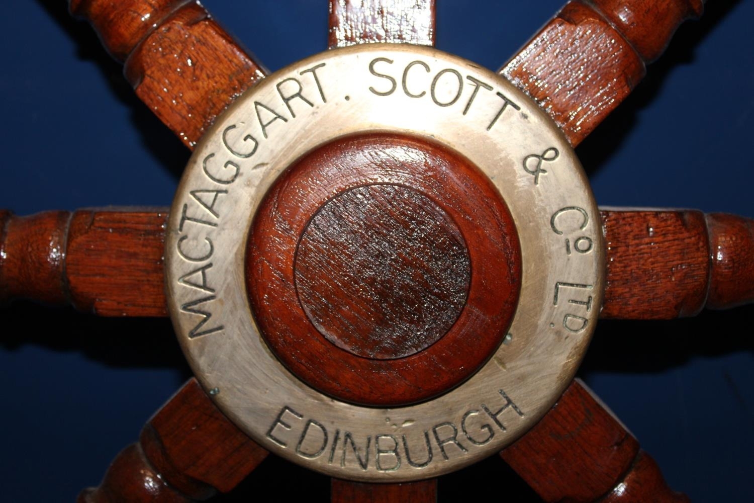 Ships wheel with brass central panel inscribed MacTaggart Scott and Co Ltd.