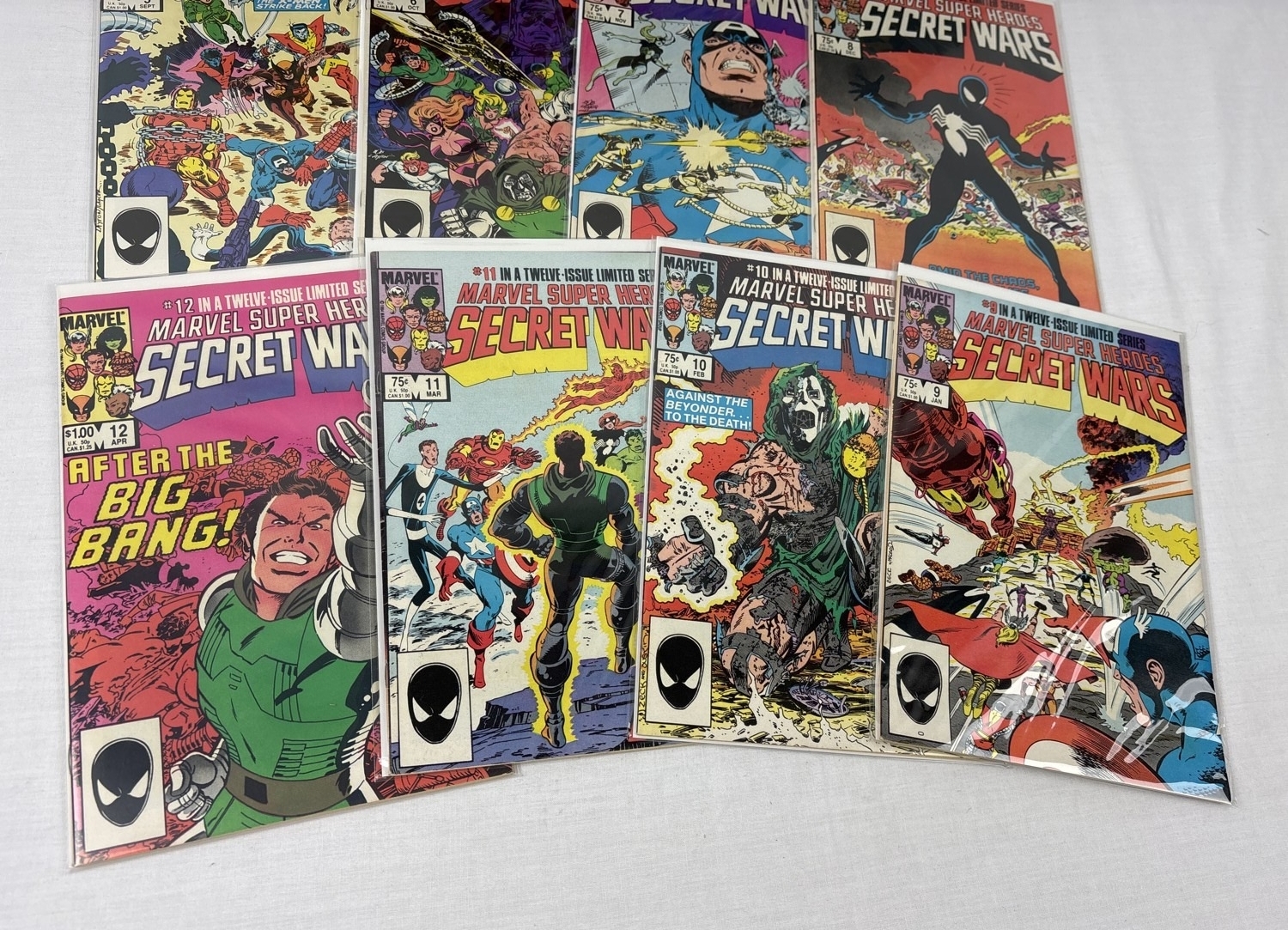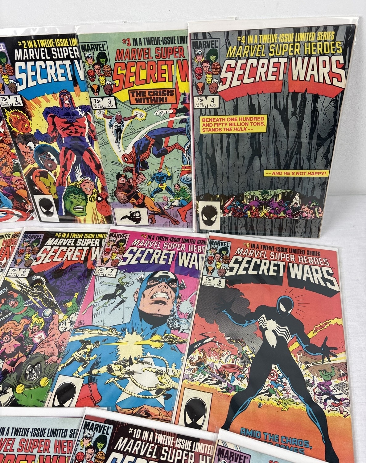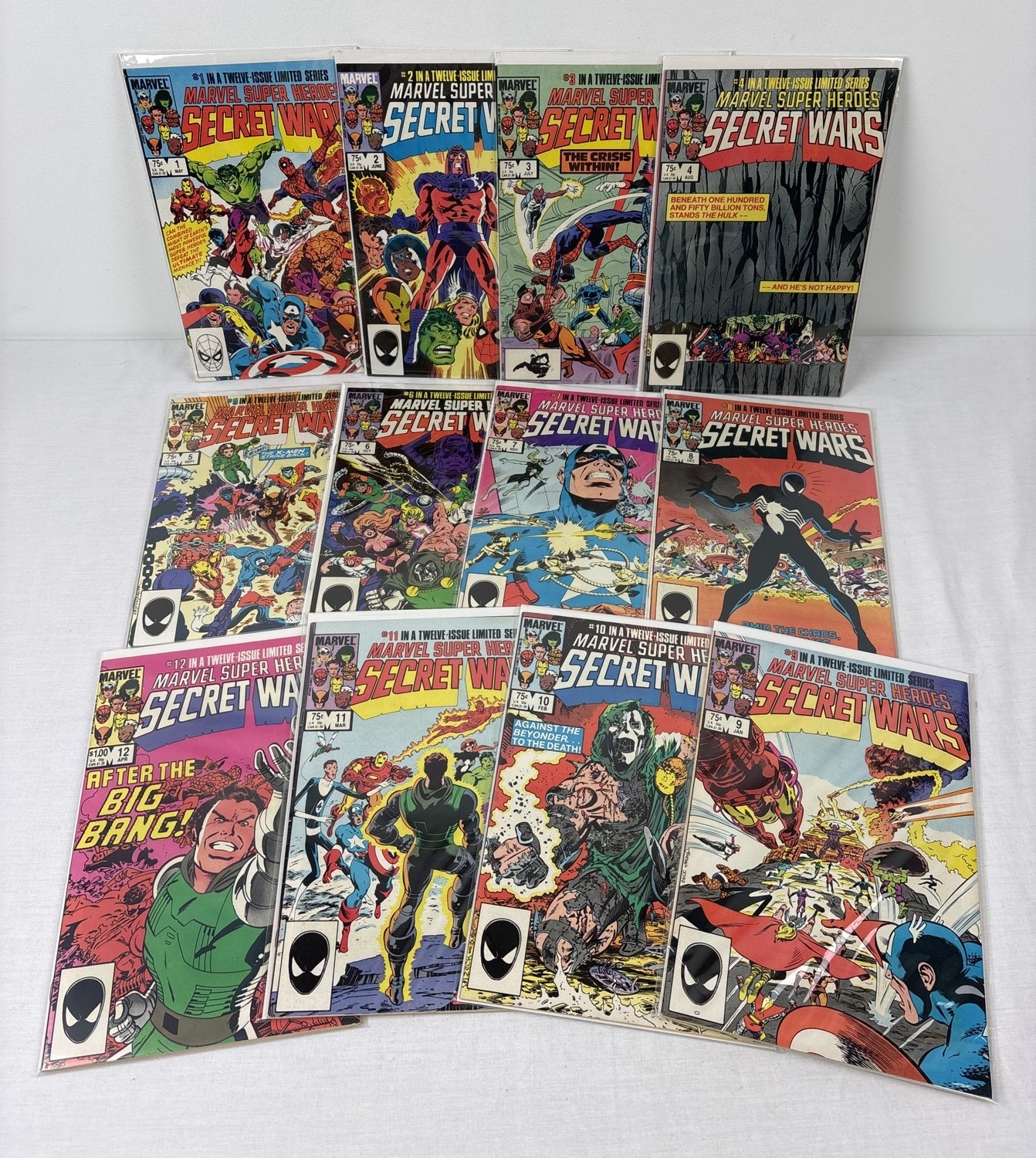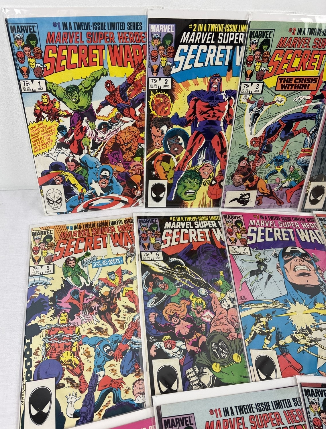 Complete set of Marvel Super Heroes Secret Wars comic book (original run). Comprising issues #1-12. By Marvel Comics, 1984. All issues bagged & carded.