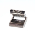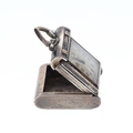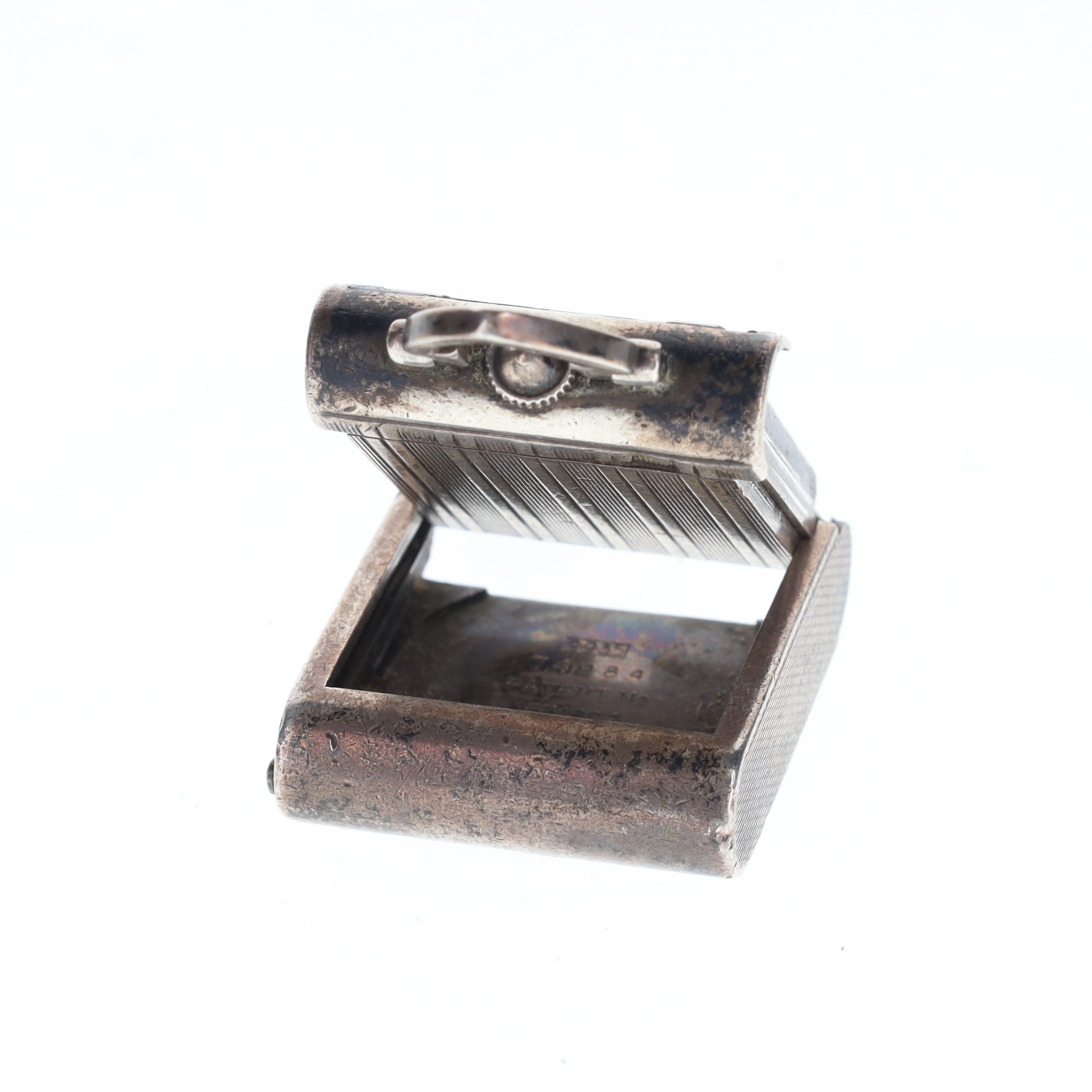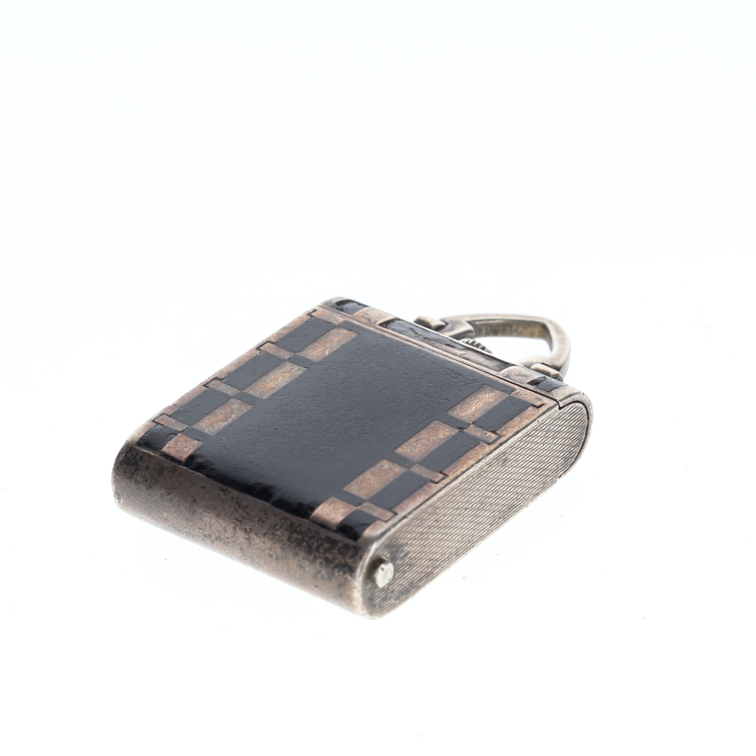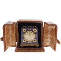 Case made from .935 silver. Glass crystal. Button activated sliding opening mechanism. Enamel in-lay design with engraved back. Watch is in full working order. No box or papers.
