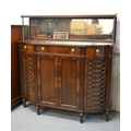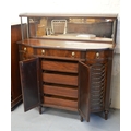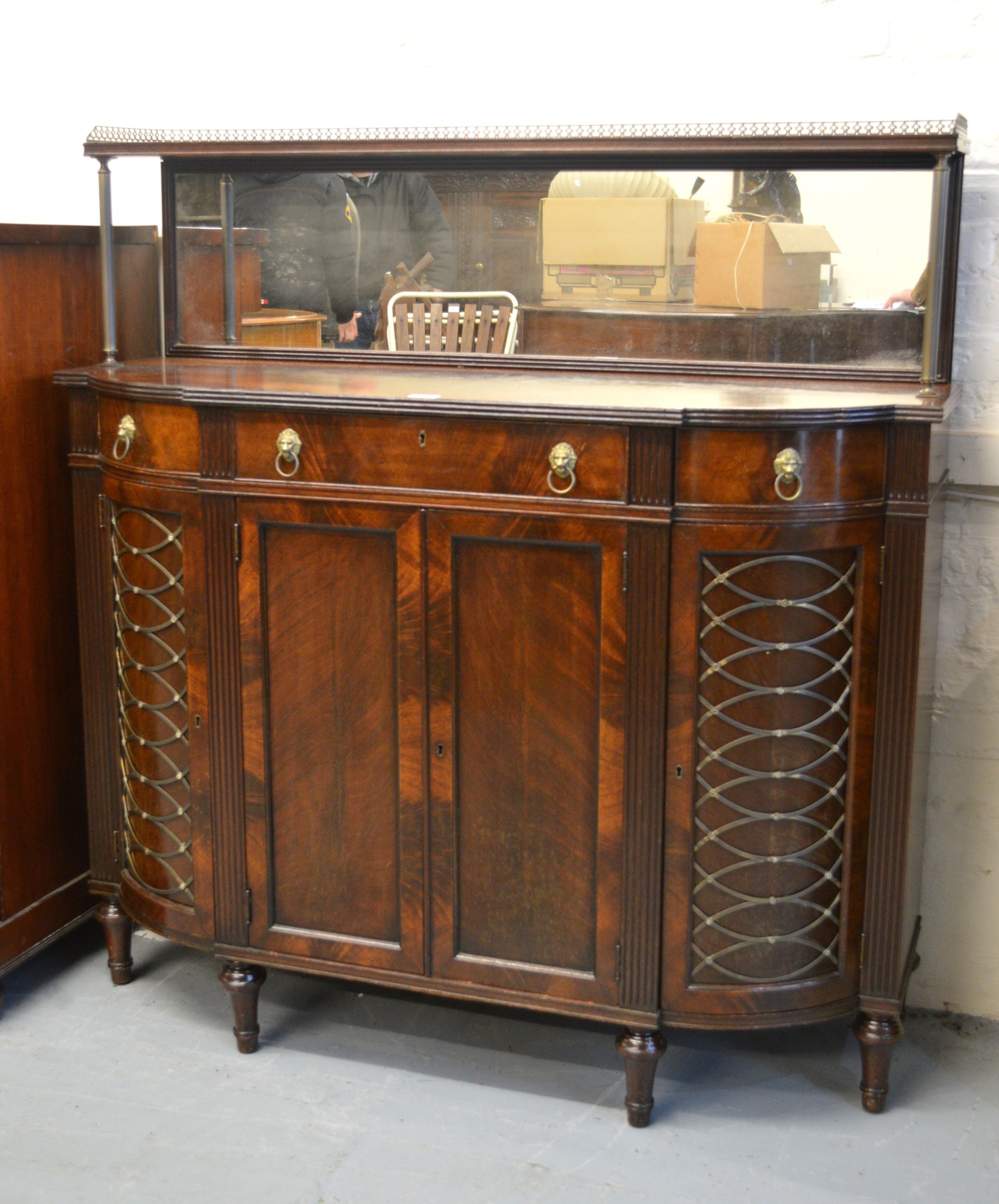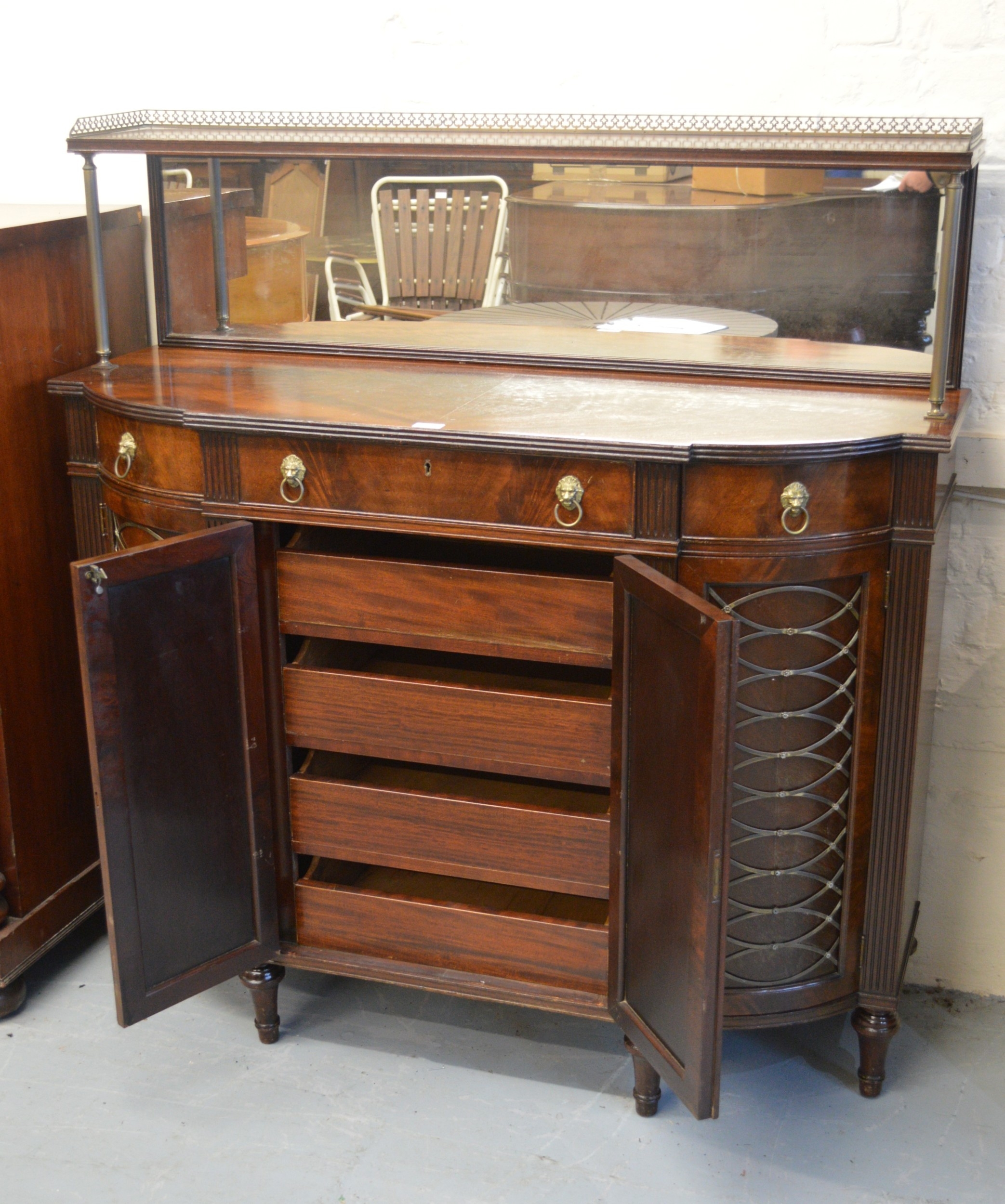 Reproduction mahogany semi bow fronted chiffonier in Regency style, the galleried mirror back above drawers and doors with brass grills raised on turned tapering supports, 127 x 46 x 134cm