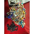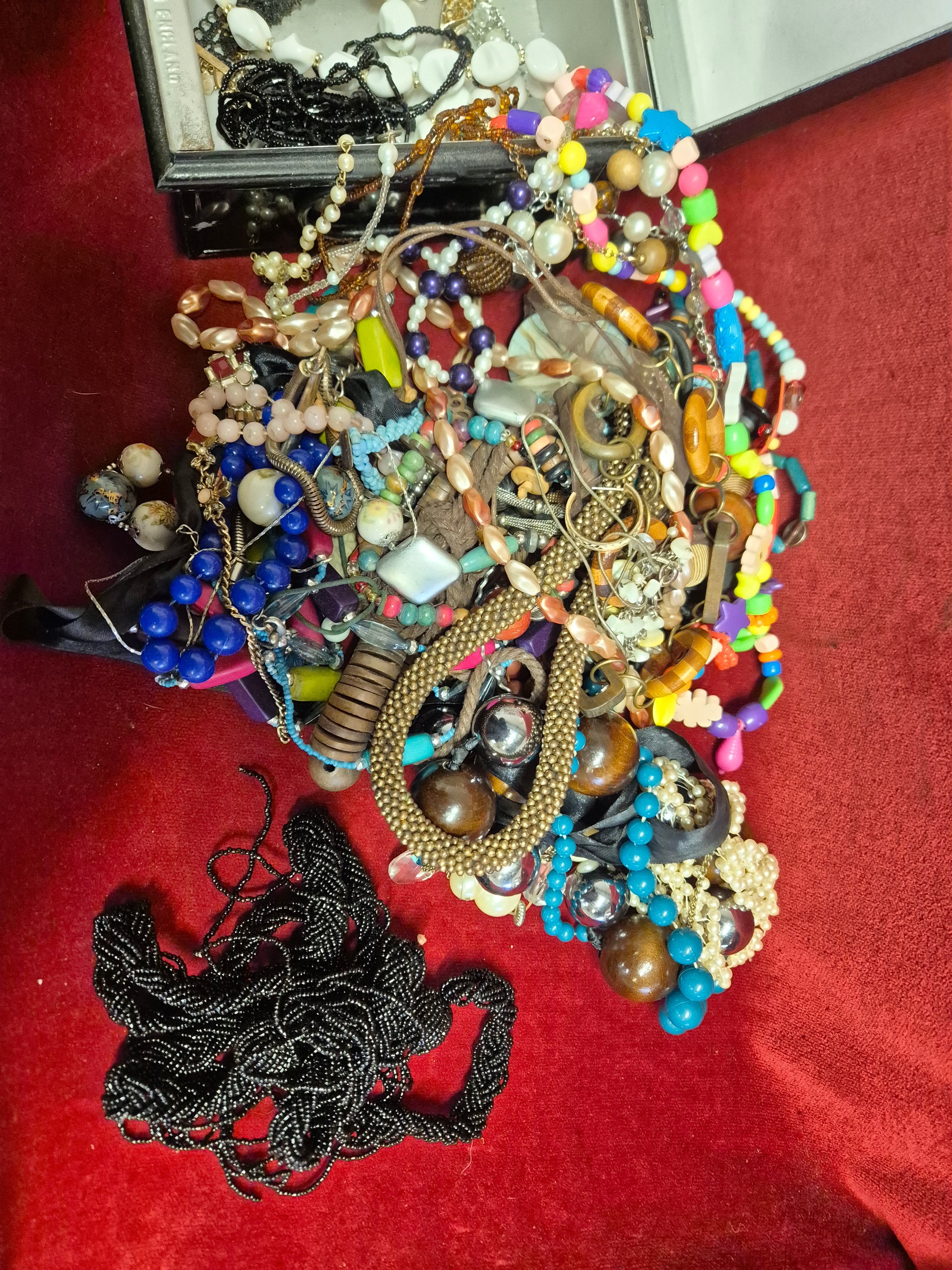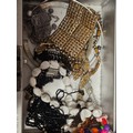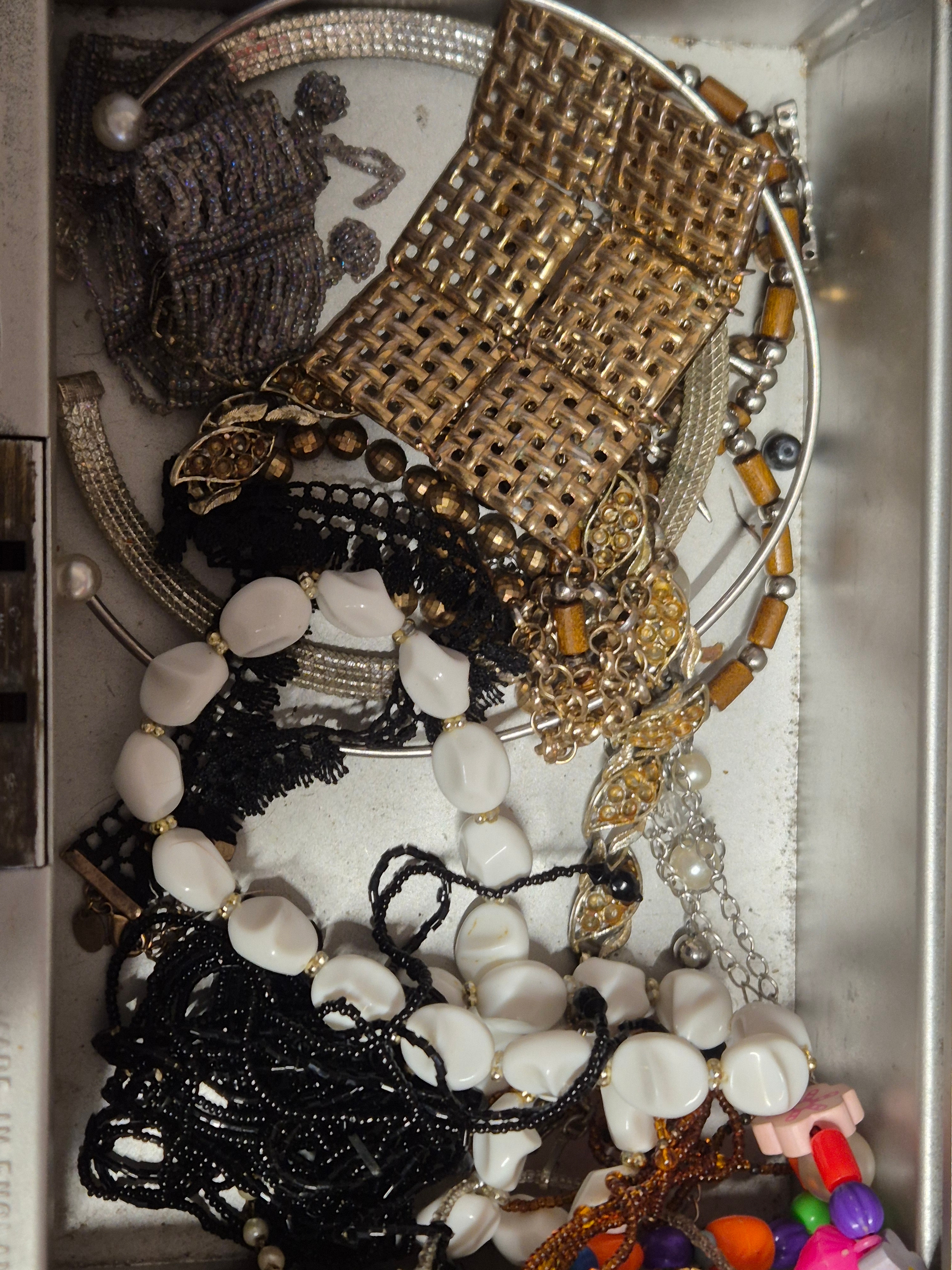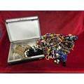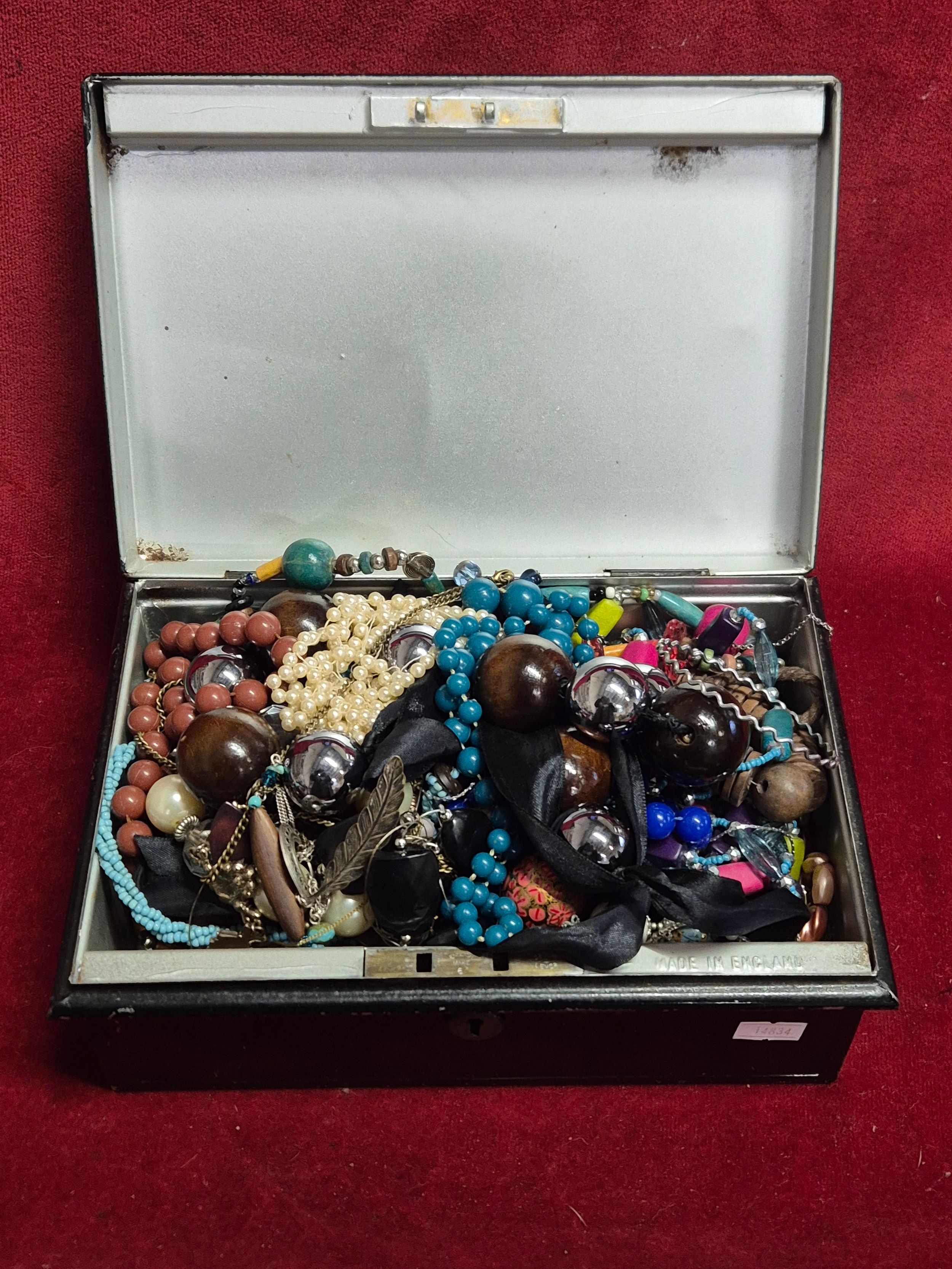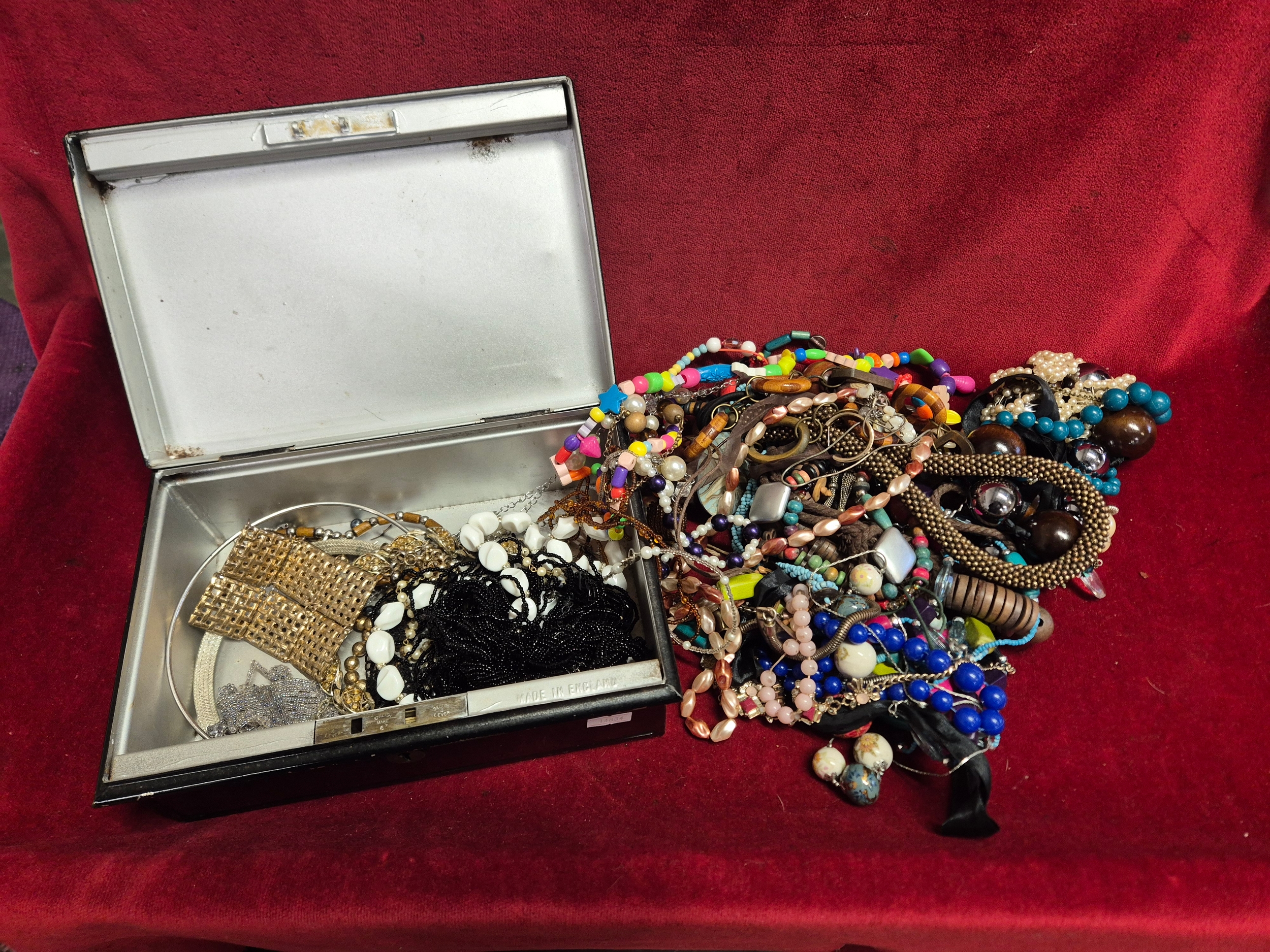 Vintage cash tin with contents of costume jewellery