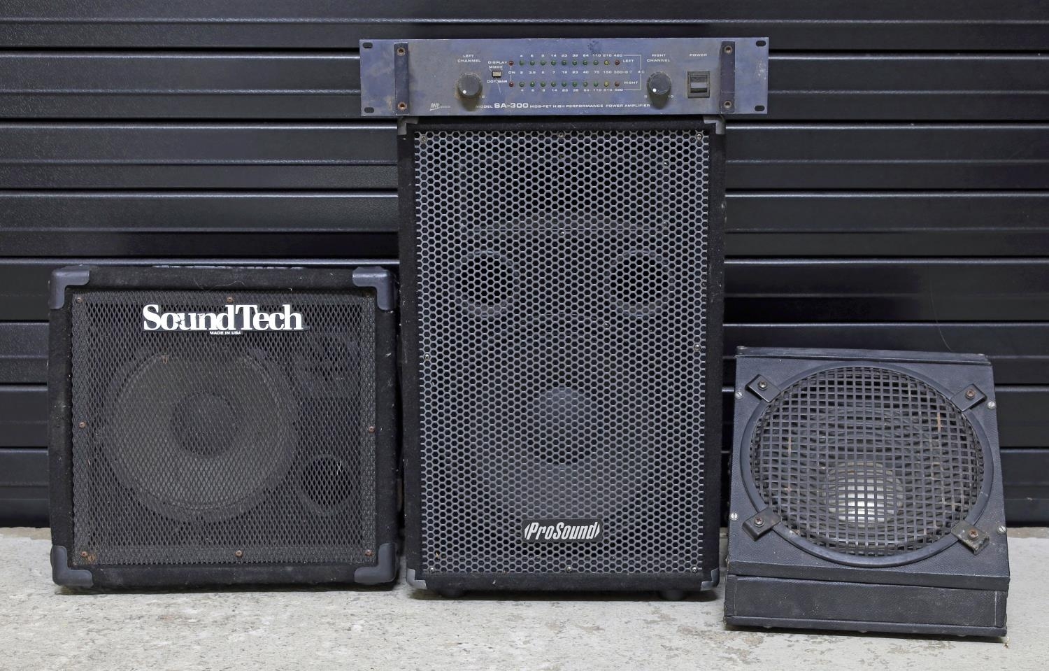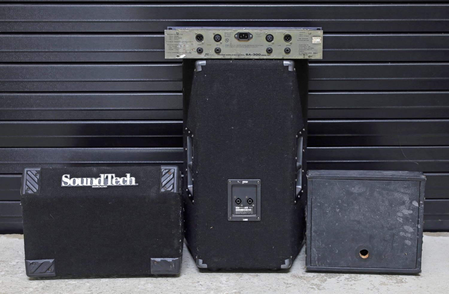 Anytronics Model SA-300 power amplifier; together with a ProSound PA speaker, a Sound Tech wedge monitor and one other (4)