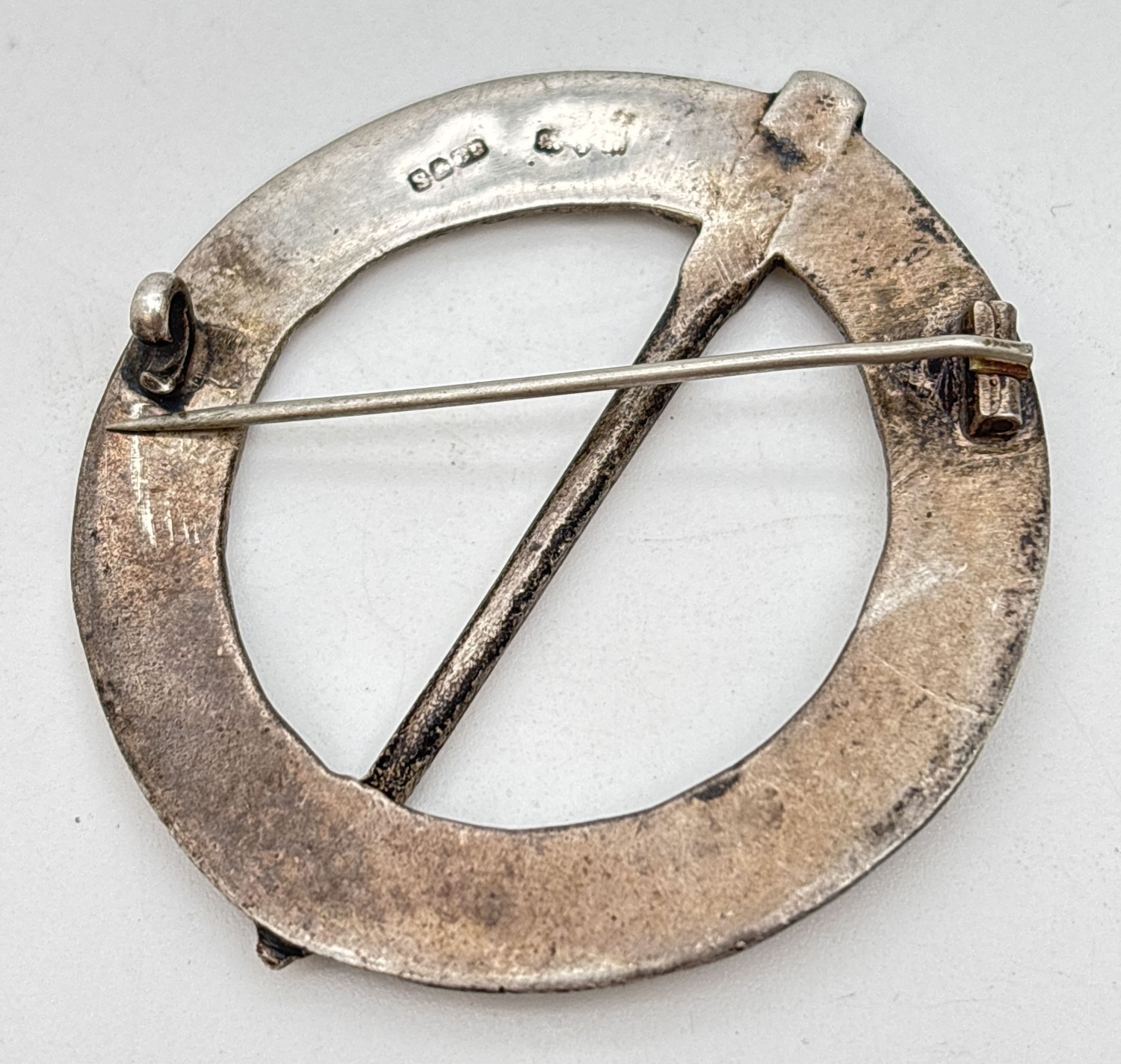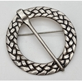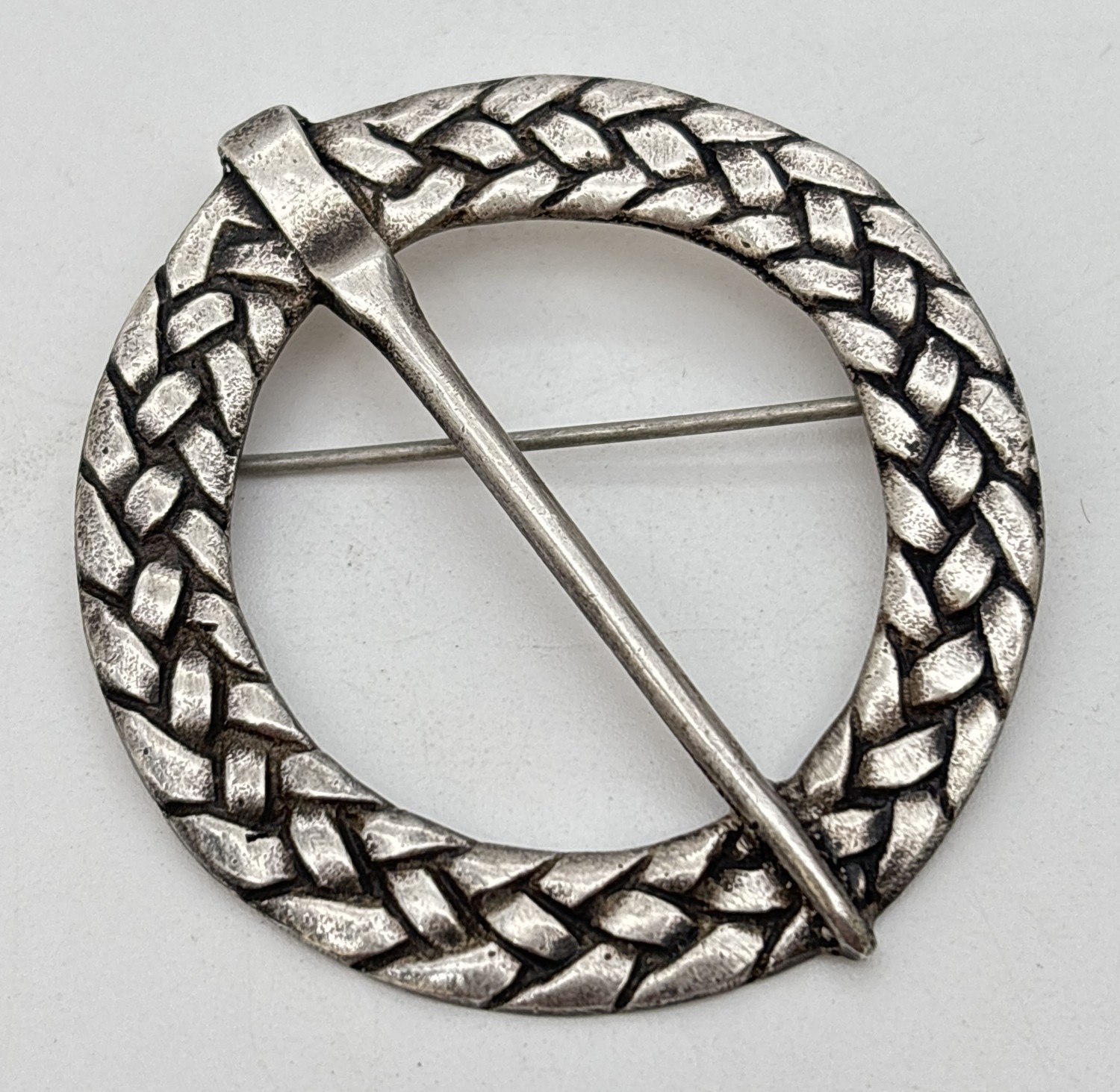 An antique silver circular Annular style brooch in a plaited design. Worn silver marks to back for Shipton & Co., Chester with indistinct date mark. Approx. 5cm diameter. Total weight approx. 14.2g.
