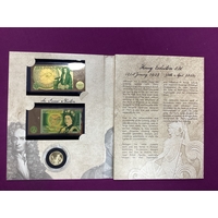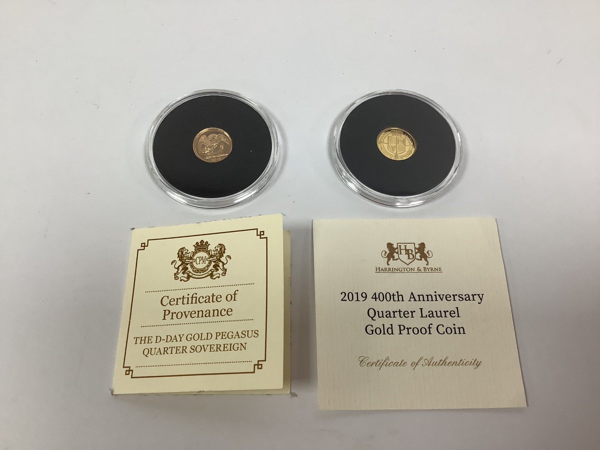 2019 400th Anniversary Quarter Laurel Gold Proof Coin, together with a 2019 D-Day gold proof quarter Sovereign, both encapsulated with certificates of authenticity.