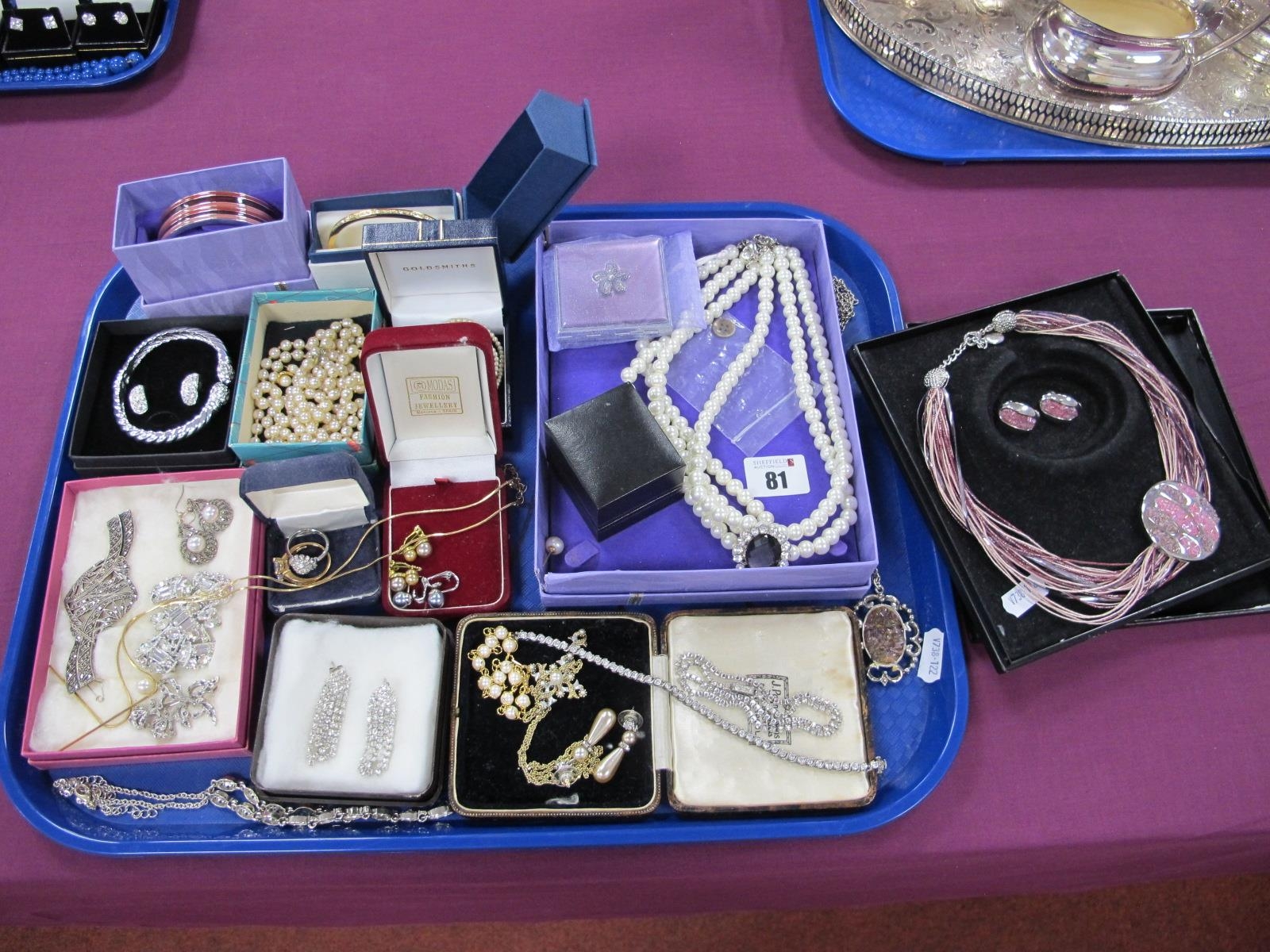 Imitation Pearl Bead Necklaces, diamanté, marcasite and modern costume jewellery including brooches, drop earrings, bracelets, bangles, etc, with boxes :- One Tray
