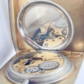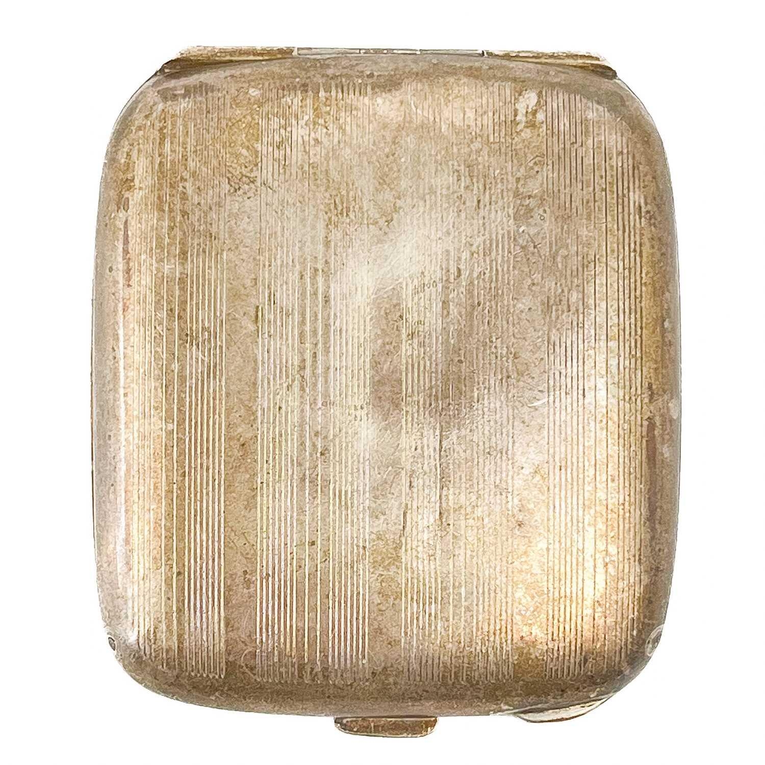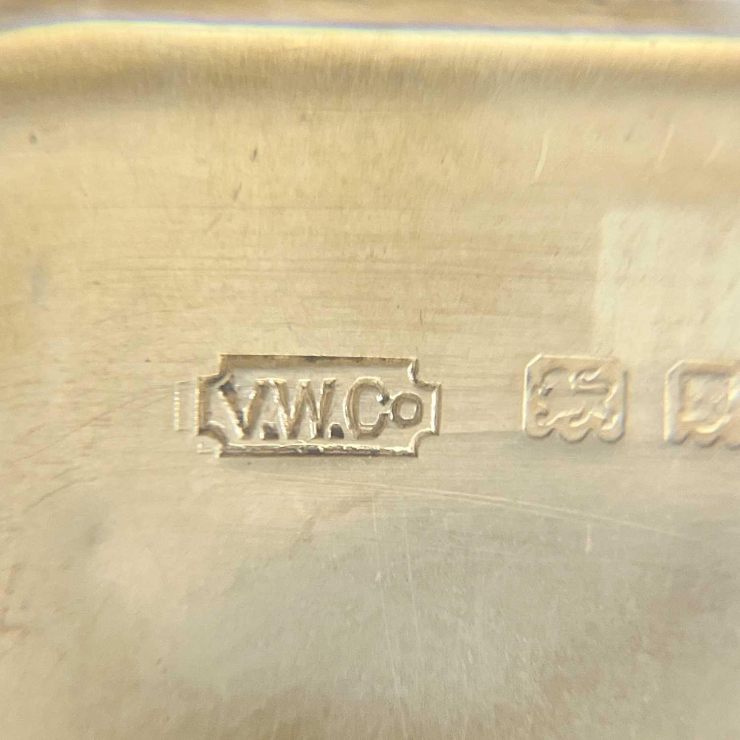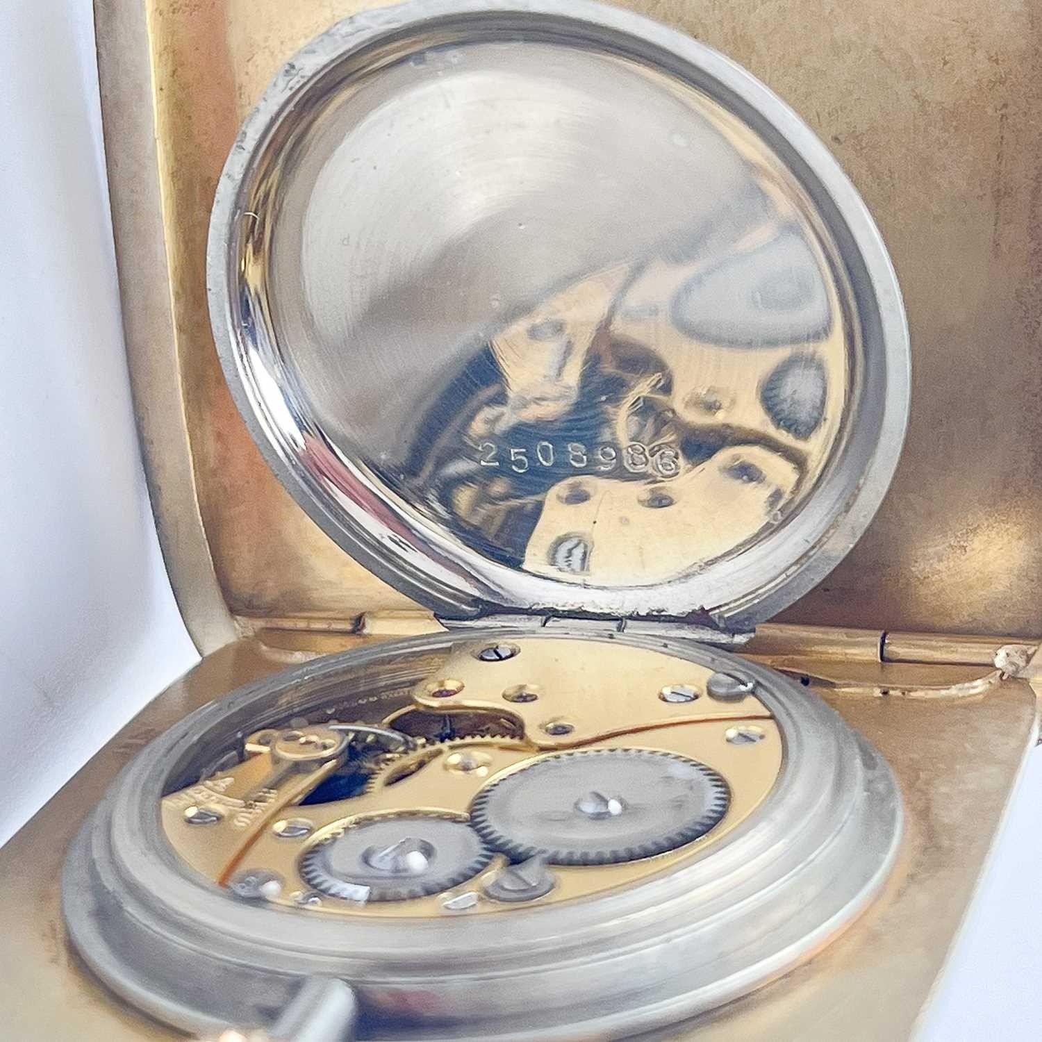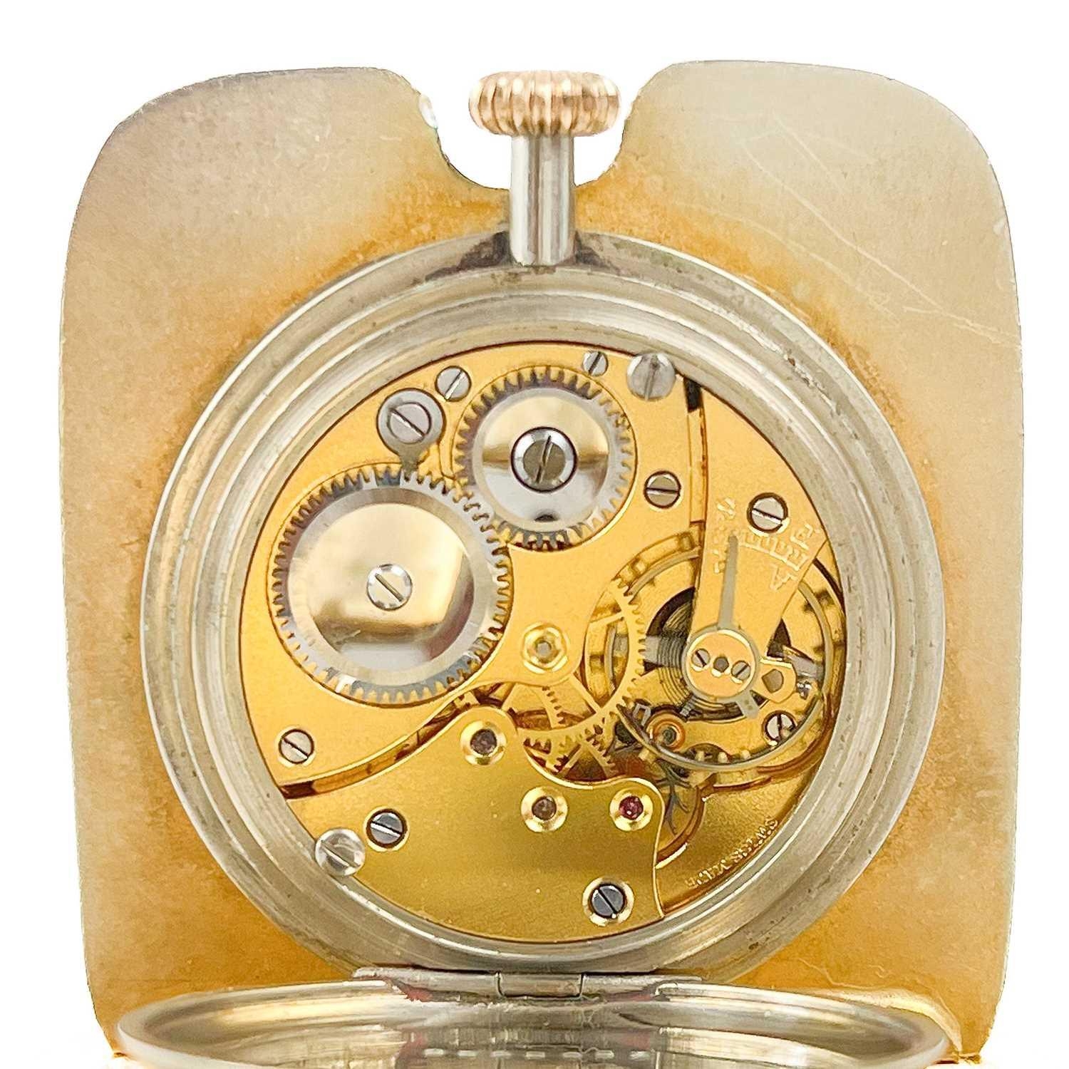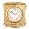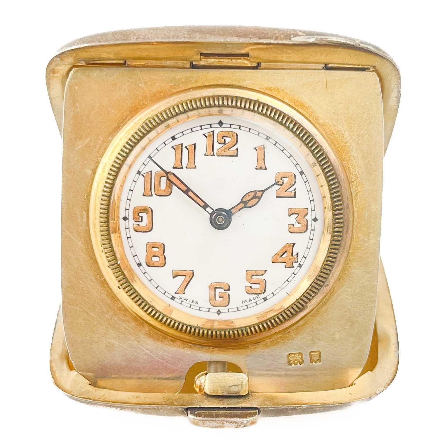 A silver engine turned manual wind travel watch. The 25mm white dial with luminous Arabic numerals and luminous hands, unsigned manual wind movement, the engine turned folding case by maker V.W Co London 1927, gilt interior, case length 53mm.