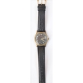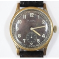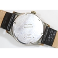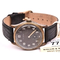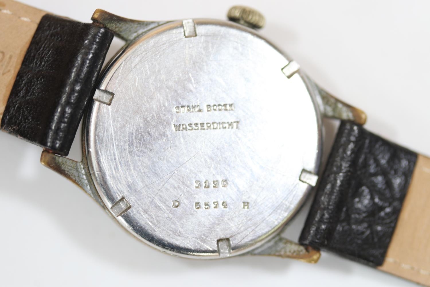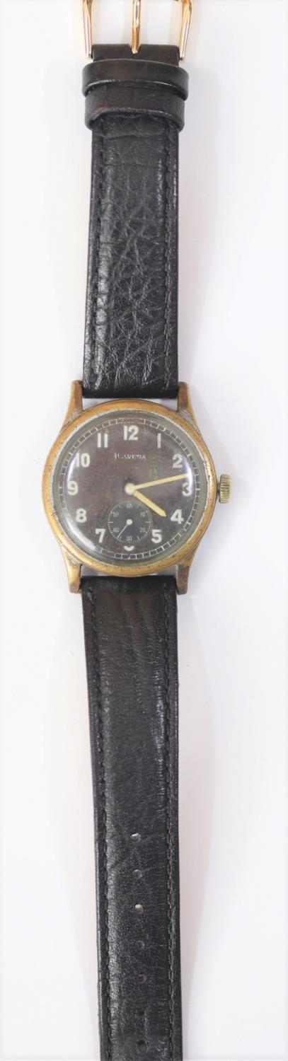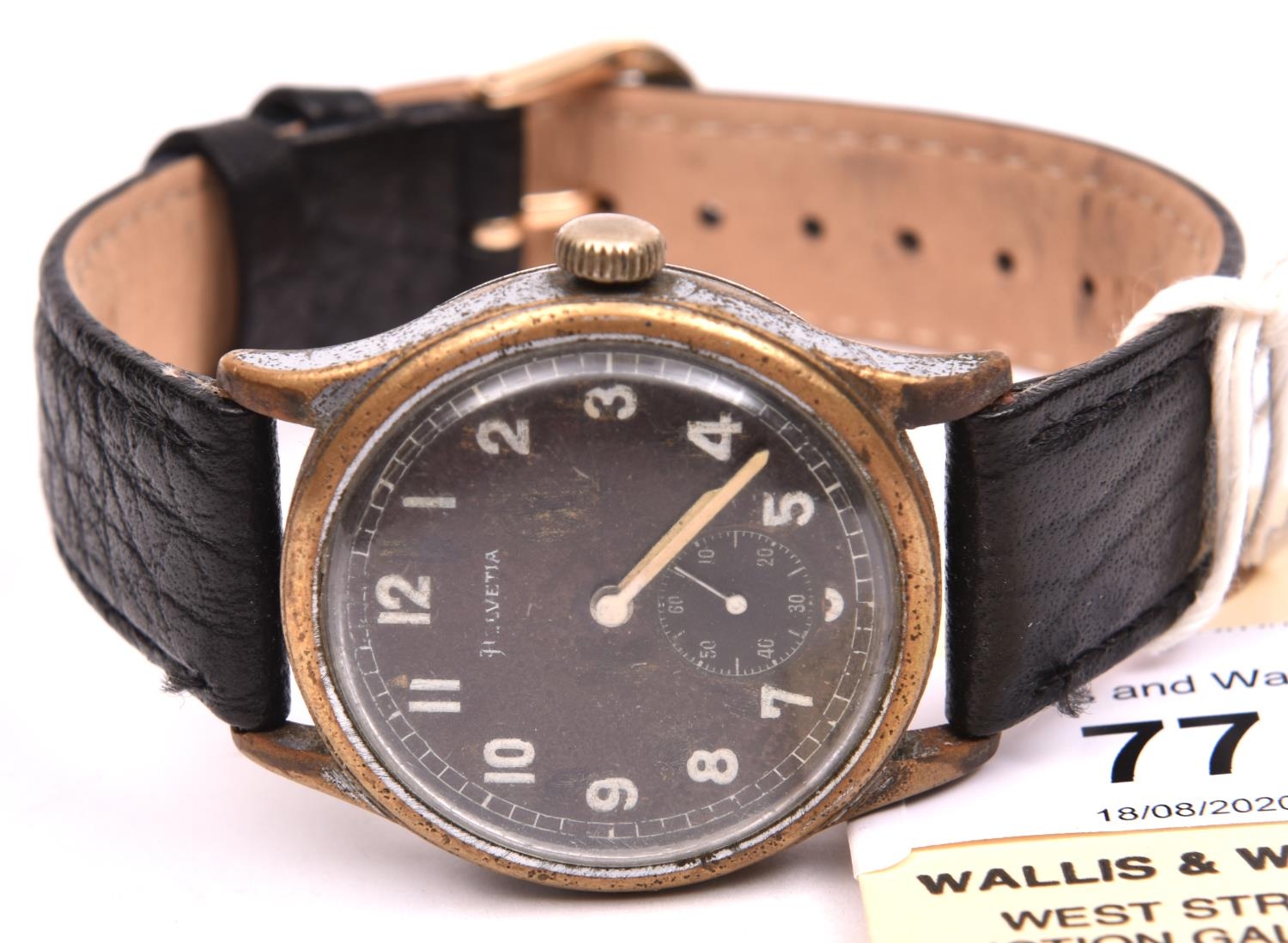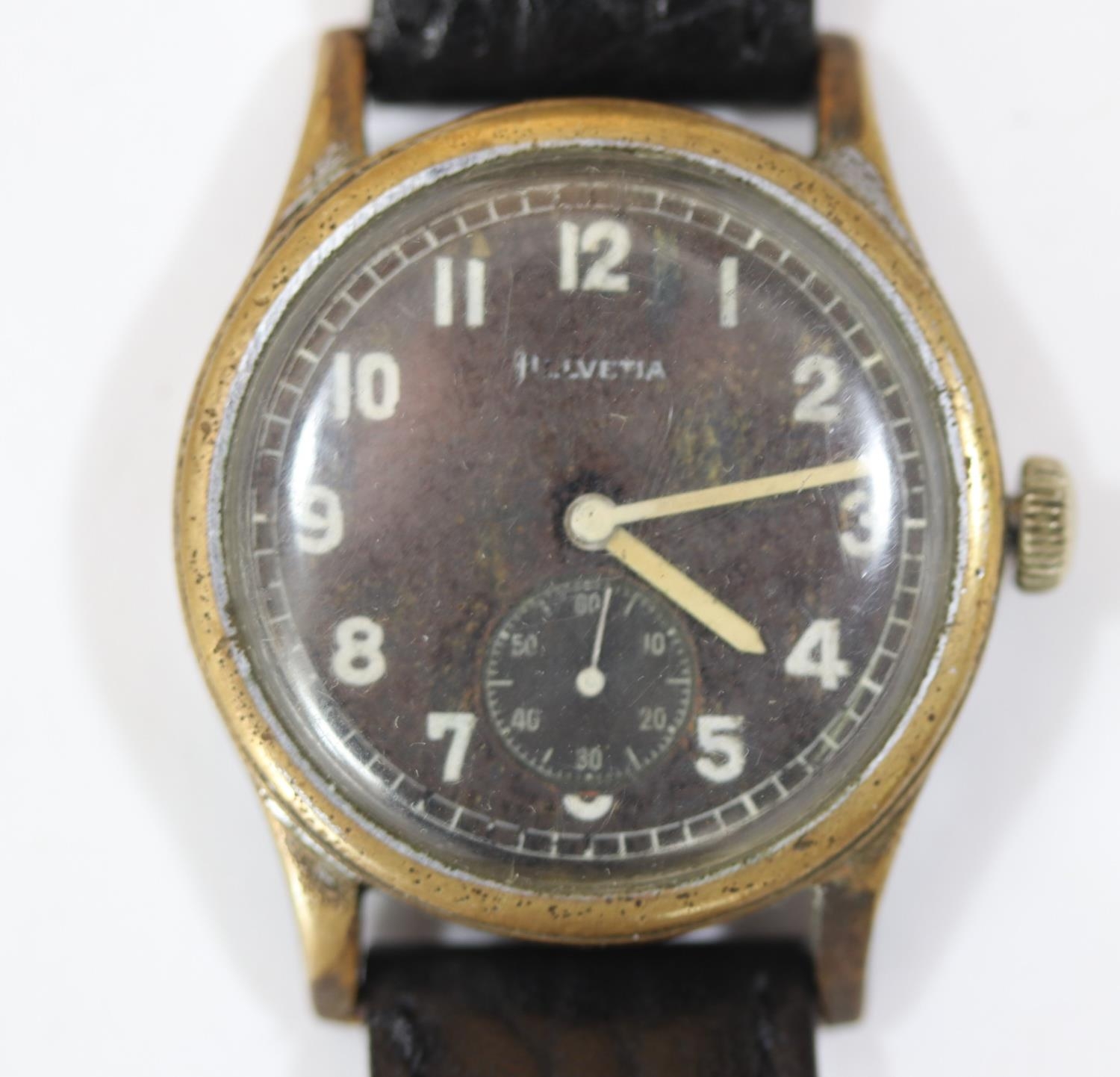 DH marked Helvetia wristwatch. Serial D6594H. Plated case with brushed finish, heavy wear to plating, 33mm not including crown. Fixed bars. Screw caseback marked with serial, “Stahlboden, Wasserdicht” and 3190. Black dial is discoloured. Luminous material stripped from hands and dial markers, hands have a white painted finish. Movement is marked Helvetia 82A on ratchet wheel, in running condition. Original movement retaining ring present. QGC