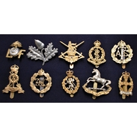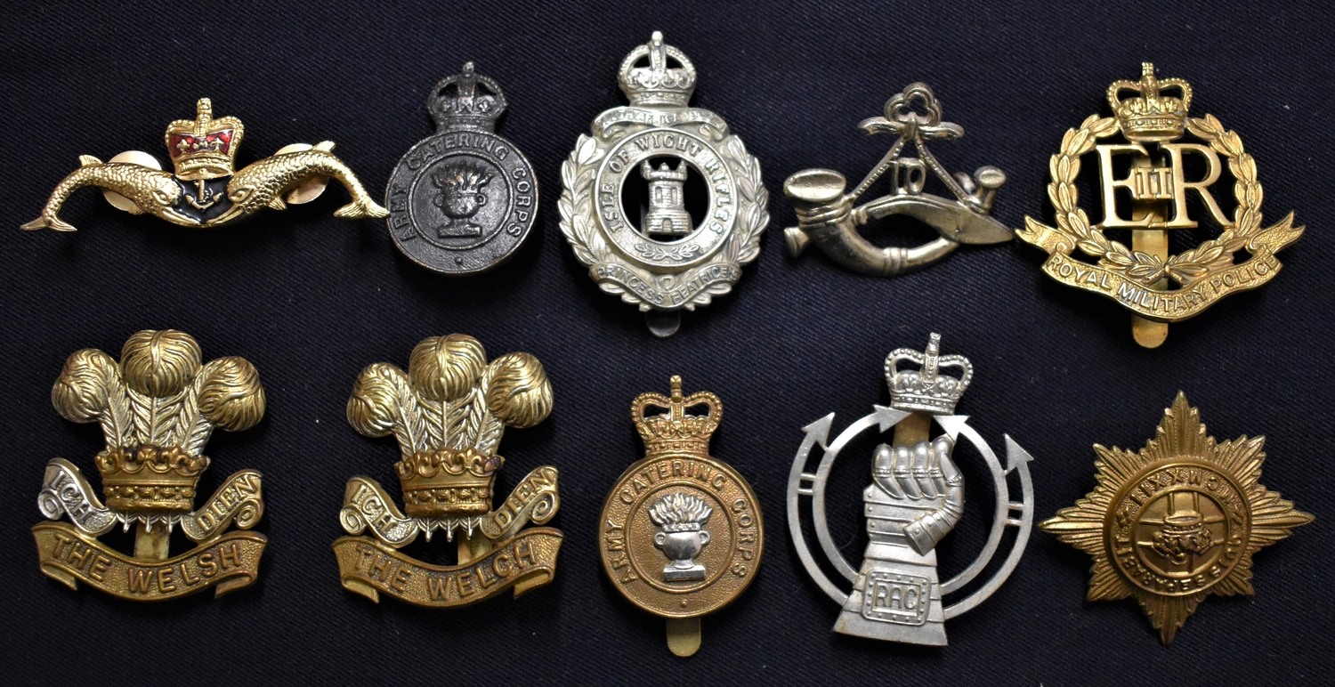 British Military Cap Badges (10) including: Army Catering Corps, RAC, Isle of Wight Rifles, Royal Military Police, The Welsh and Welch, Submarine Service etc.