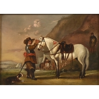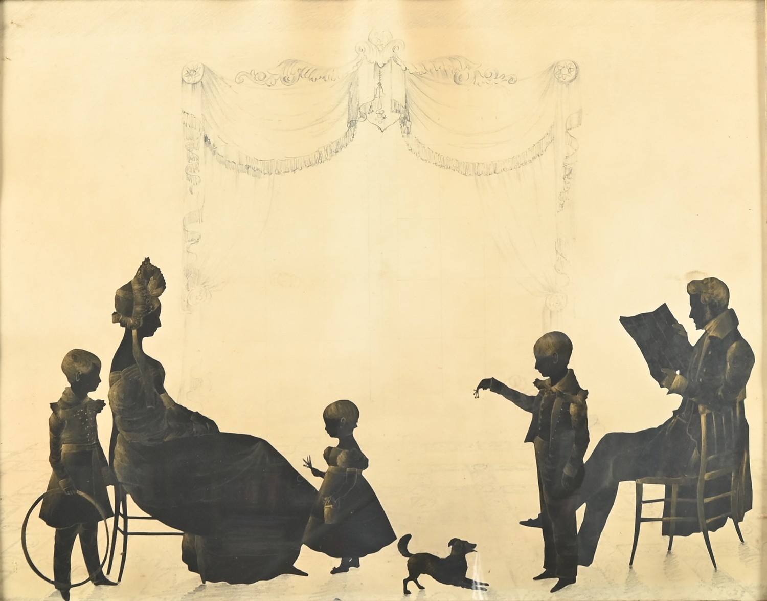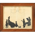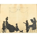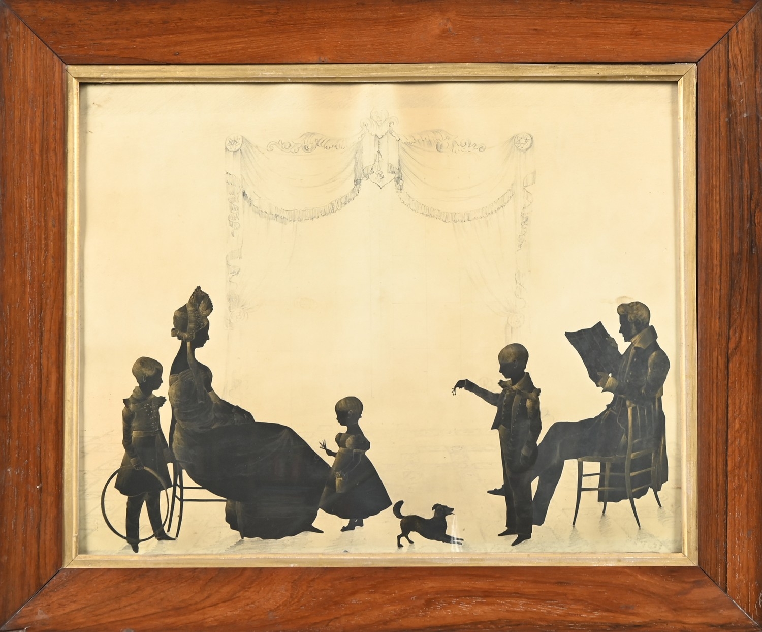 Attributed to Augustine Edouart (1789-1861) - Silhouette of a Family Group, c1830, a drawing room interior with five figures and a dog, cut paper and gold with pencil (carpet, window curtains in velvet), 42.4 x 54cm, rosewood frame