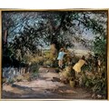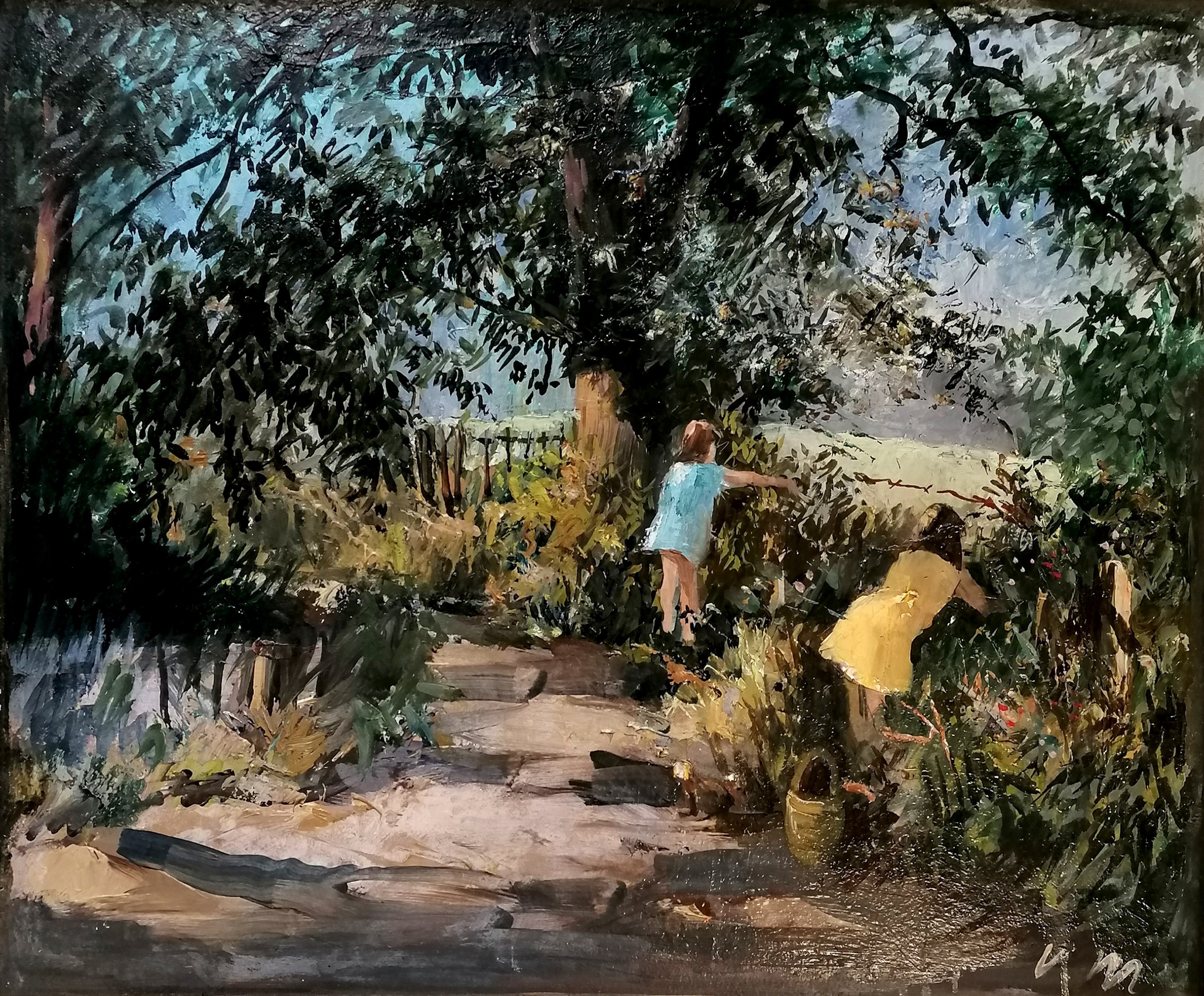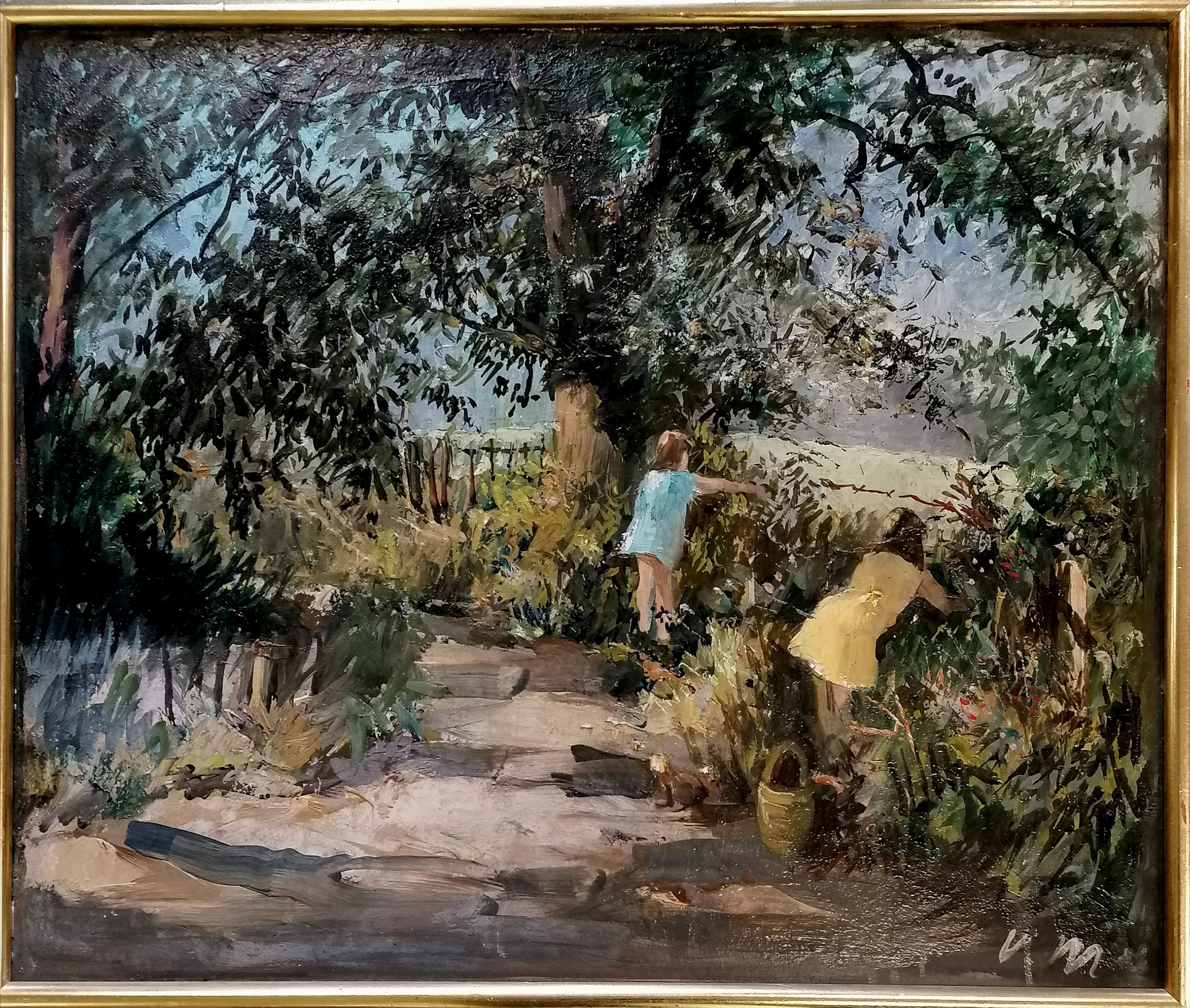 Oil on board of children blackberry picking initialled V.M - framed 73cm x 63cm
