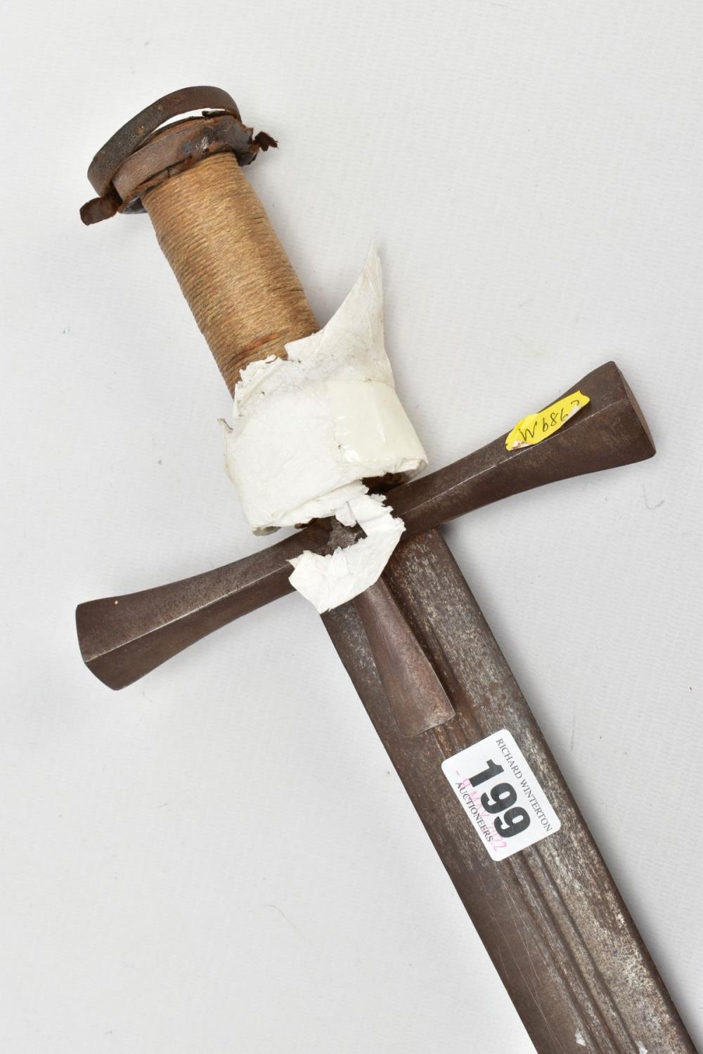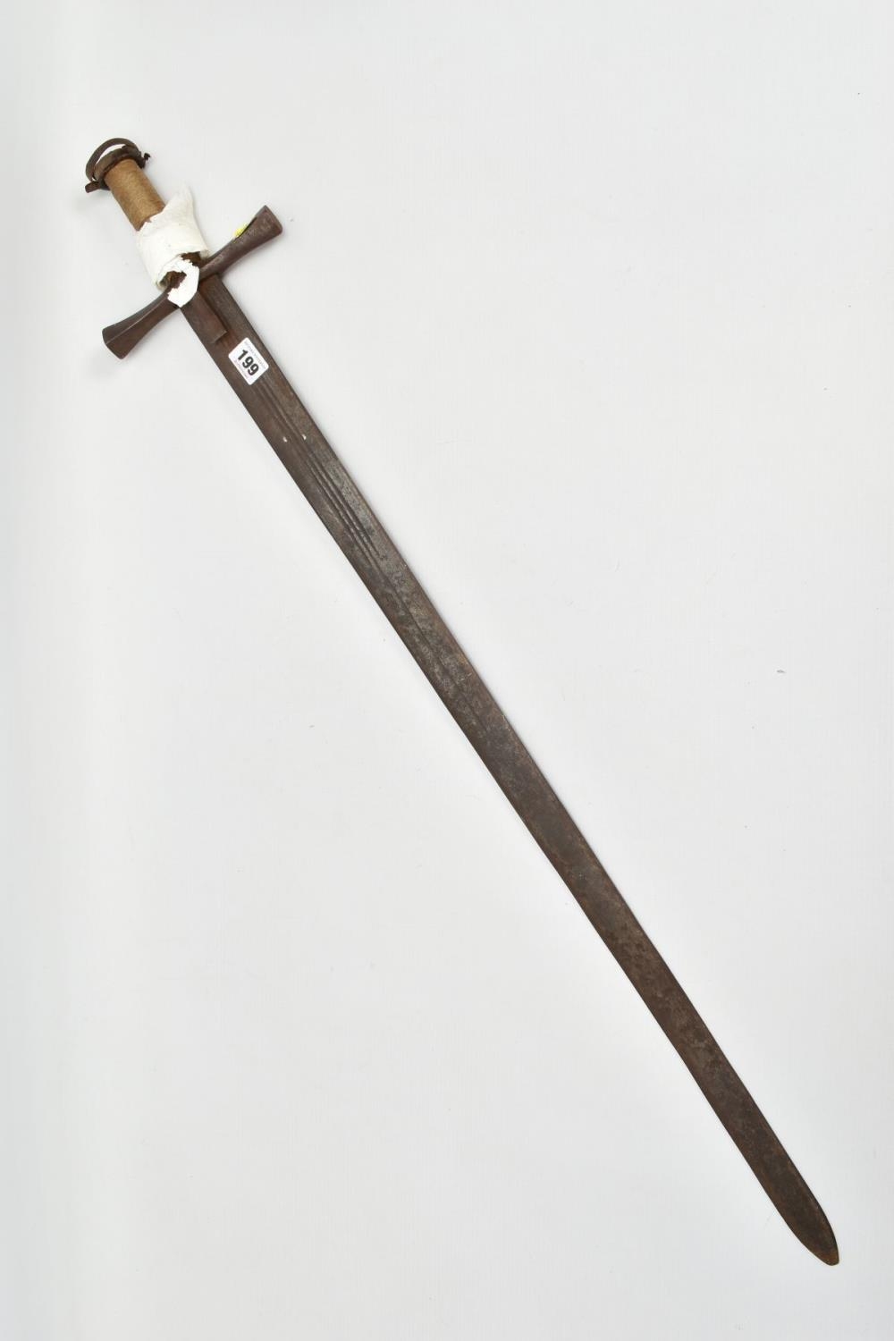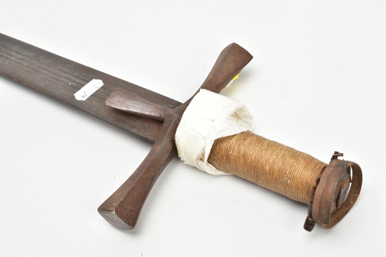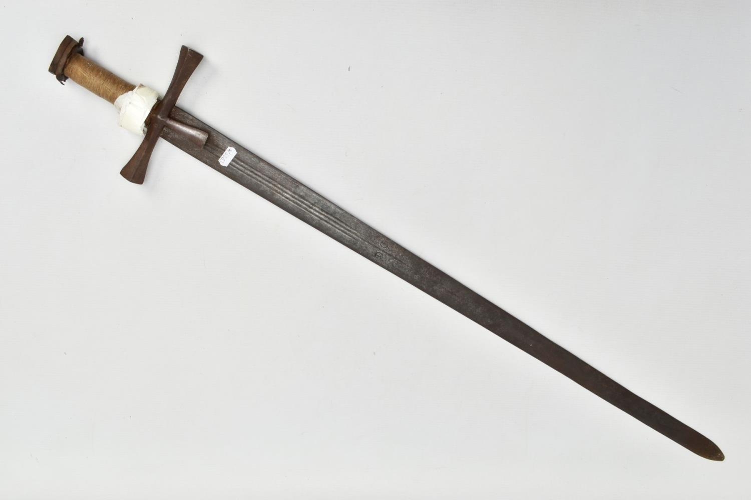 A MEDIEVAL STYLE SWORD, POSSIBLY EUROPEAN IN MANUFACTURE IN THE KASKARAS STYLE, the blade is approximately 88cm in length, blade is marked on both sides, with opposite facing Crescent Moons, usually seen on early German blades from Solingen or Spanish examples from Toledo, the blade is triple fullered near the Ricasso, tapering to single fullered approximately 42cm from the Cross guard, the guard itself is a one piece steel? with expanding Sun/Star in centre, the grip is tight bound cord, with a leather cuff at the top, age believed to be late 17th to 18th Century, light rusting throughout