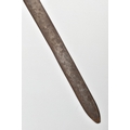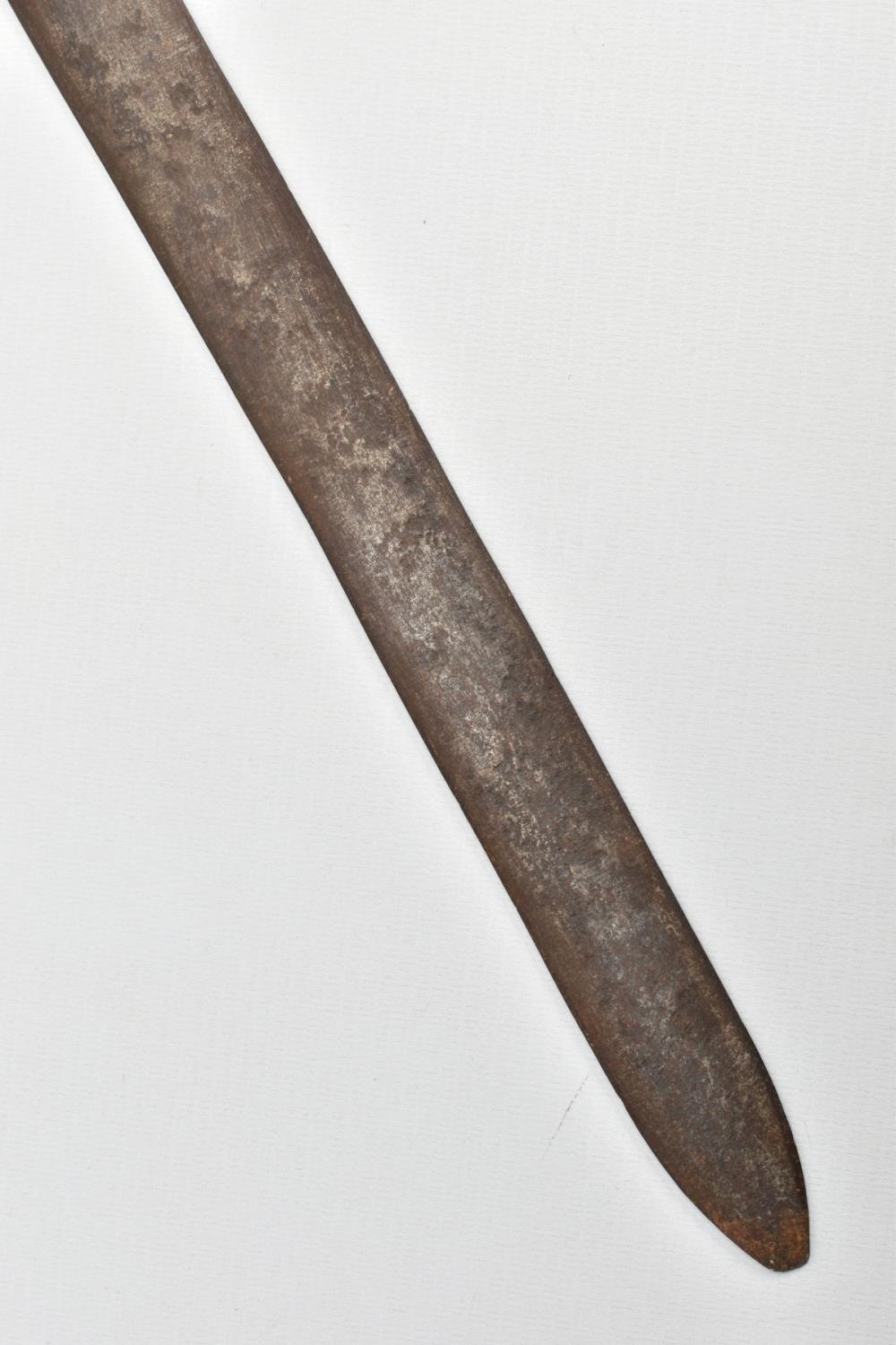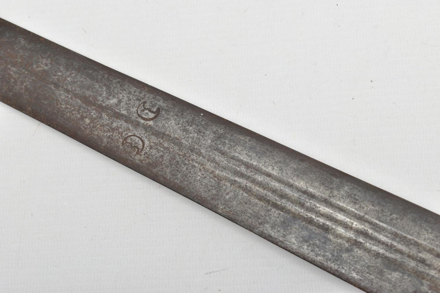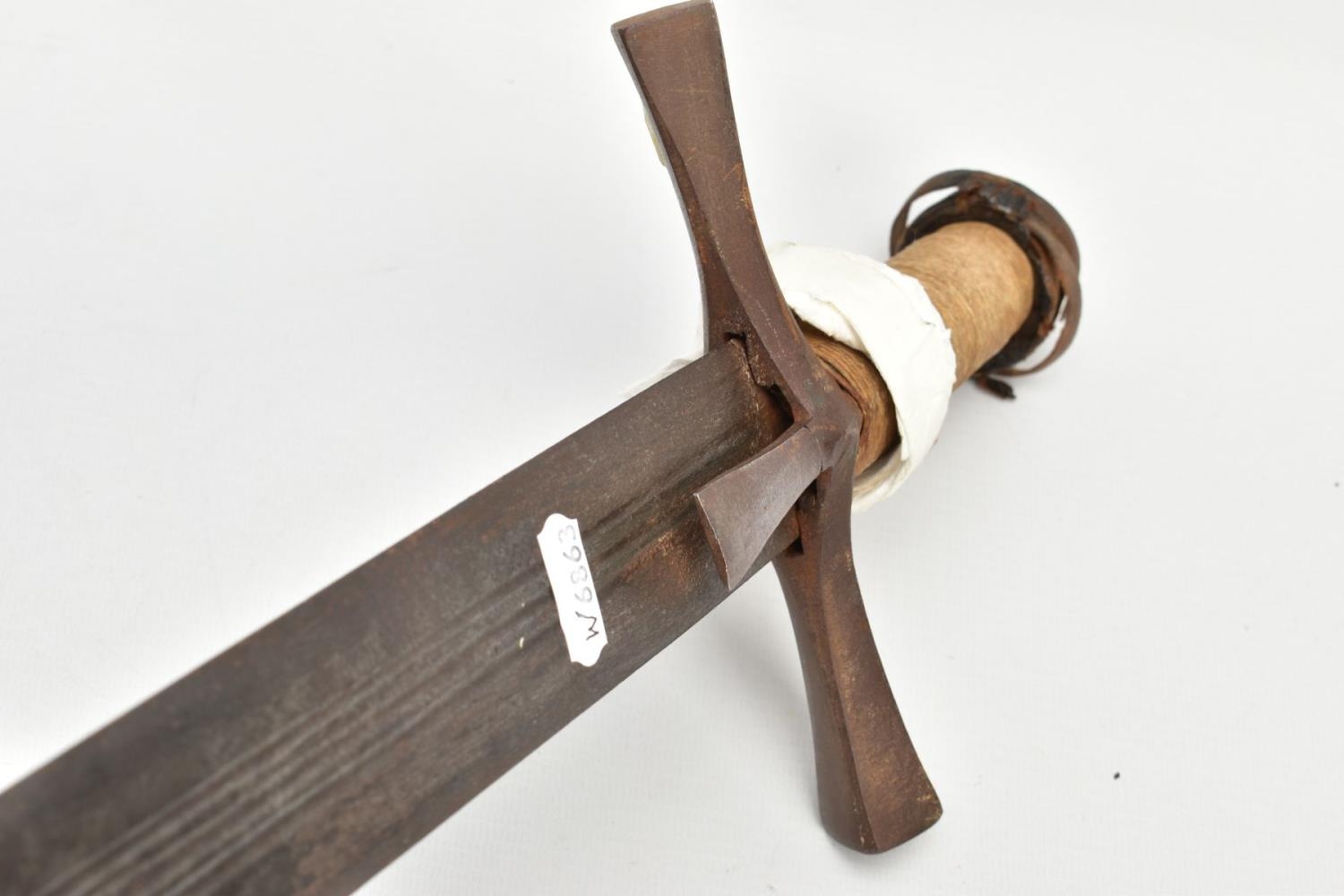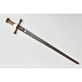A MEDIEVAL STYLE SWORD, POSSIBLY EUROPEAN IN MANUFACTURE IN THE KASKARAS STYLE, the blade is approximately 88cm in length, blade is marked on both sides, with opposite facing Crescent Moons, usually seen on early German blades from Solingen or Spanish examples from Toledo, the blade is triple fullered near the Ricasso, tapering to single fullered approximately 42cm from the Cross guard, the guard itself is a one piece steel? with expanding Sun/Star in centre, the grip is tight bound cord, with a leather cuff at the top, age believed to be late 17th to 18th Century, light rusting throughout