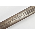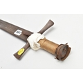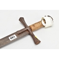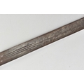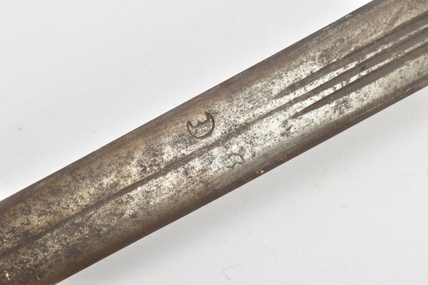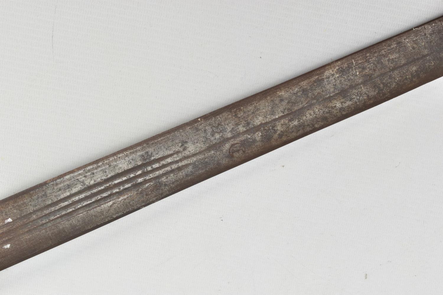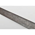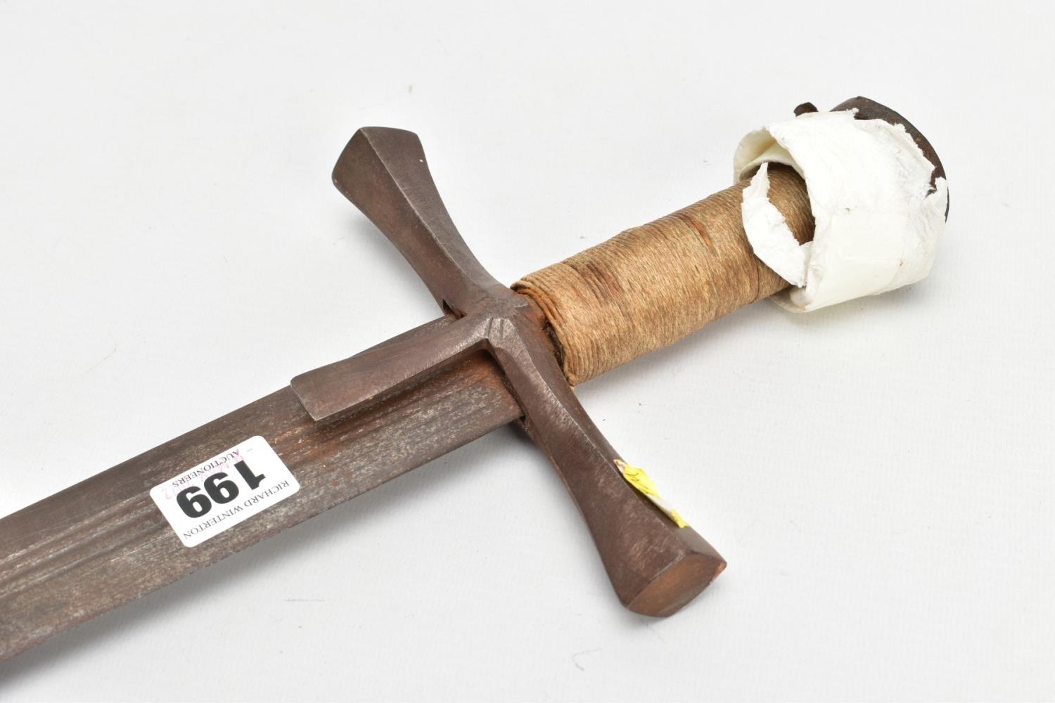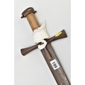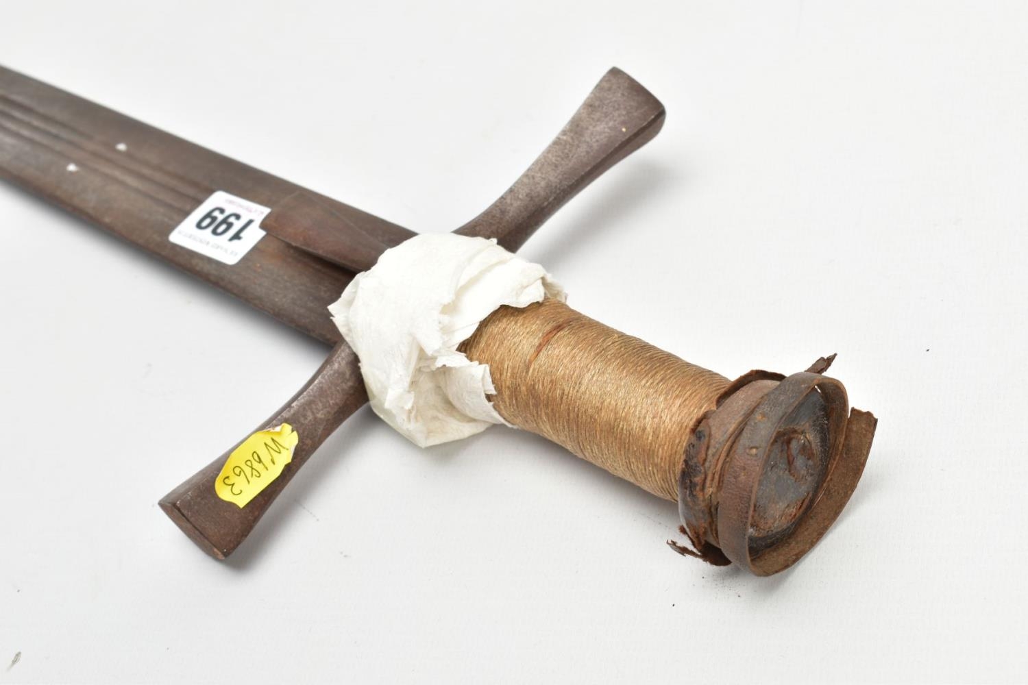 A MEDIEVAL STYLE SWORD, POSSIBLY EUROPEAN IN MANUFACTURE IN THE KASKARAS STYLE, the blade is approximately 88cm in length, blade is marked on both sides, with opposite facing Crescent Moons, usually seen on early German blades from Solingen or Spanish examples from Toledo, the blade is triple fullered near the Ricasso, tapering to single fullered approximately 42cm from the Cross guard, the guard itself is a one piece steel? with expanding Sun/Star in centre, the grip is tight bound cord, with a leather cuff at the top, age believed to be late 17th to 18th Century, light rusting throughout