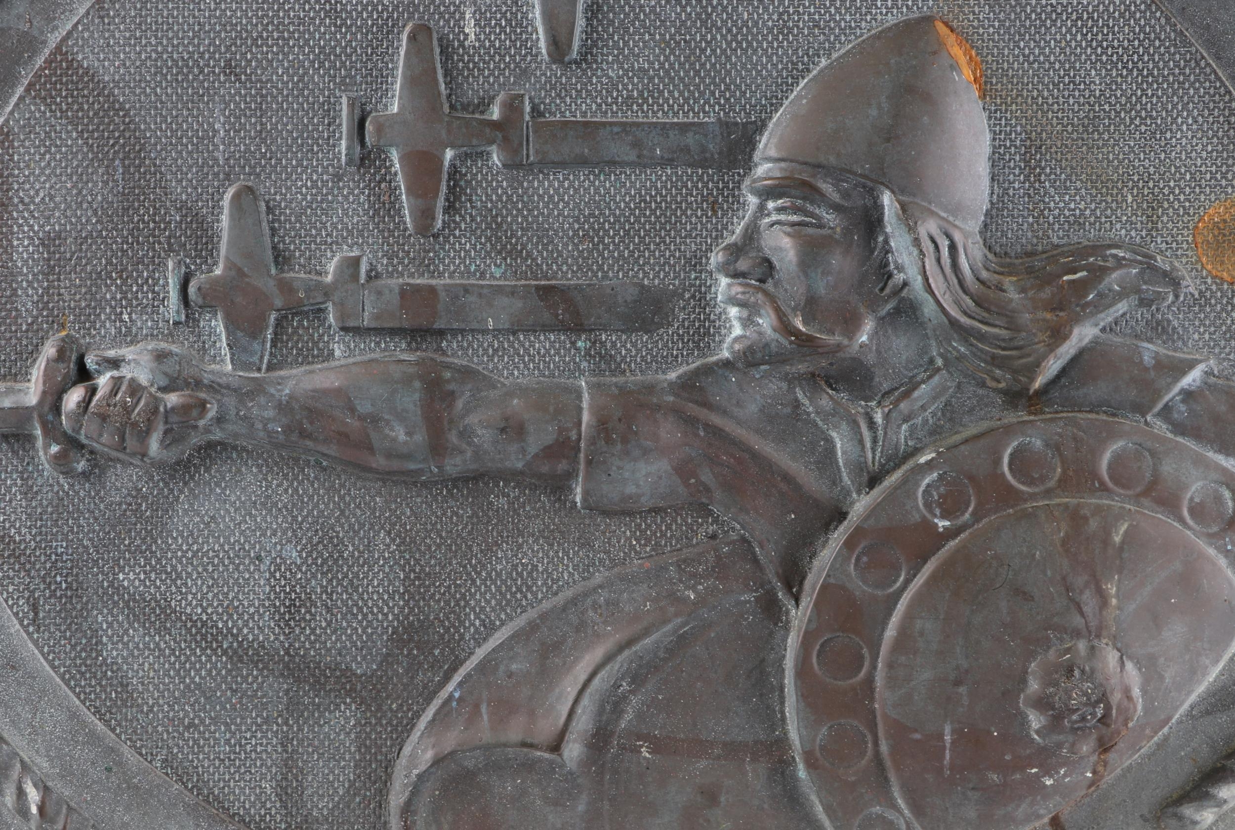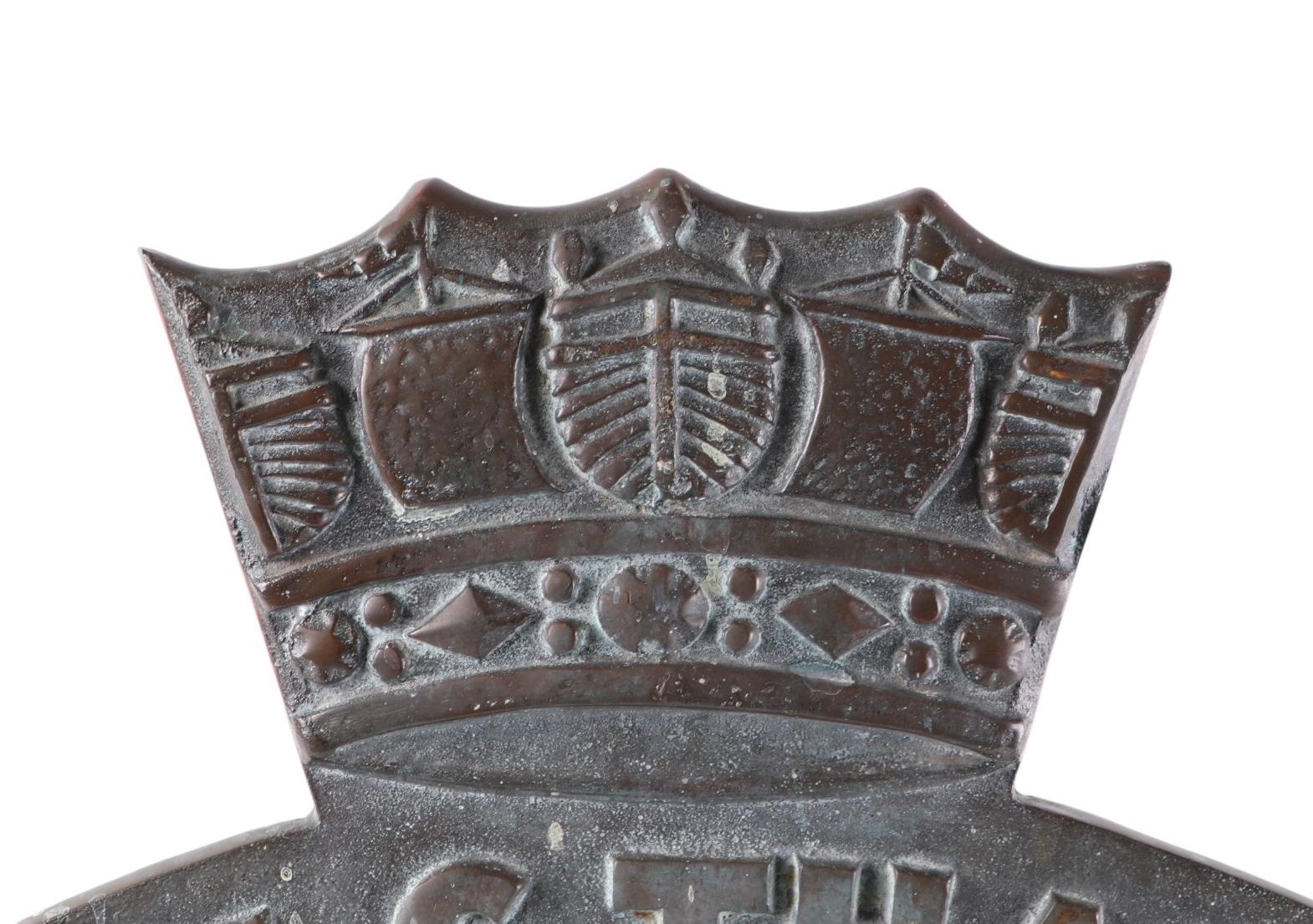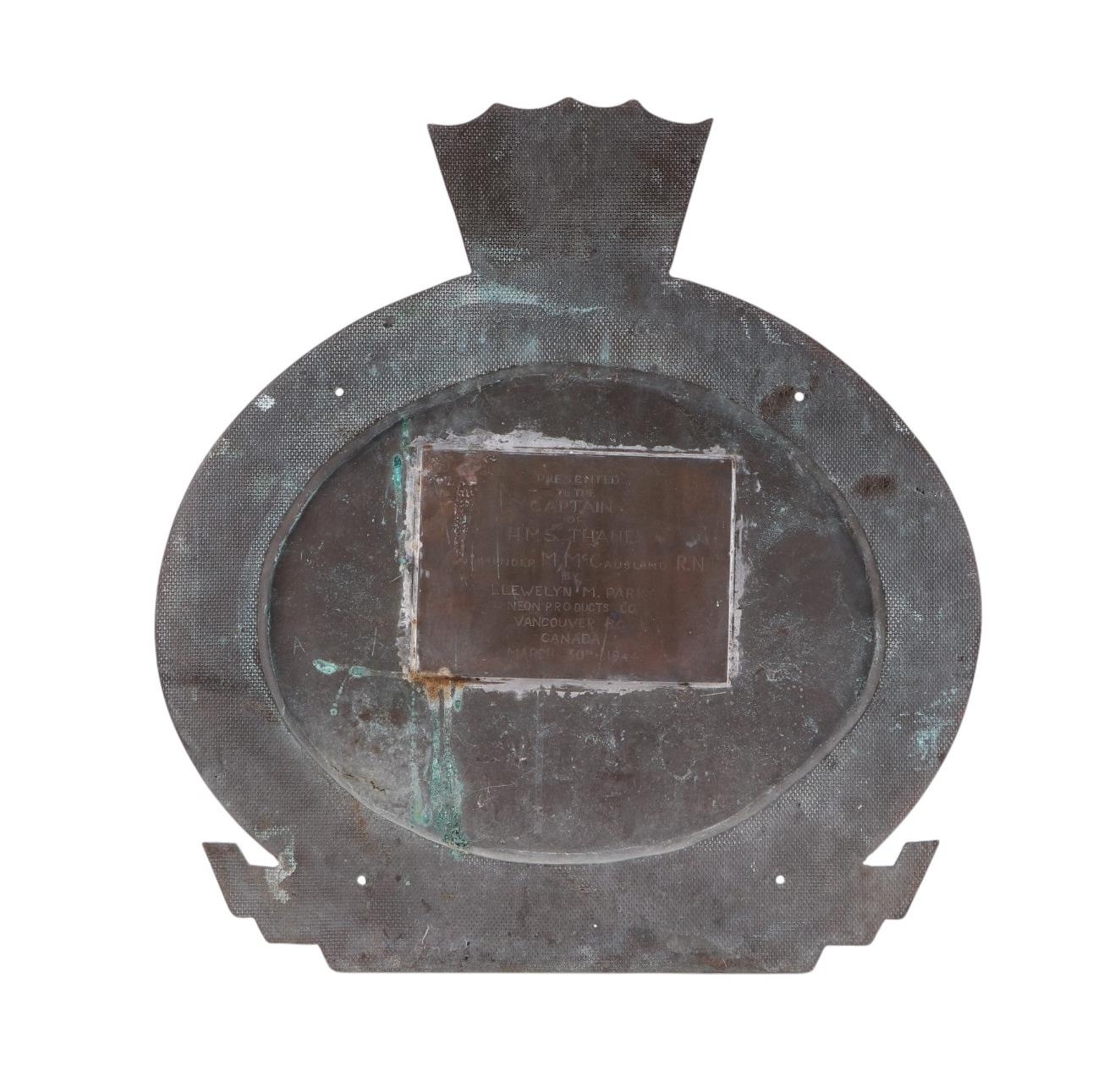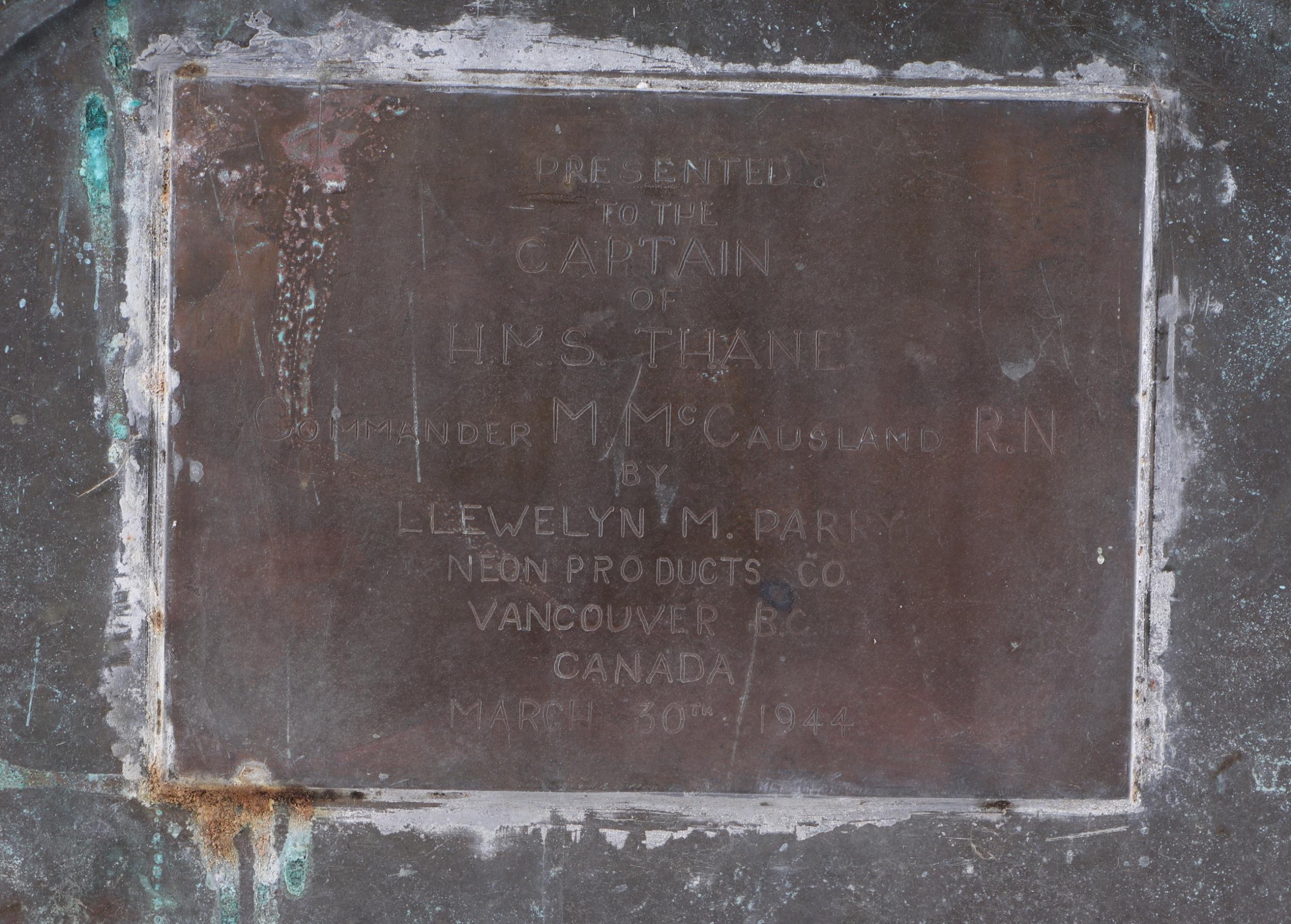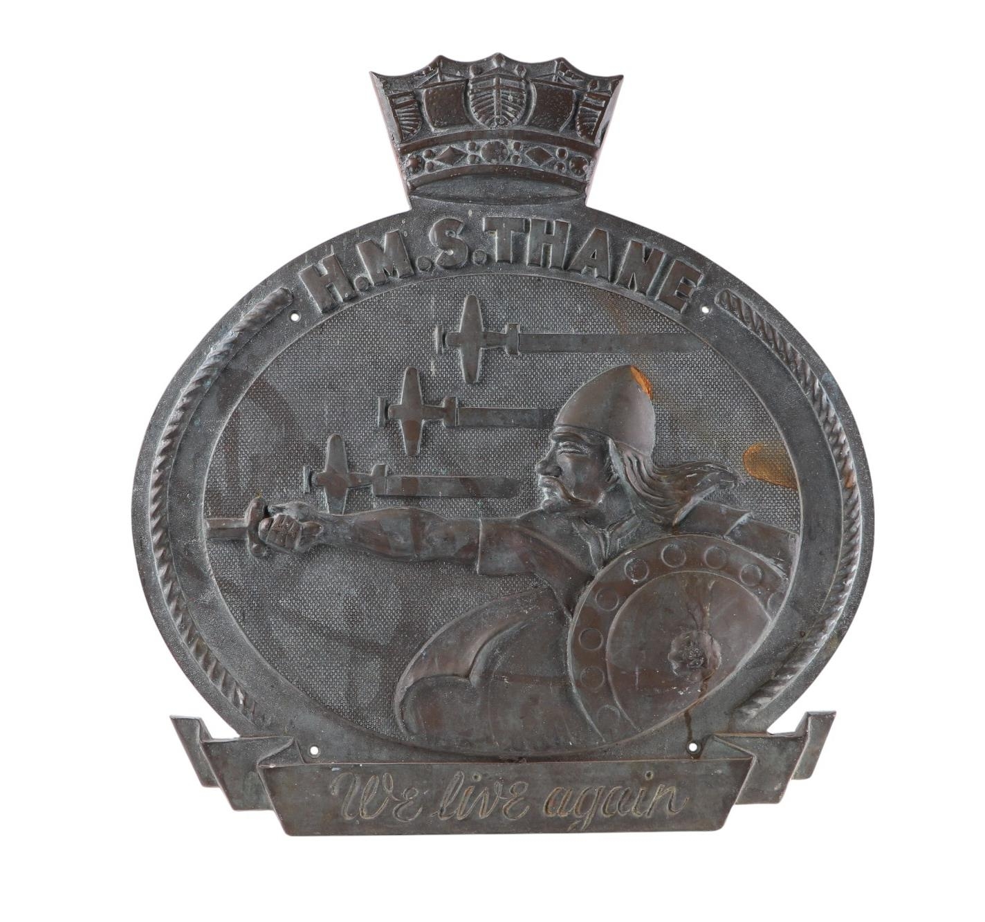 A large cast bronze Naval plaque HMS Thane 'We Live Again', with inscription to verso 'Presented to the Captain of HMS Thane Commander M McCausland R.N. by Llewellyn Parry Neon Products Co. Vancouver, Canada, March 30th 1944' 47cms wide.
