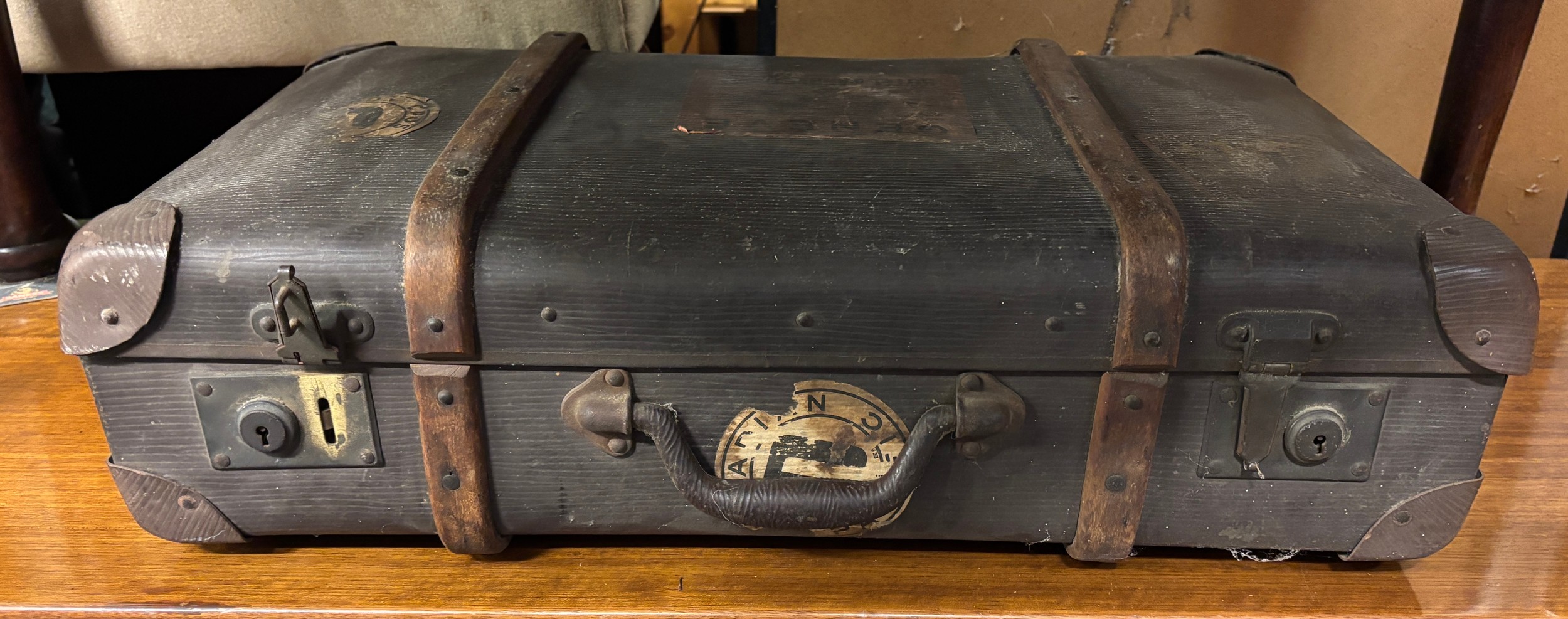 VINTAGE WOODEN BANDED SUITCASE WITH LABELS