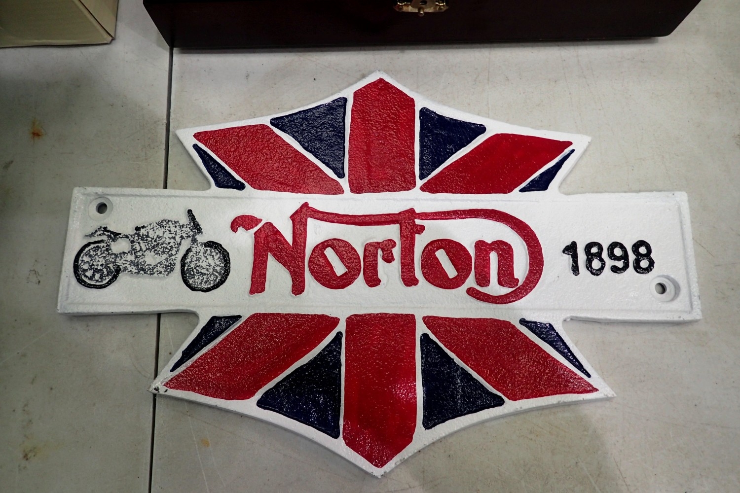 Cast iron Norton motorcycle wall sign, L: 30 cm. UK P&P Group 1 (£18+VAT for the first lot and £2+VAT for subsequent lots)