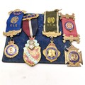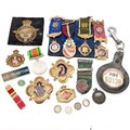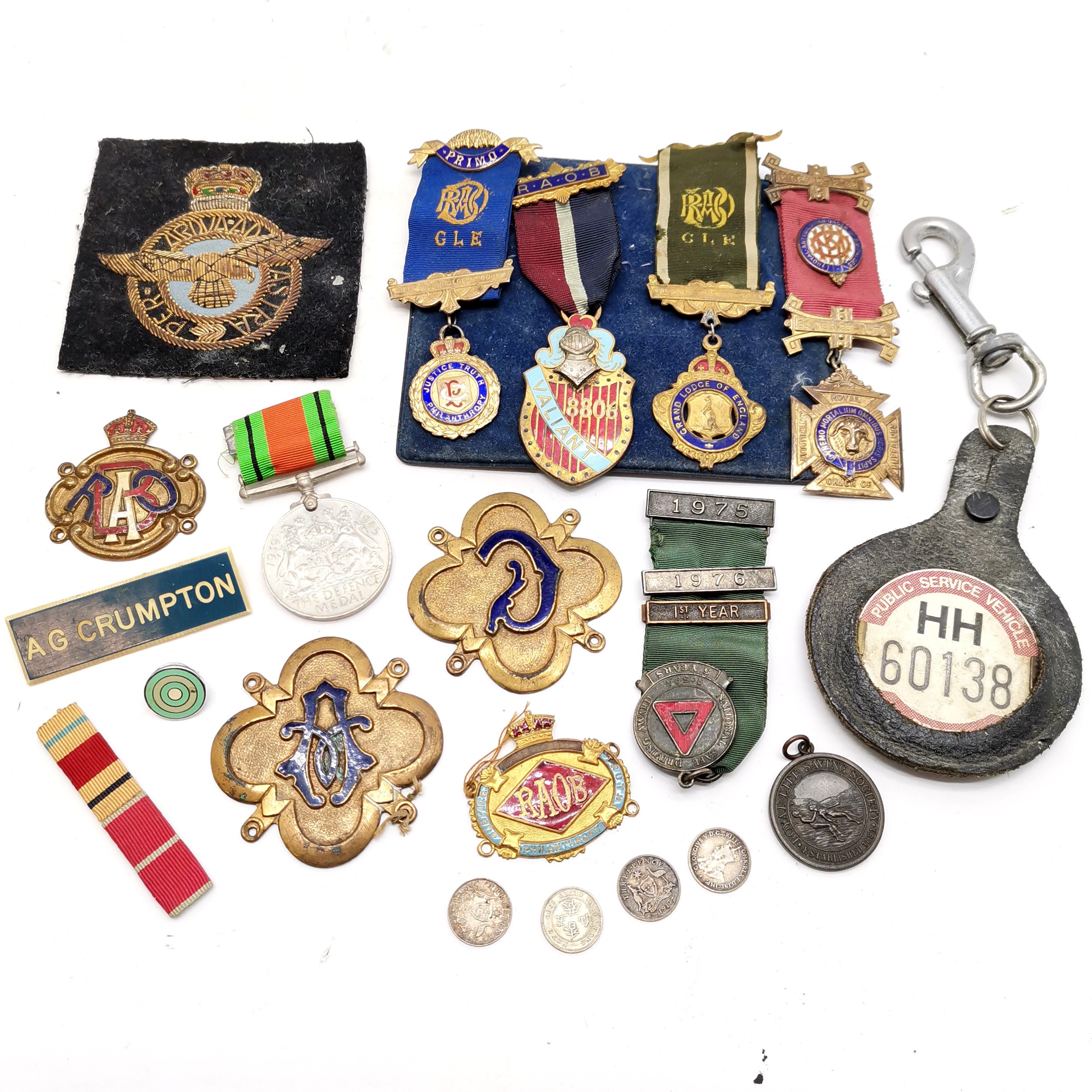 WWII medal, RAF blazer badge, RAOB medals (2 are silver), swimming medallion, bus drivers badge etc