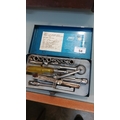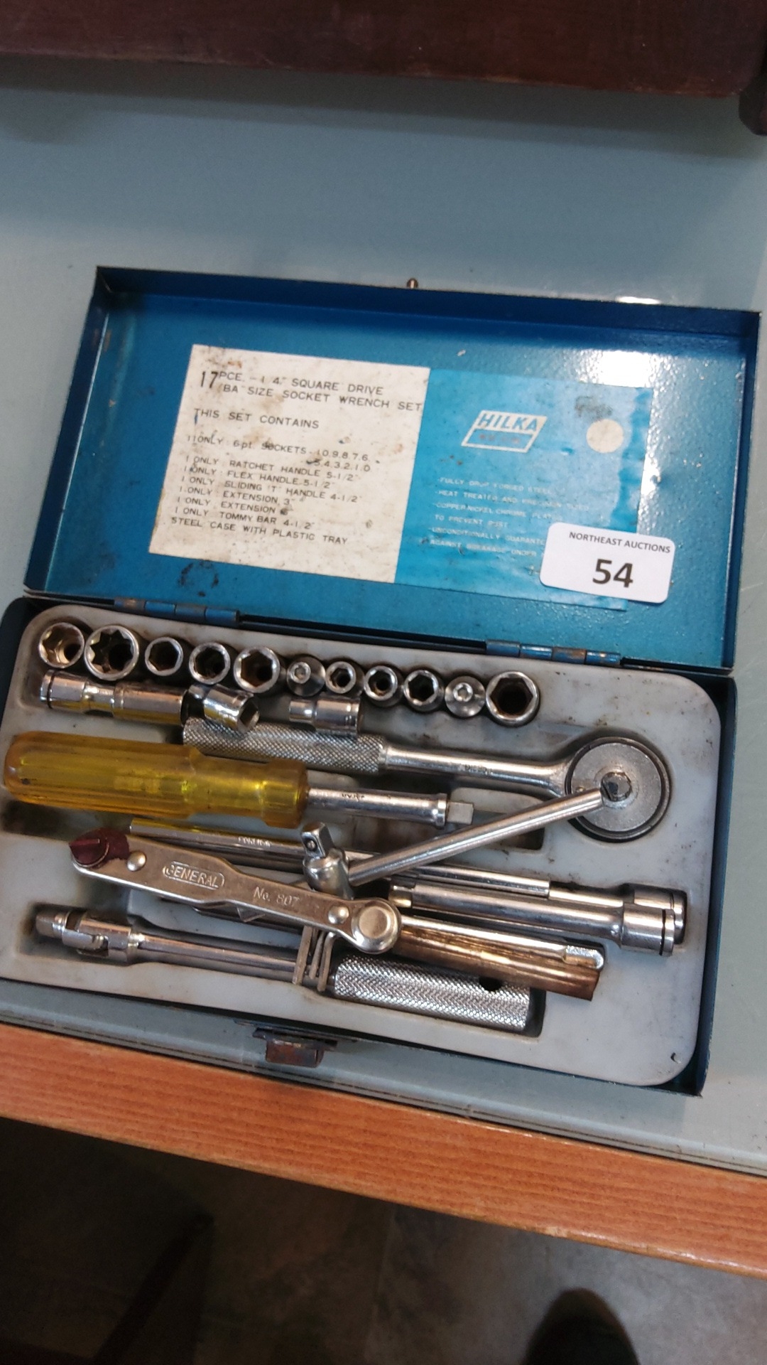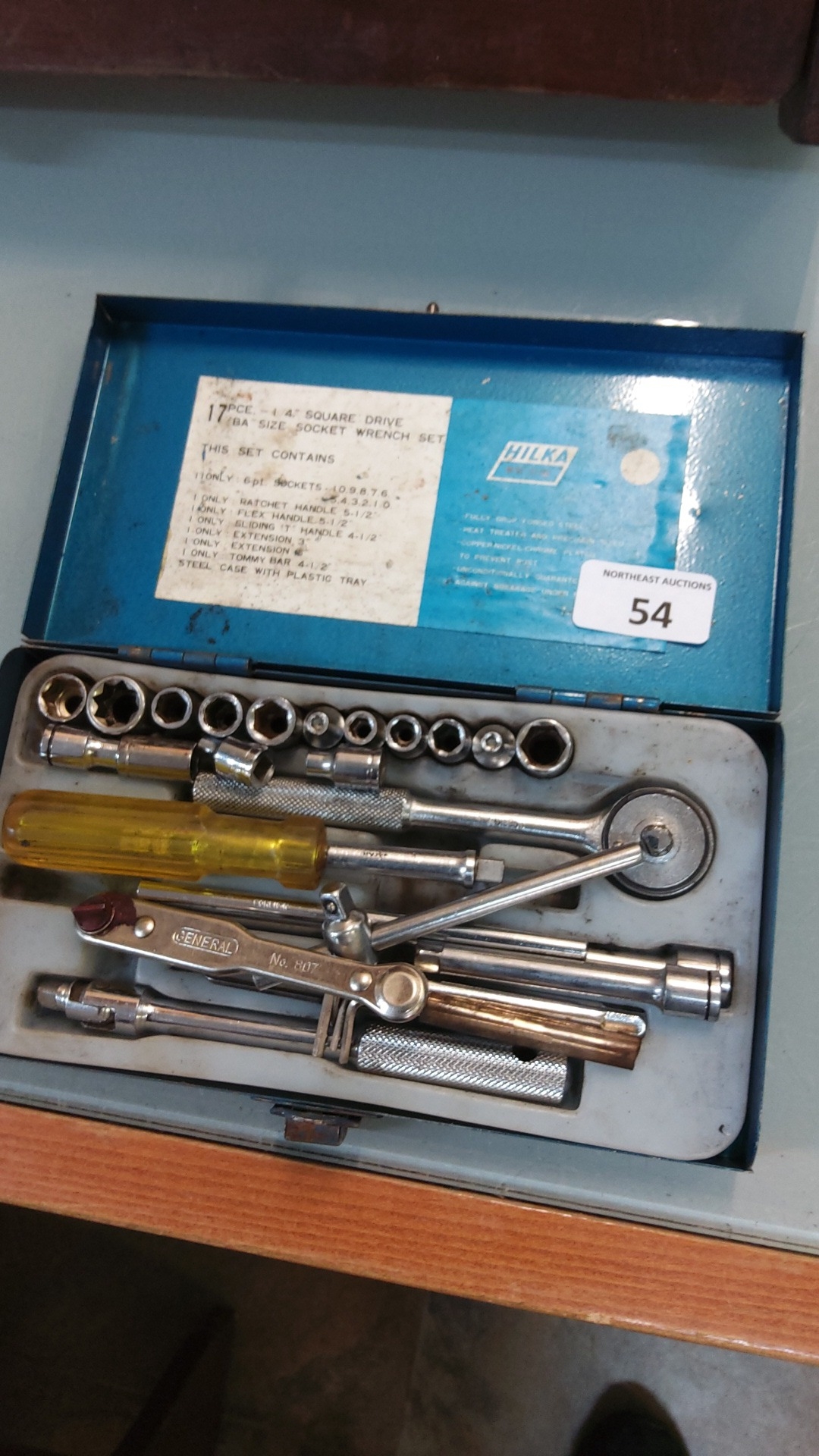 Hilka metal-cased 17-piece 1⁄4-inch square-drive socket wrench set with ratchet handle, extensions, screwdriver handle and assorted sockets.