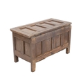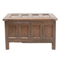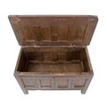 An oak four panel coffer. 18th century, of diminutive proportions, with panelled top, front and sides, raised on stile feet, height 48cm, width 80cm, depth 41cm.