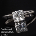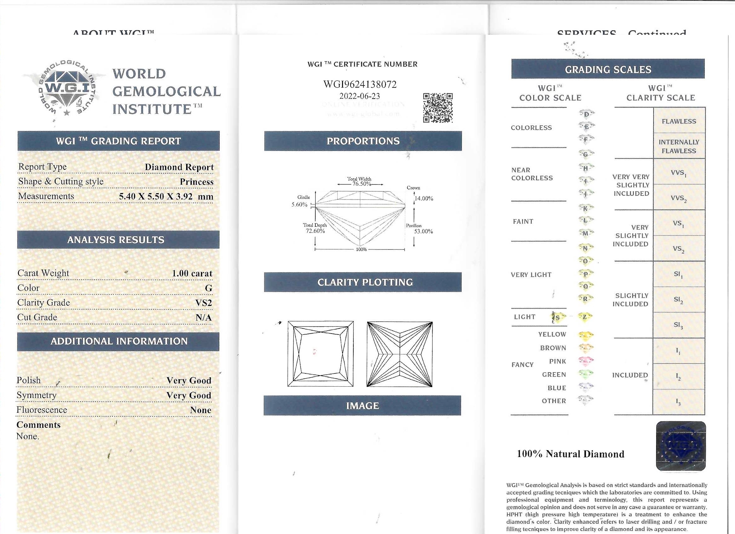 CERTIFIED DIAMOND SOLITAIRE RING, set with a princess cut diamond of 1.00 ct. size M 1/2. 2.6 grams. Accompanied with a world Gemological institute Report. no: WGI19624138072. Stating that the 1.00 ct. diamond is G colour, VS2 clarity. None fluorescence
