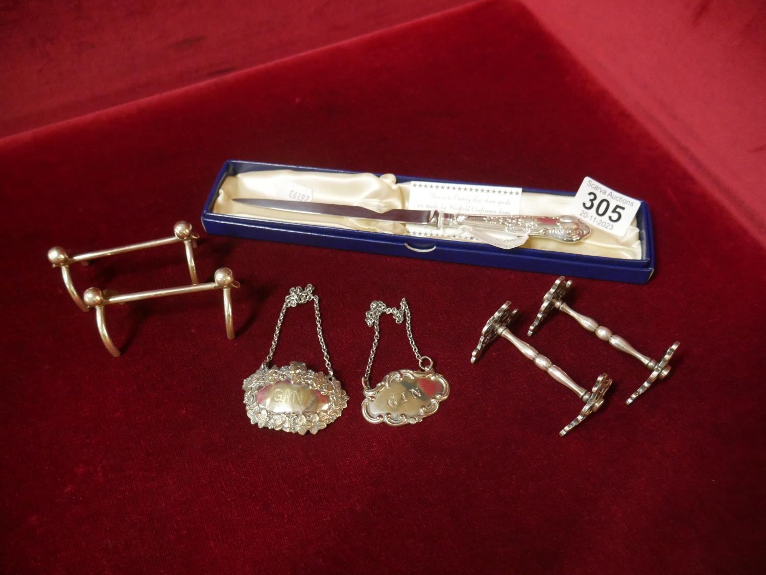 SILVER HANDLED LETTER OPENER PLUS SILVER PLATED ITEMS