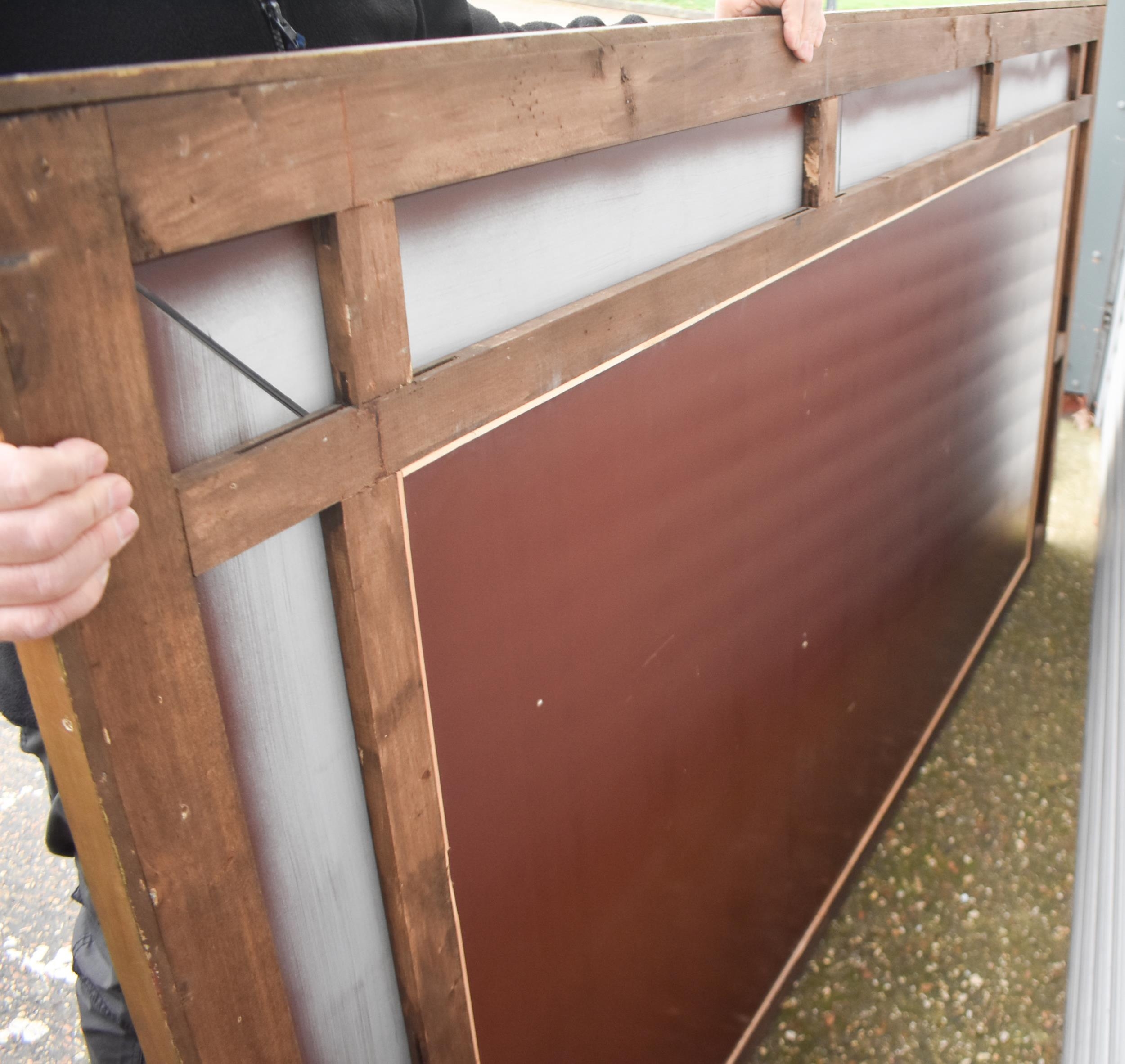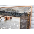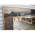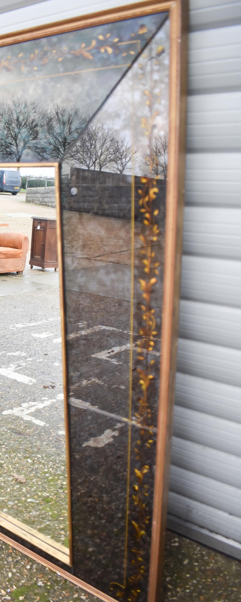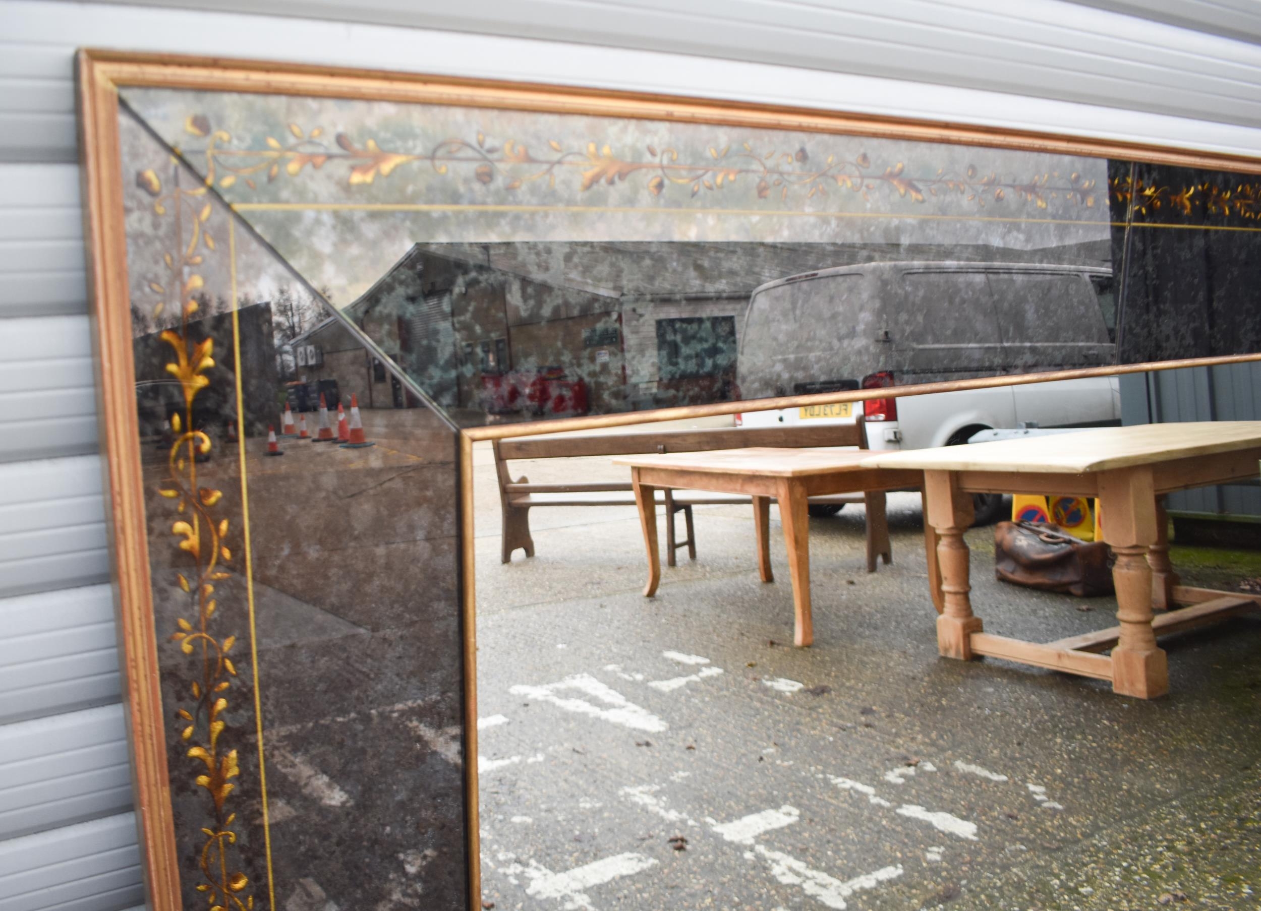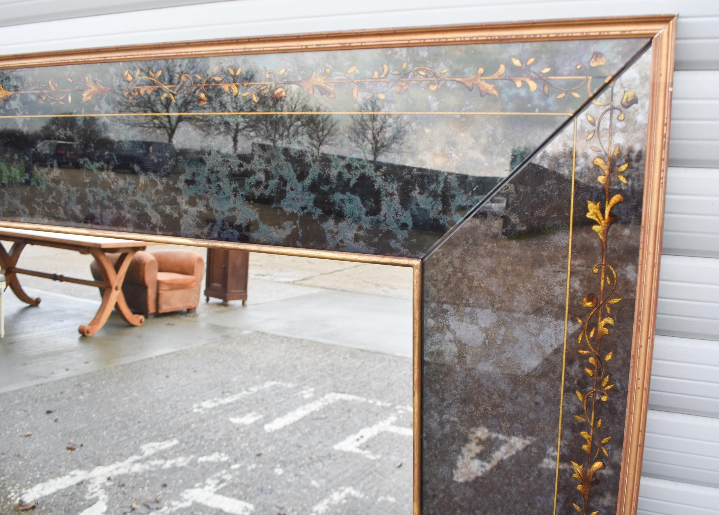 A large 20th century wooden framed Venetian style mirror with glass panelled surrounds with de-silvering effect and gilt flower decoration 130.5 x 263 cm
