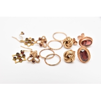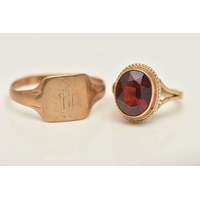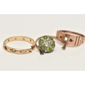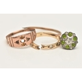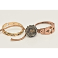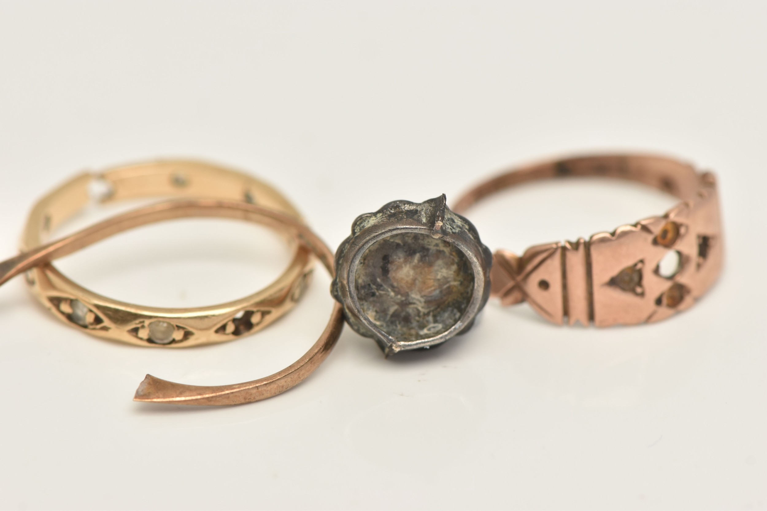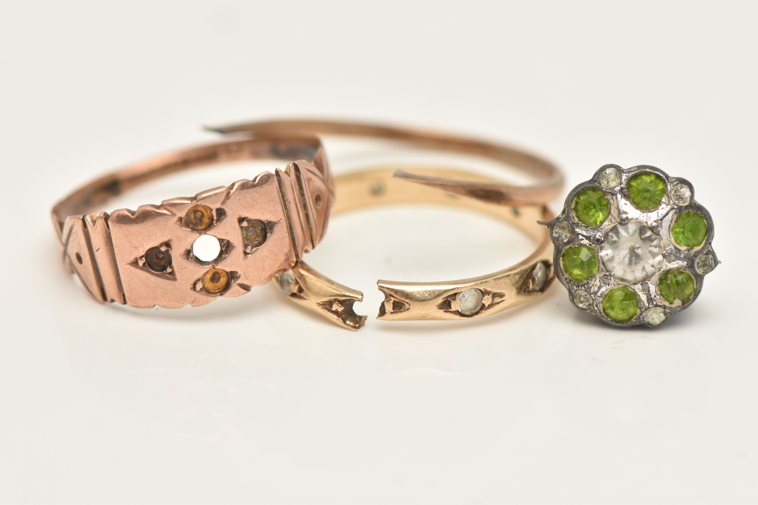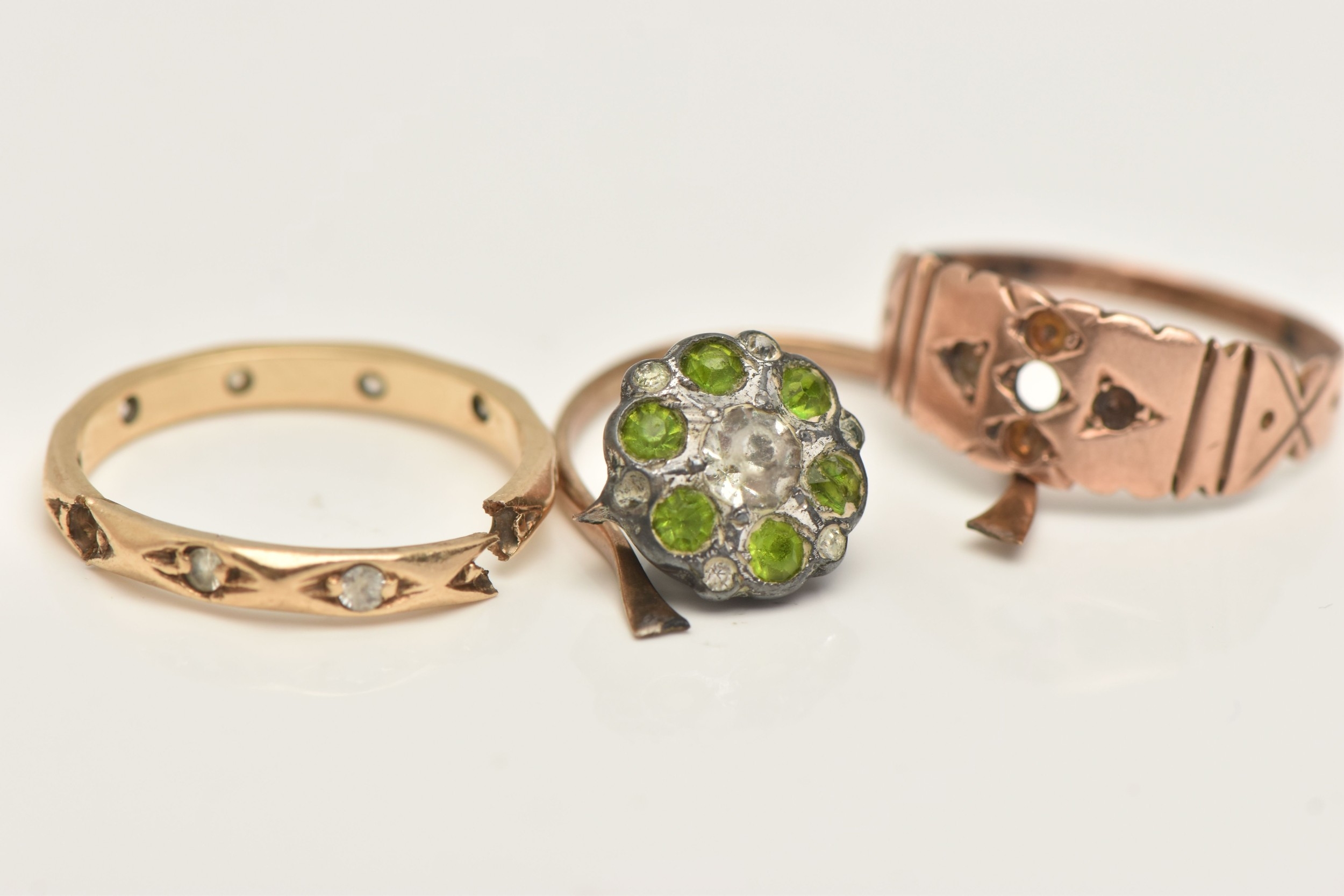 THREE RINGS, all AF, to include a 9ct rose gold ring missing stones, hallmarked Birmingham, ring size M, an AF yellow metal spinel set eternity ring (missing stones and split shank), stamped 9ct, a broken paste set cluster ring with yellow metal shank (ring head is broken from shank) stamped 9ct & Sil, approximate gross weight 5.2 grams (condition report: all will require some attention)