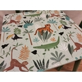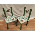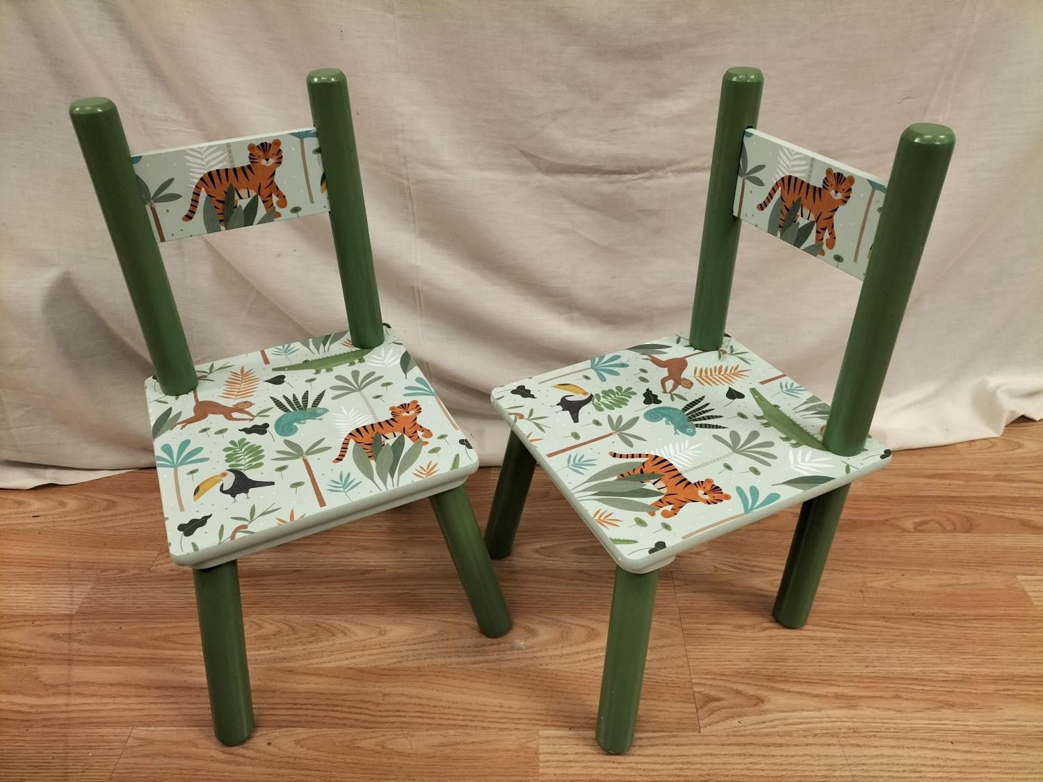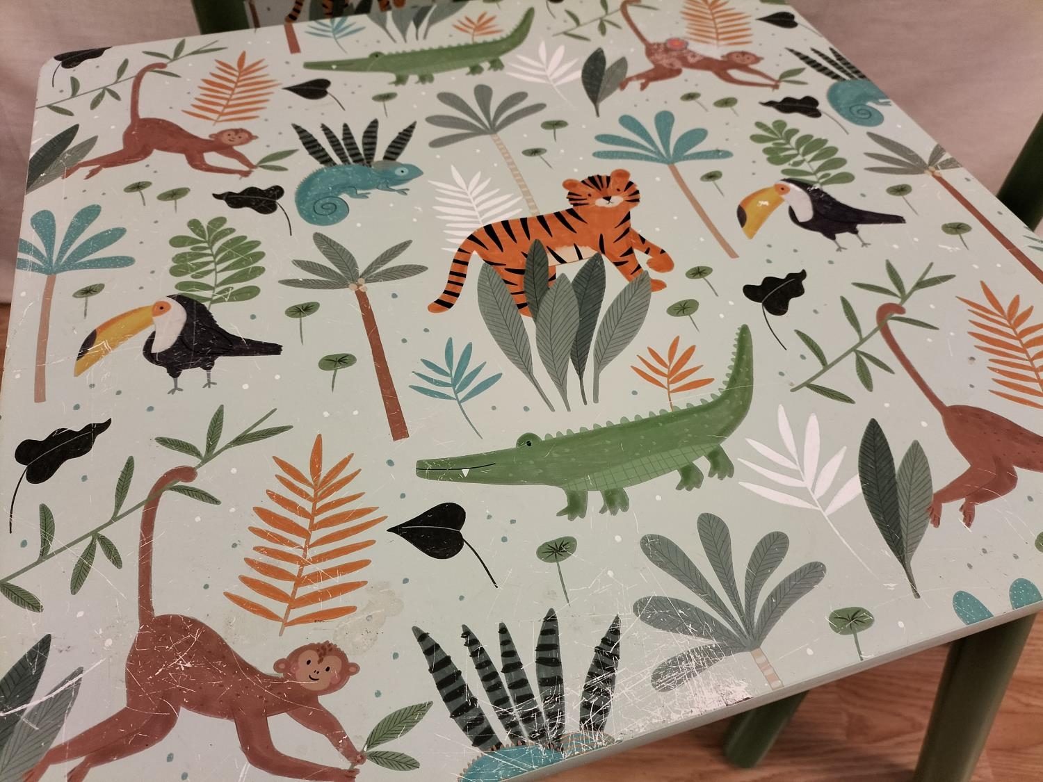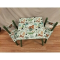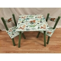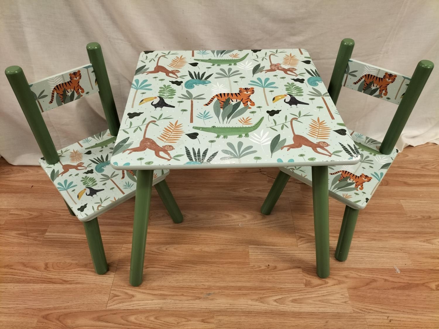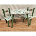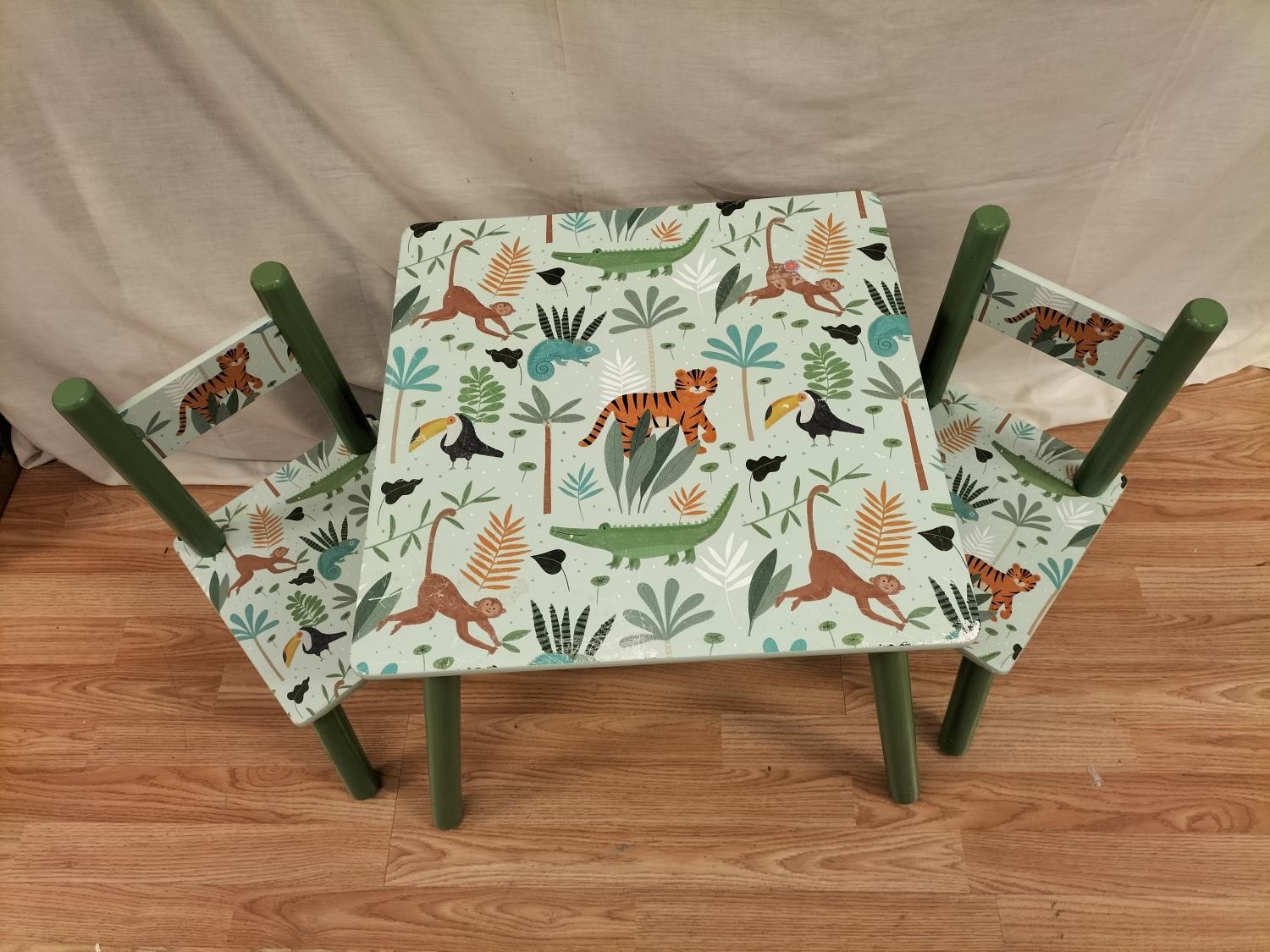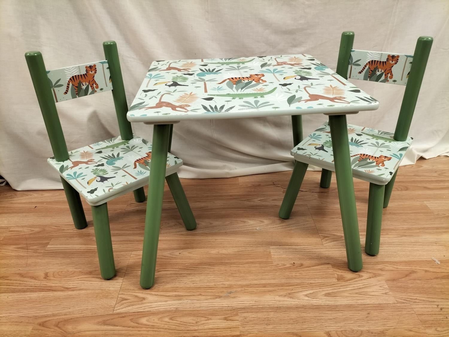 Jungle Themed Child's Wooden Table and Two Chairs. Table 43cm High, 50cm x 50cm. Collection Only.