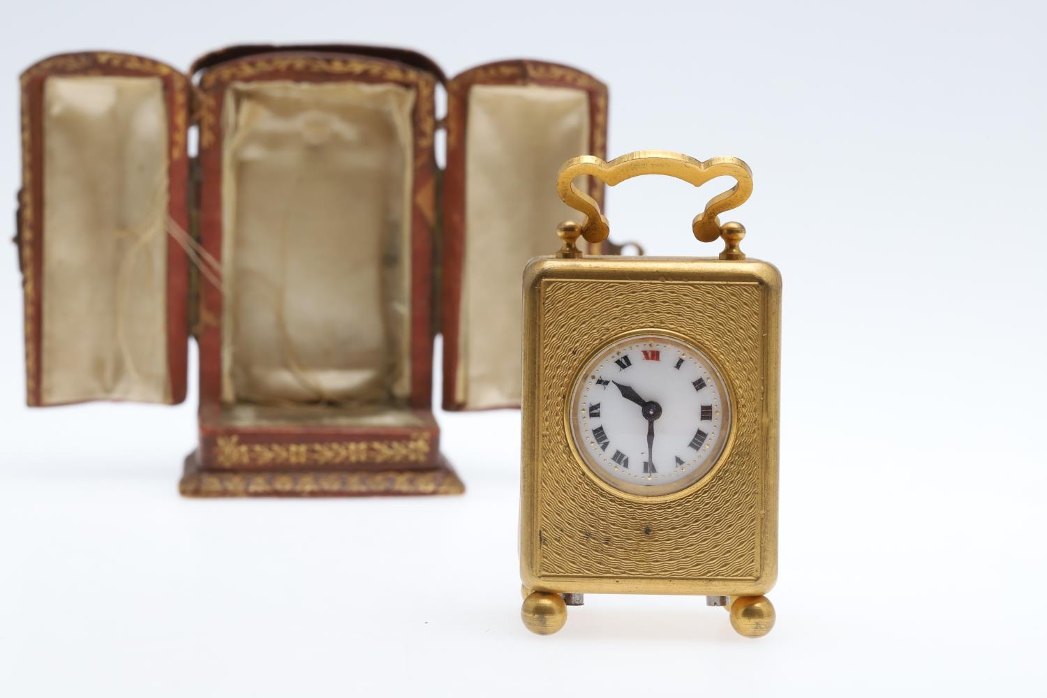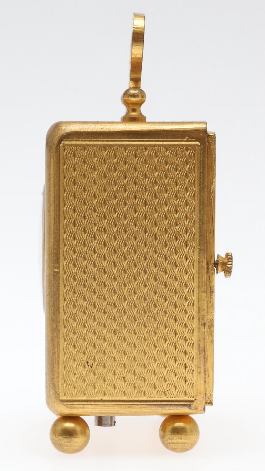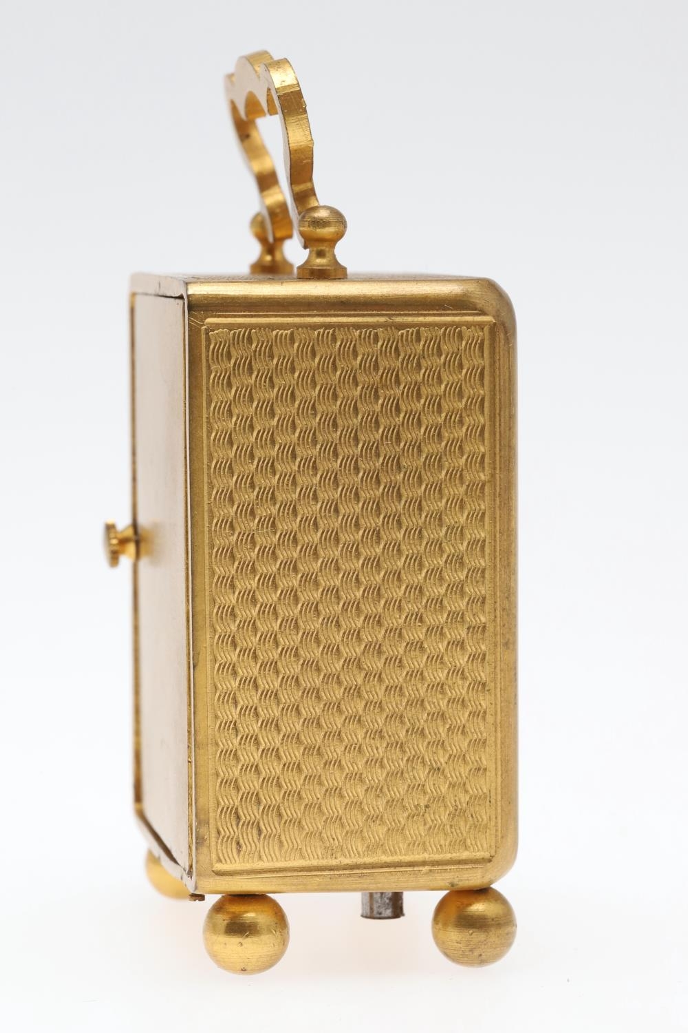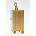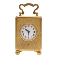 A FRENCH MINIATURE GILT METAL TRAVELLING TIMEPIECE. late 19th/early 20th century, the case with carrying handle and engine turned decoration, upon ball feet, height 6.5cm.