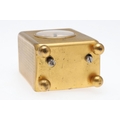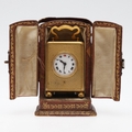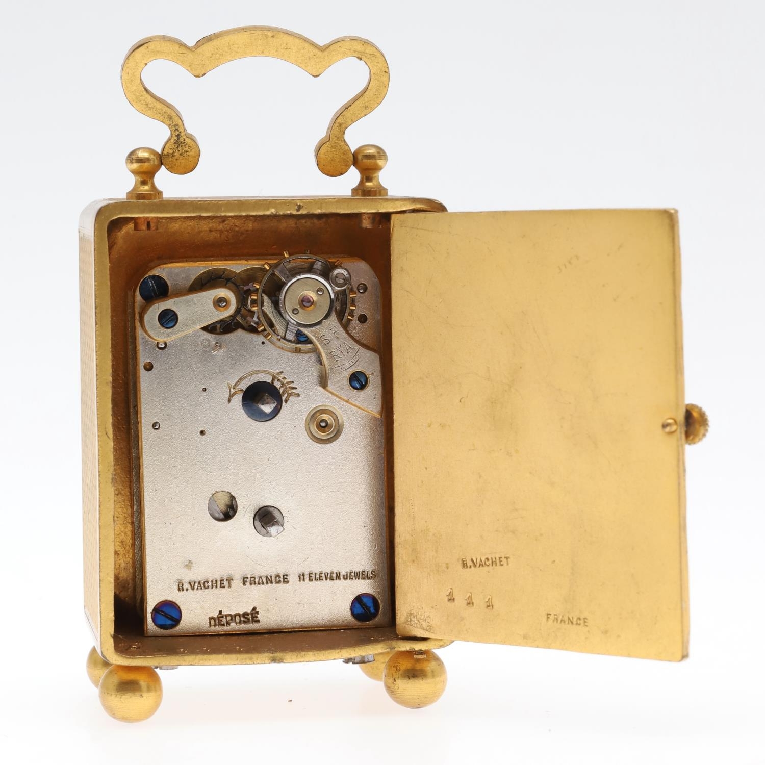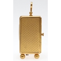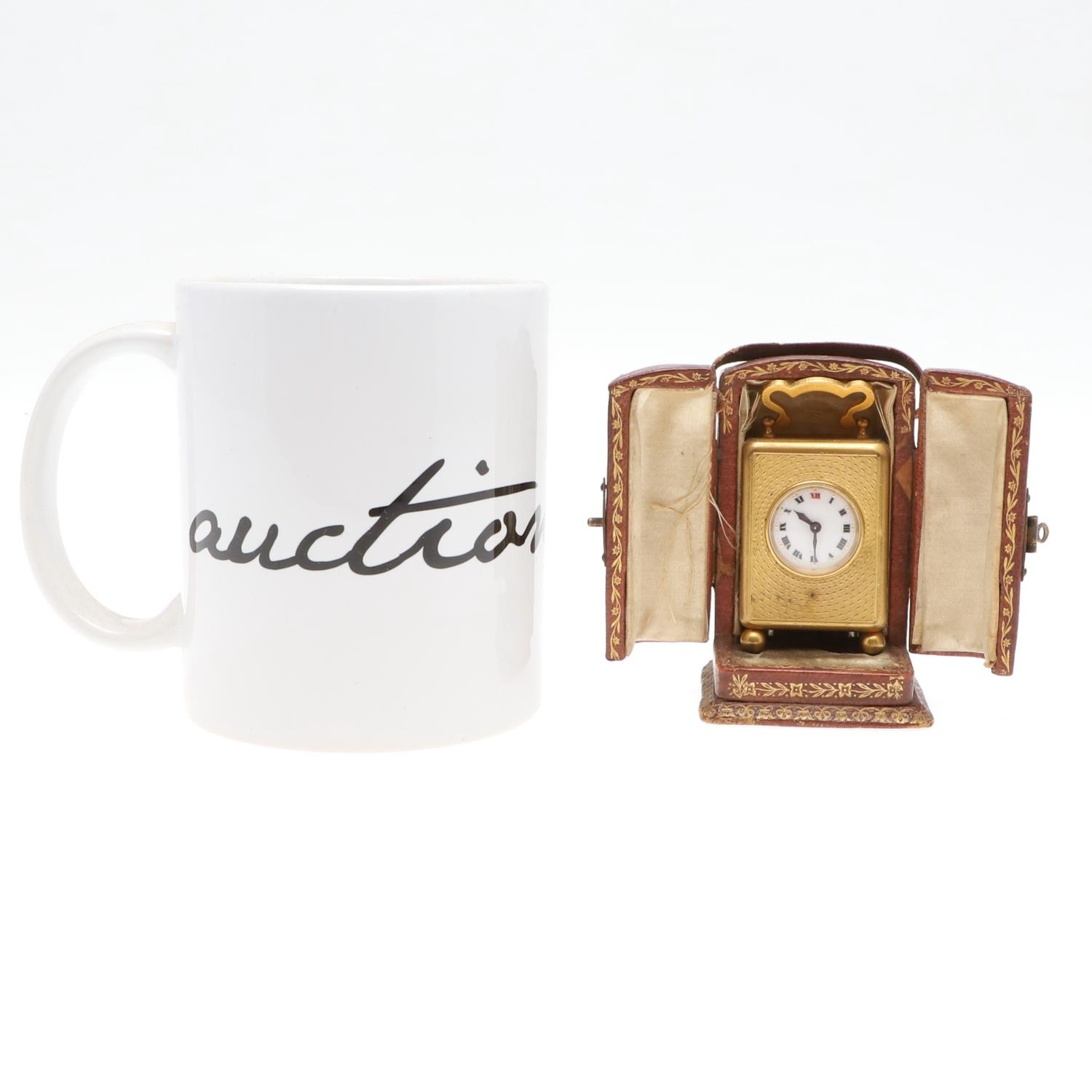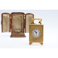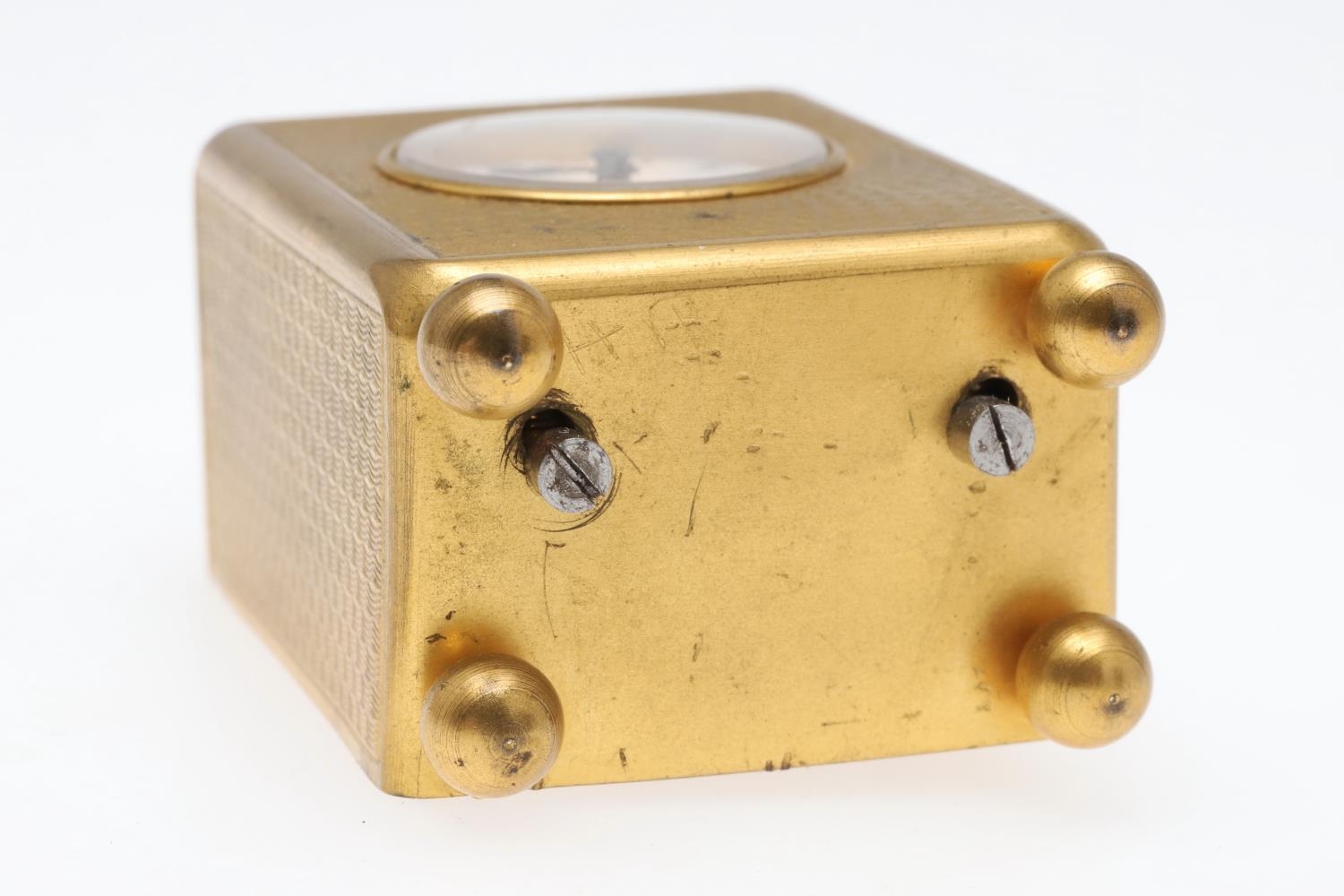 A FRENCH MINIATURE GILT METAL TRAVELLING TIMEPIECE. late 19th/early 20th century, the case with carrying handle and engine turned decoration, upon ball feet, height 6.5cm.