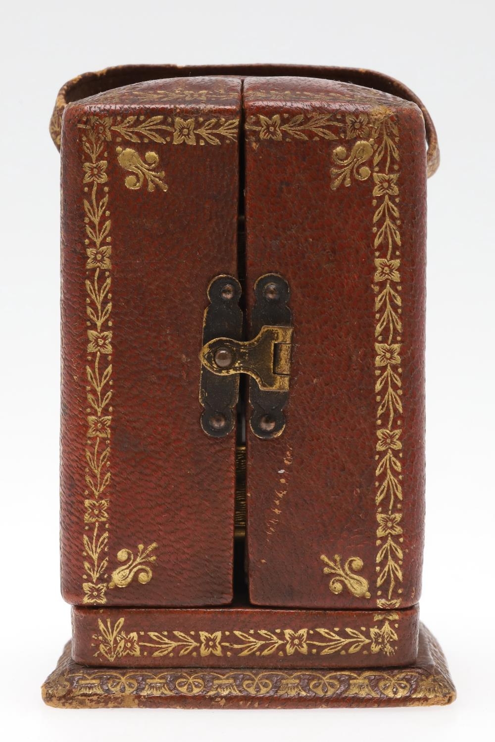Light surface wear to clock, minute hand needs tightening, appears over wound and does not run. Light wear to leather case, strap broken.