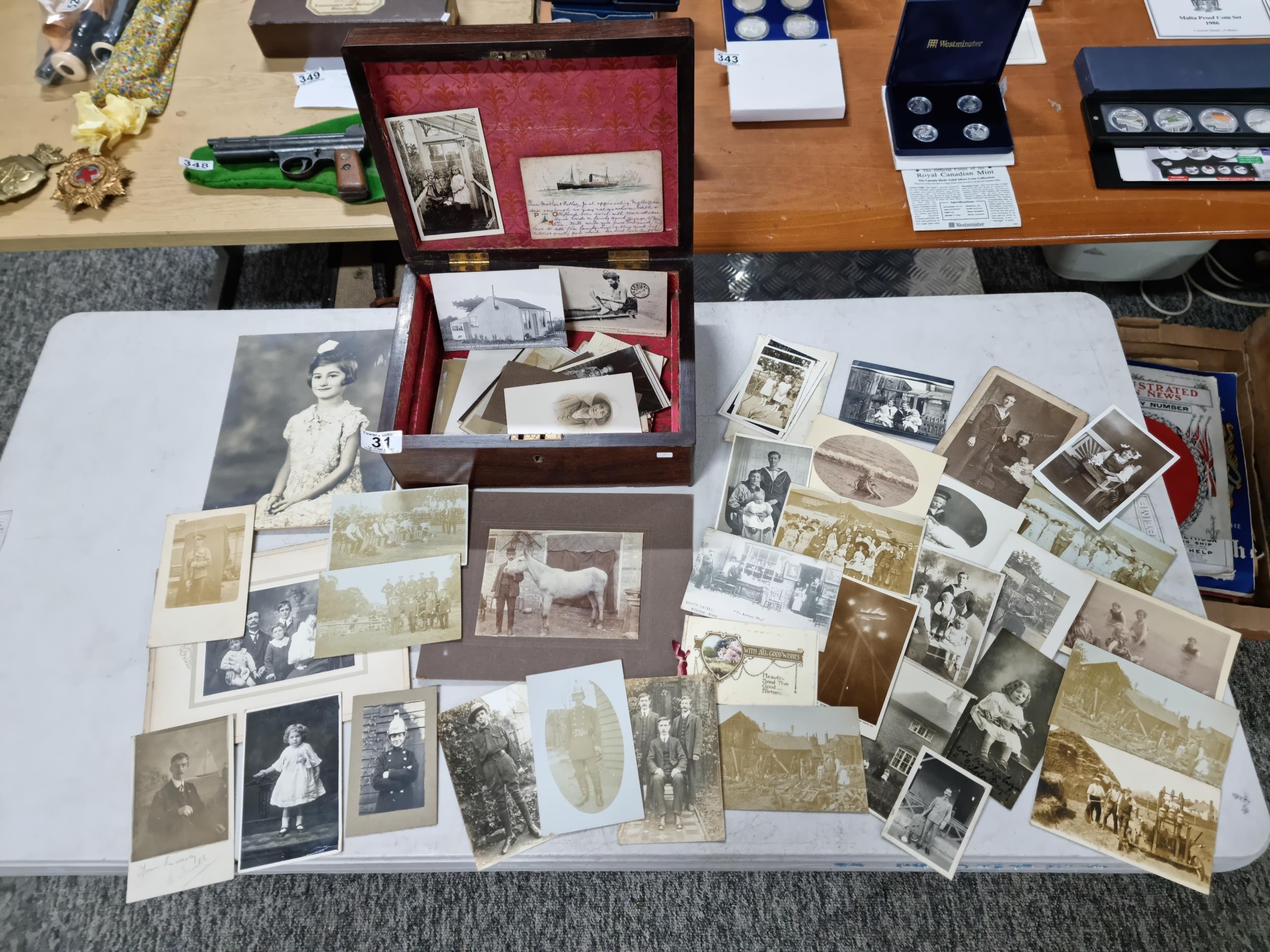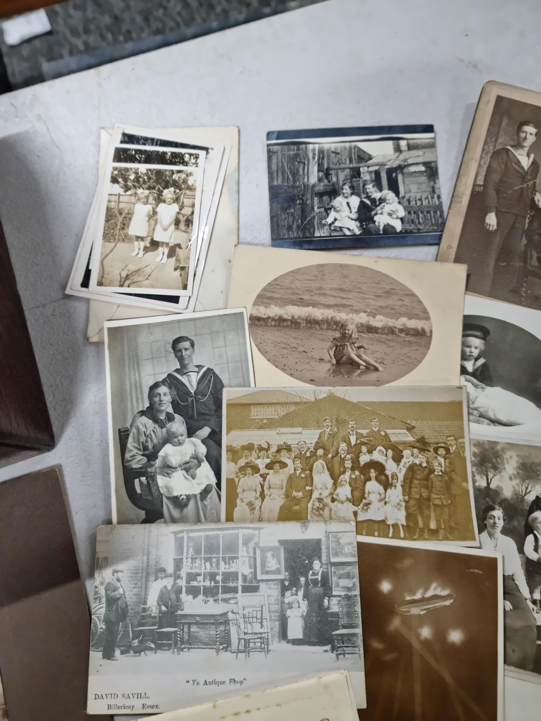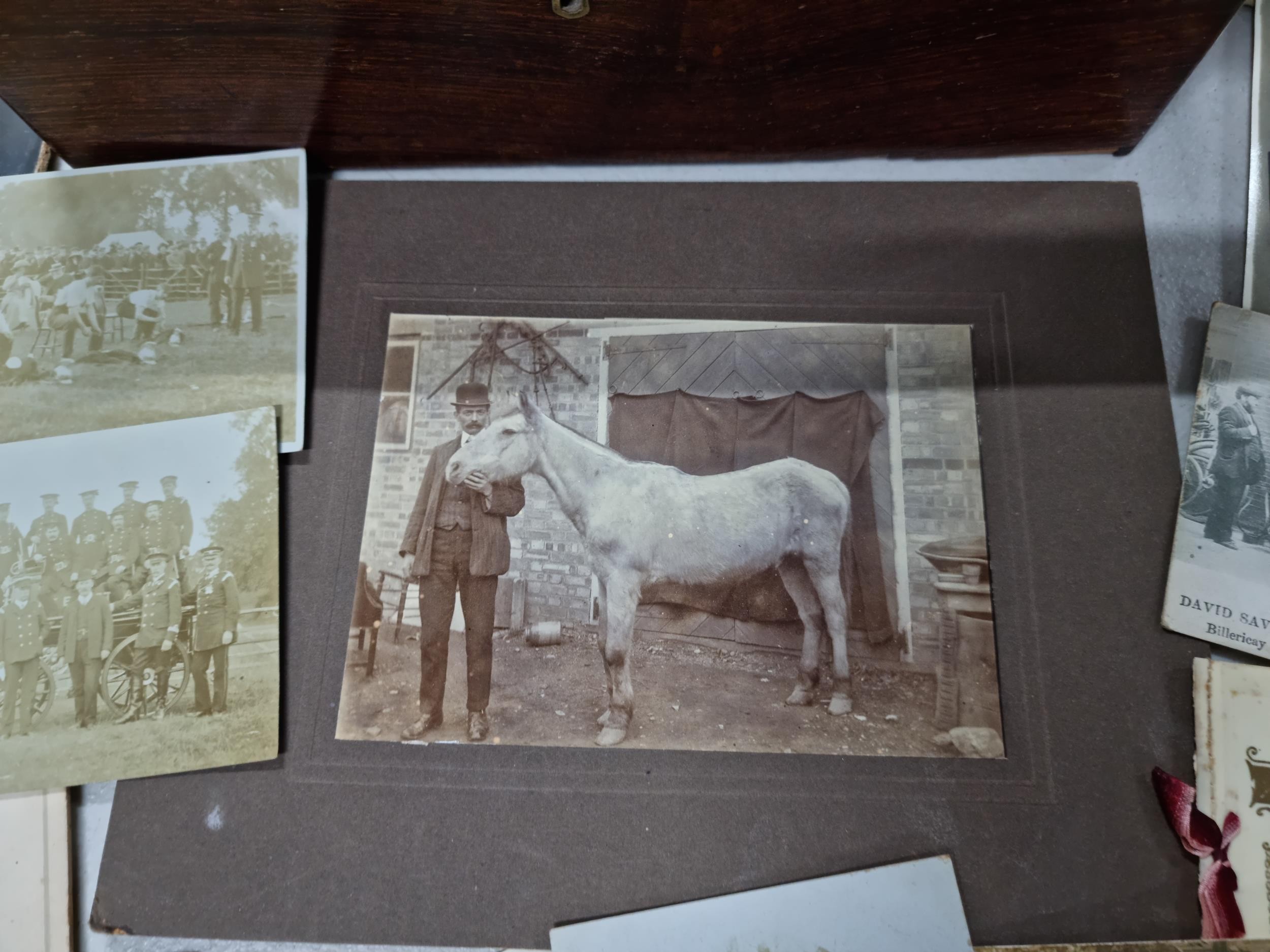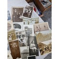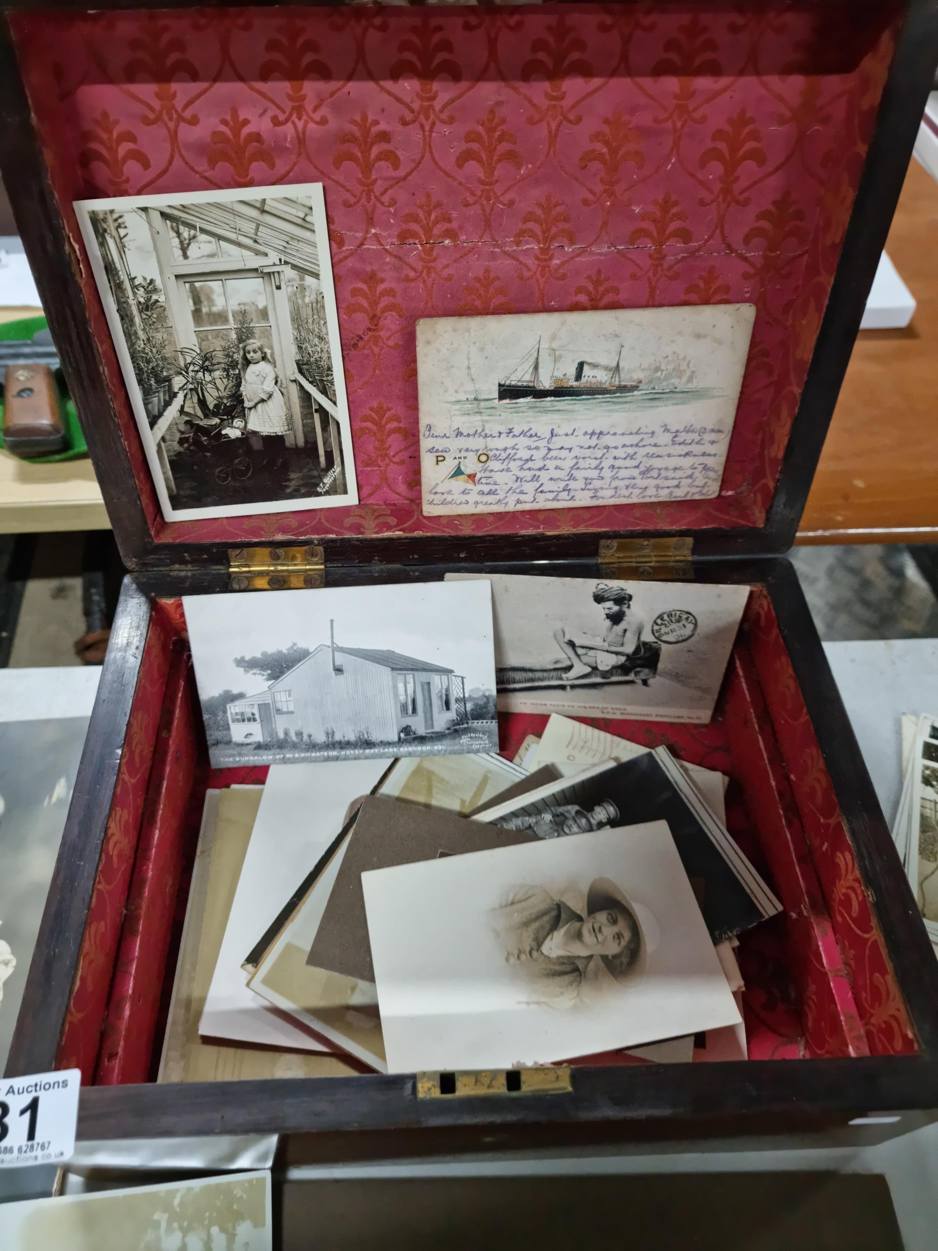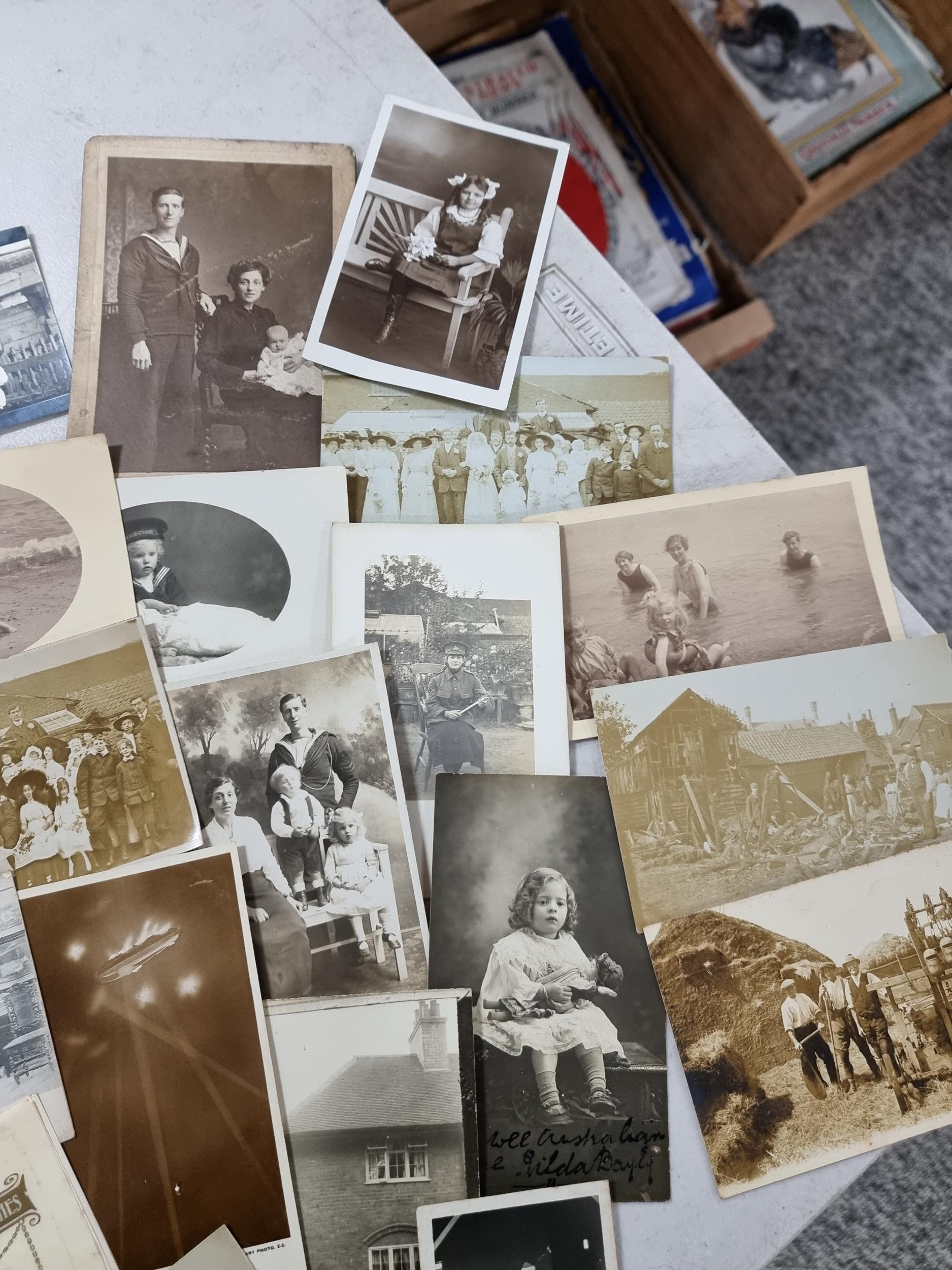 Good quality antique box containing a quantity of antique postcards and photographs inc military photos, wartime postcards, inc a The Strafer Strafed photo from 1916, please see pictures for more details, box measures 13cm high, 30cm long and 23cm deep