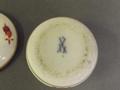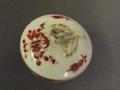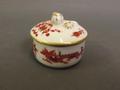A Meissen pot and lid with painted red and gold dragon and floral decoration, twin sword mark to base, 2' diameter