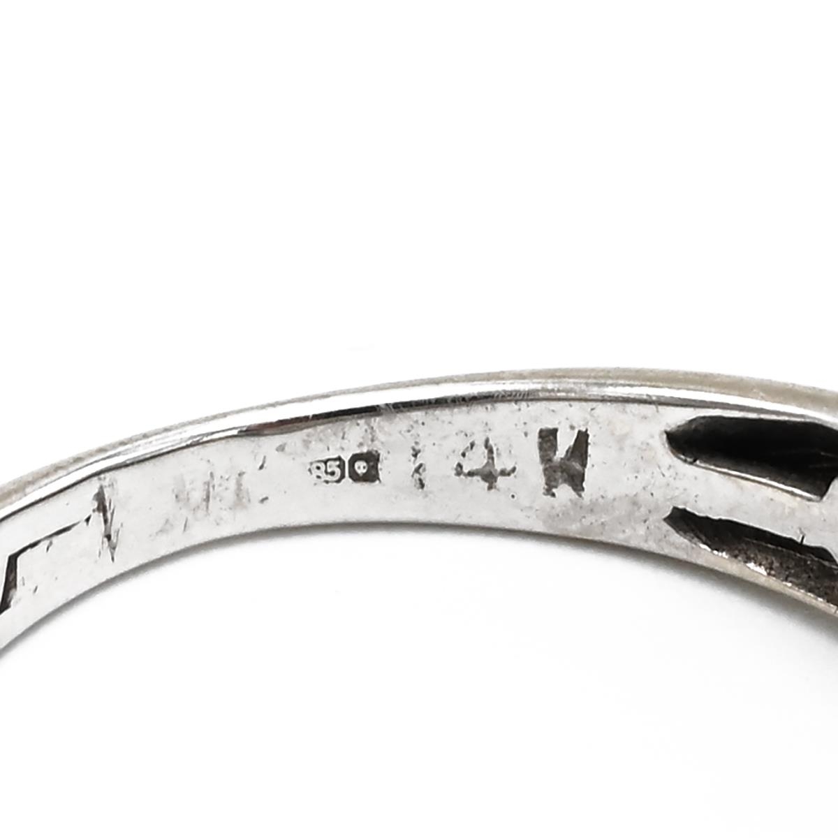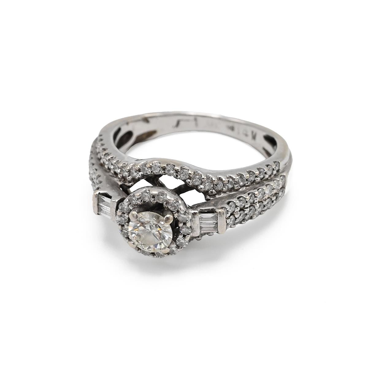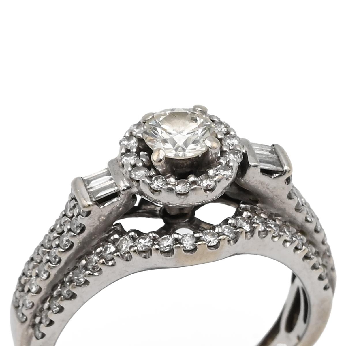 A 14k white gold and diamond dress ring, set with a round brilliant cut diamond approximately 0.3ct, further smaller pavé set diamonds and four baguette cuts, ring size M1/2, total gross weight approximately 4.9g. (J)