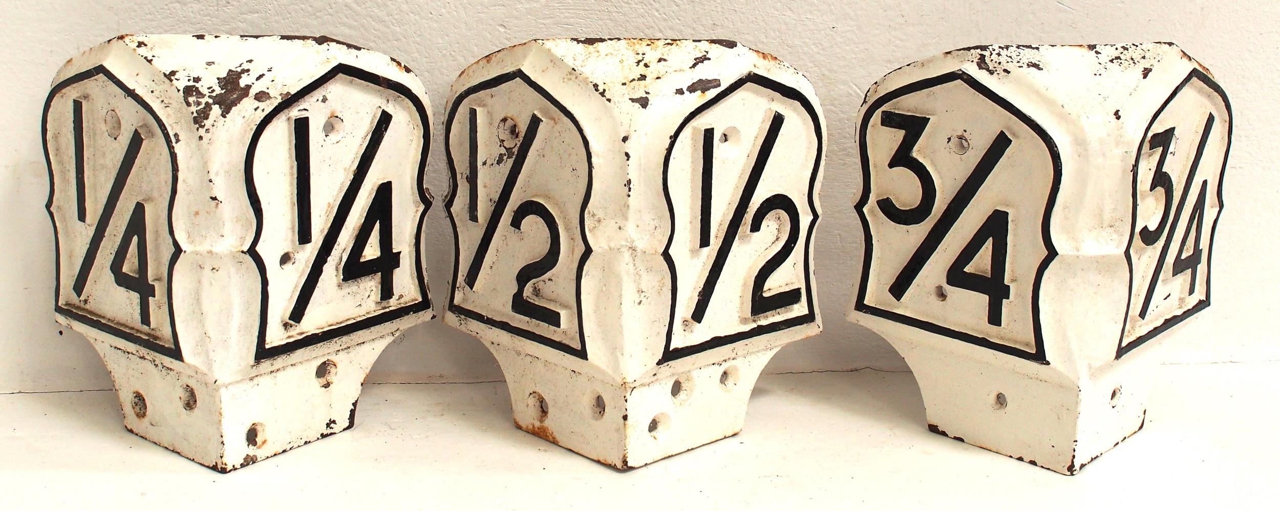 GNR C/I "V" milepost heads "1/4", "1/2" & "3/4", original backs, one of the more attractive patterns. (3) (C4) (Dispatch by Mailboxes/Collect from Banbury Depot)