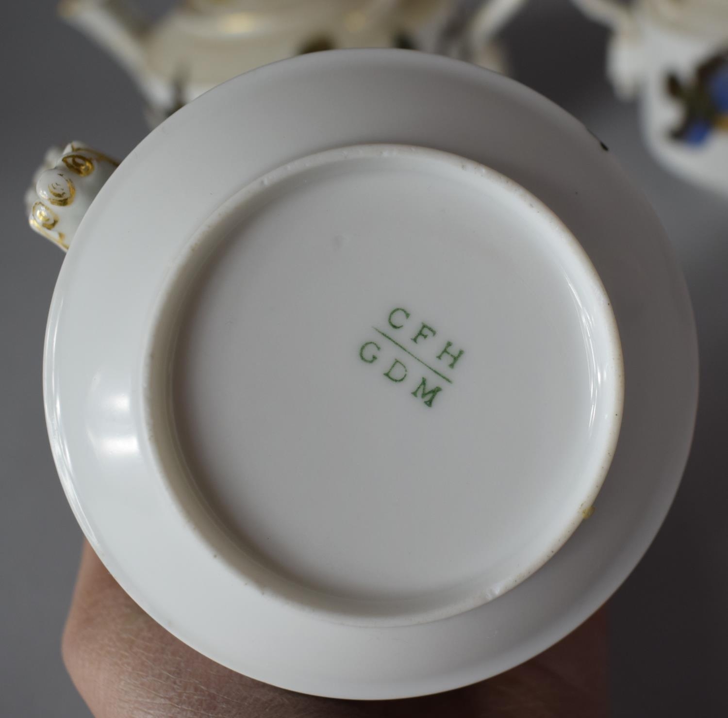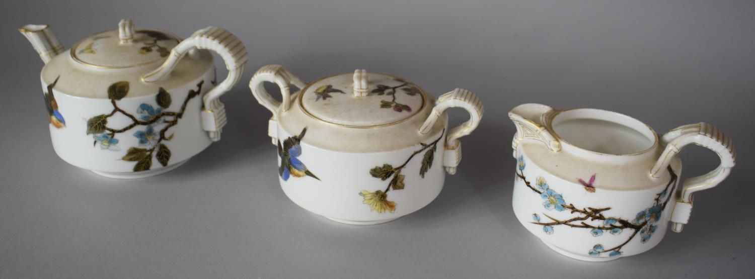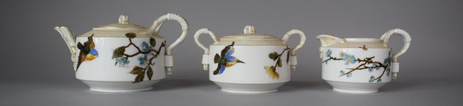 A Limoges Charles Field Haviland (CFH GDM) French Three Piece Aesthetic Pattern Teaset to Comprise Bachelors Teapot, Lidded Sugar and a Cream Jug with Bamboo Stylised Handles and Kingfisher, Floral and Insect Decoration