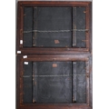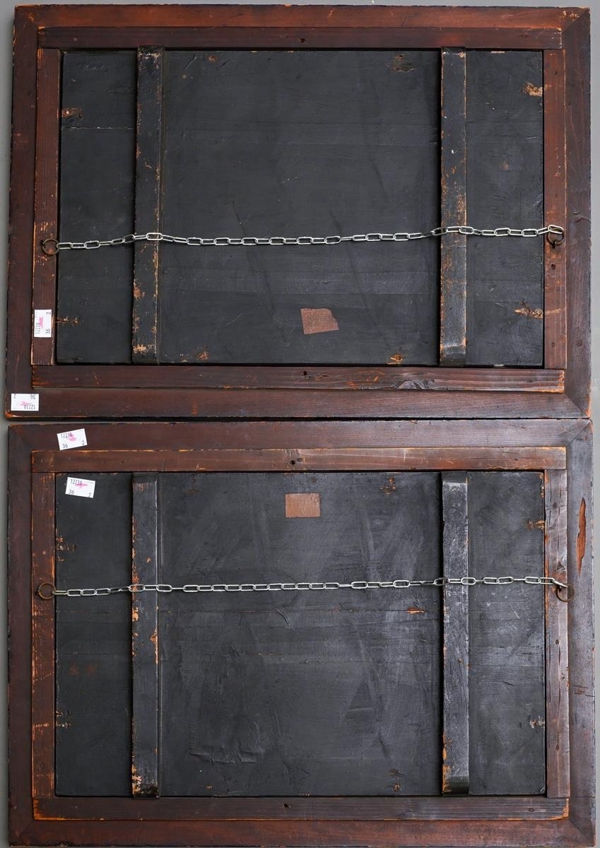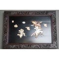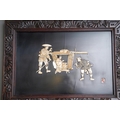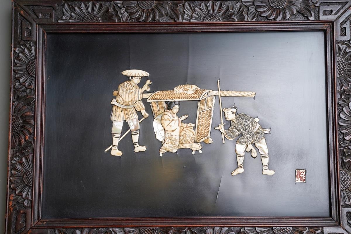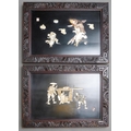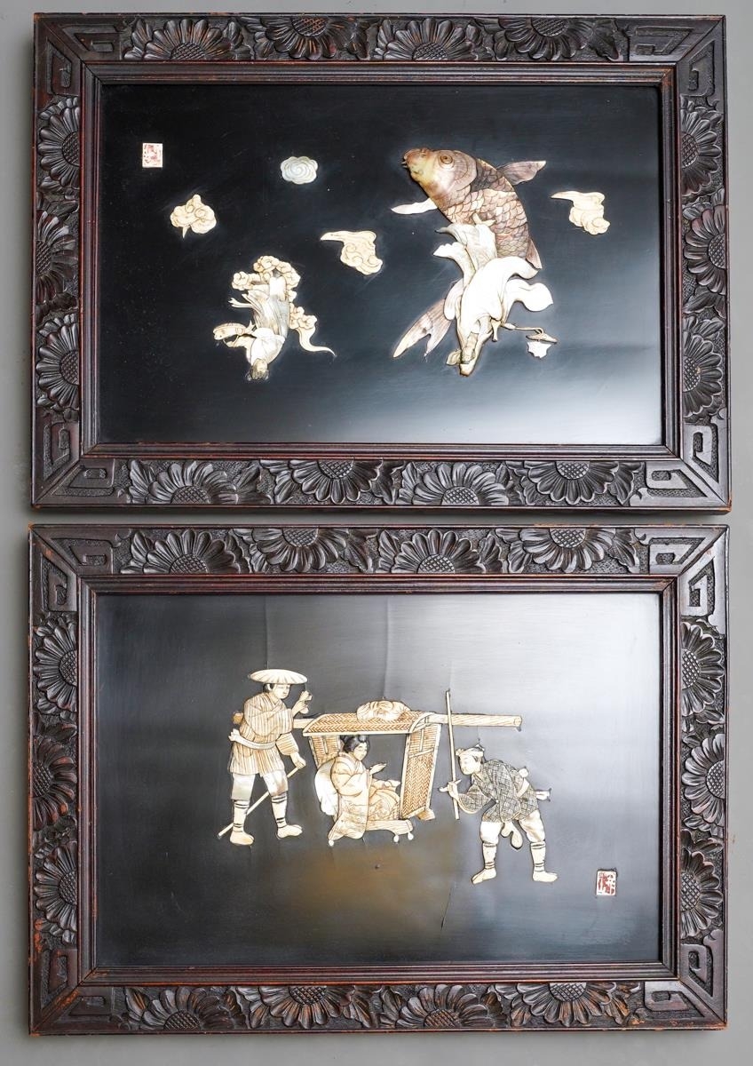 Two early 20th century Japanese shibayama panels in foliate carved frames, one depicting two male figures and a seated geisha, the other of deities in the clouds, one travellling on the back of a carp,both with applied character marks, all in mother of pearl and bone on black lacquered base, frame size 40cm x 55cm (2)
