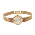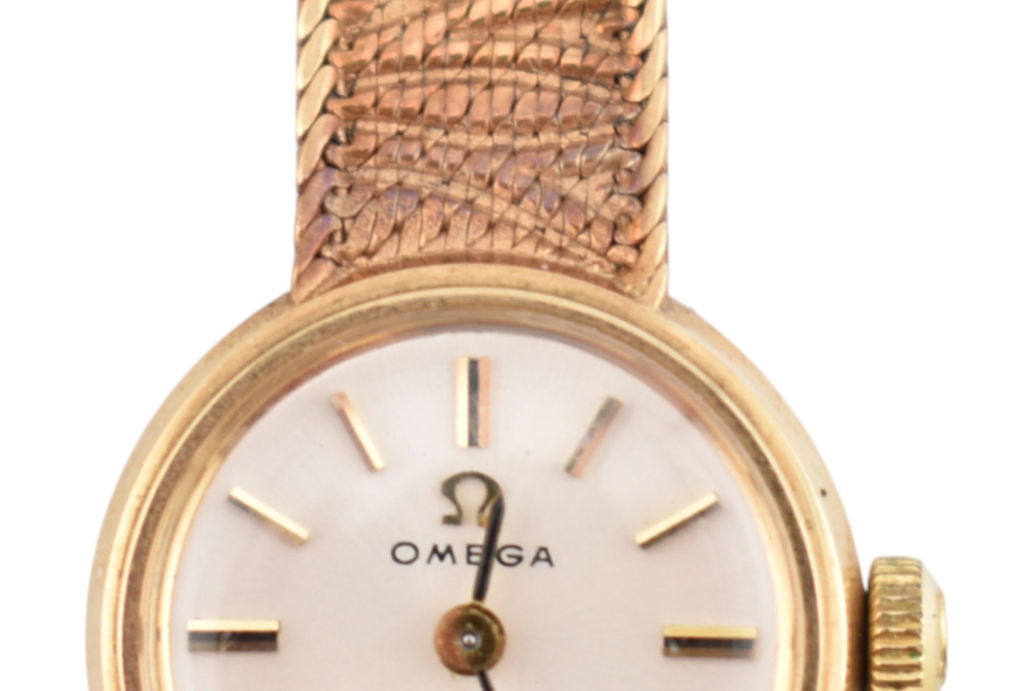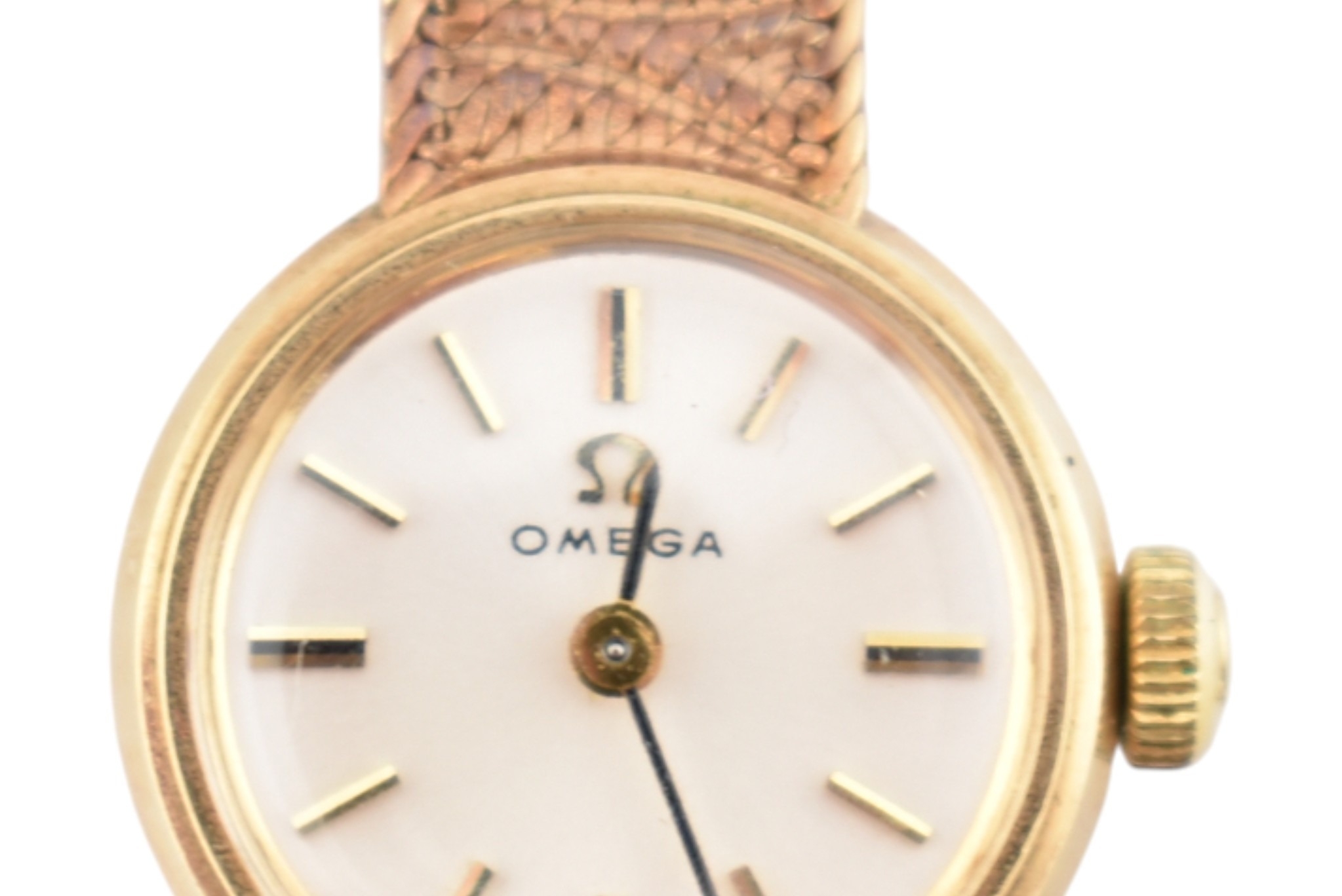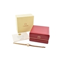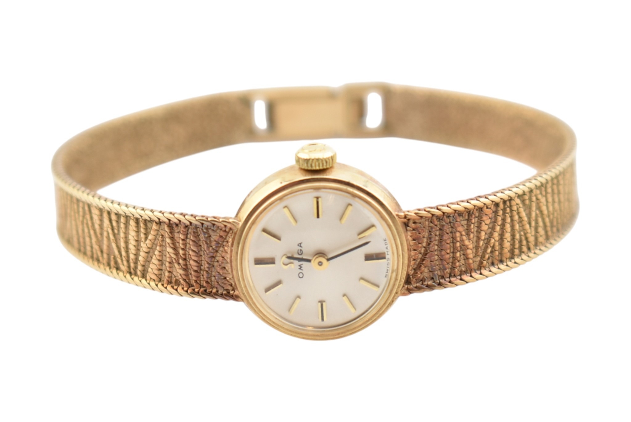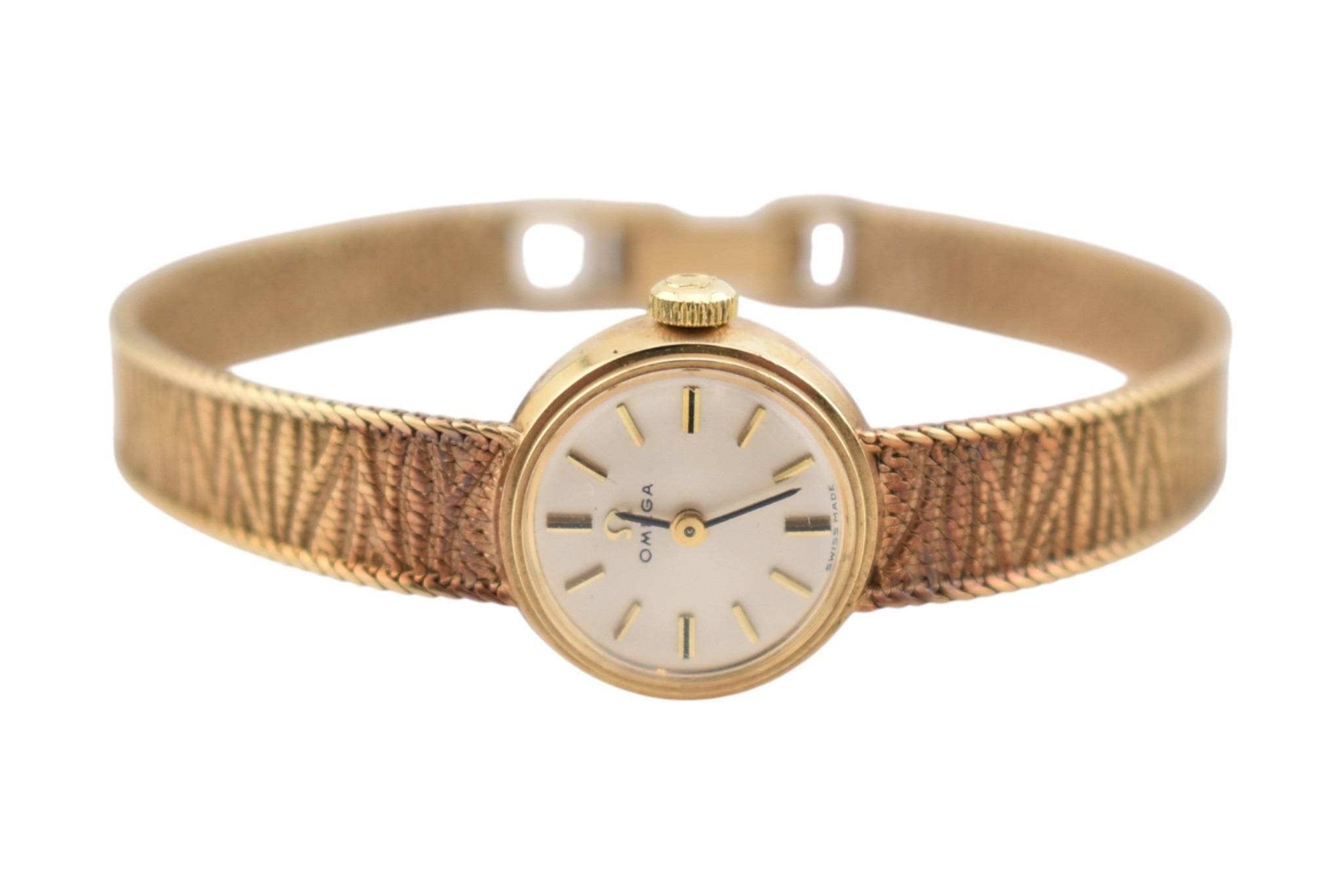 A hallmarked 9ct gold Omega wristwatch and strap. The silvered dial with baton markers. Set with original ornate textured twin-sided strap. Complete with presentation case and box with original guarantee (dated 12/12/1969). Total weight 17.5g. Total length 17.5cm. The watch is ticking at the time of cataloguing; however, we do not guarantee it will continue to do so.