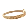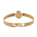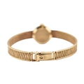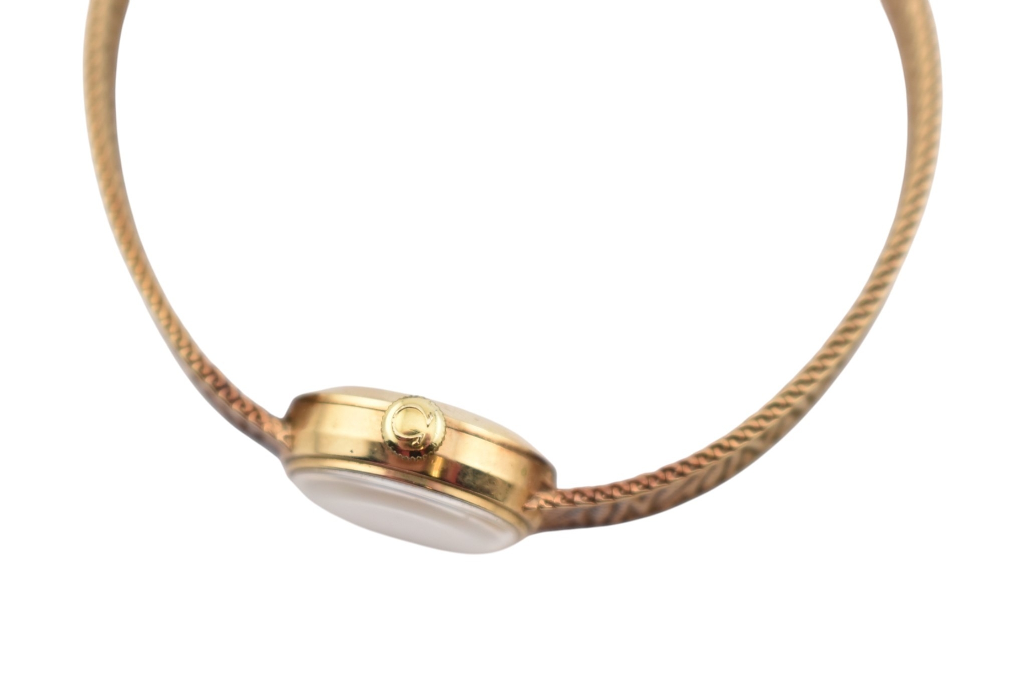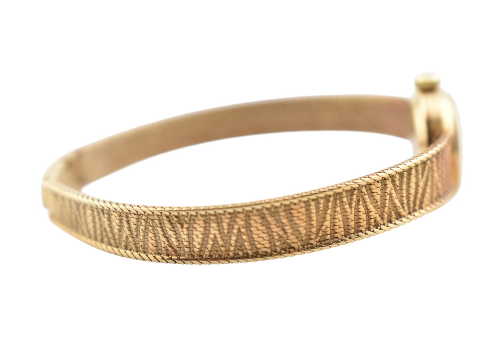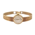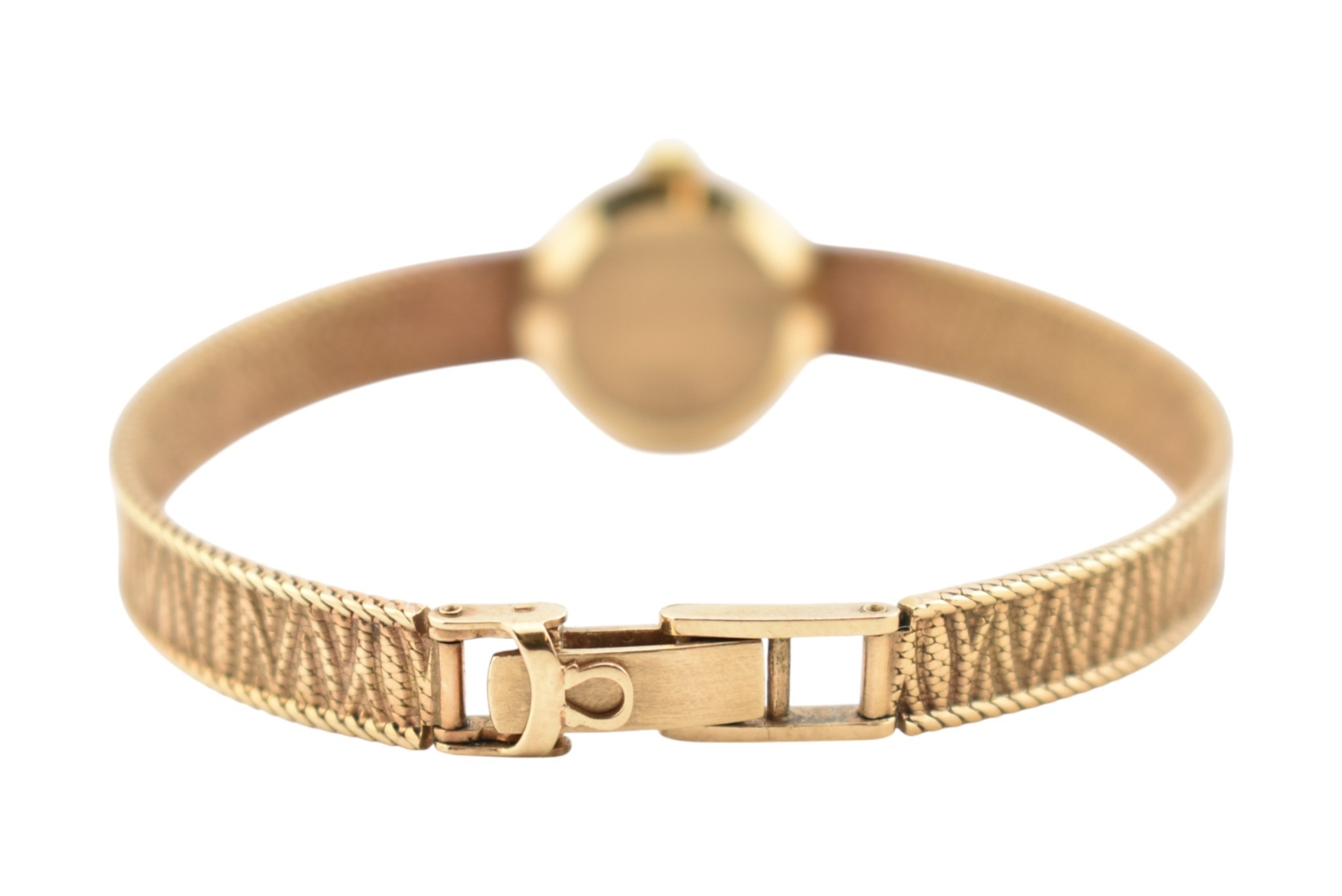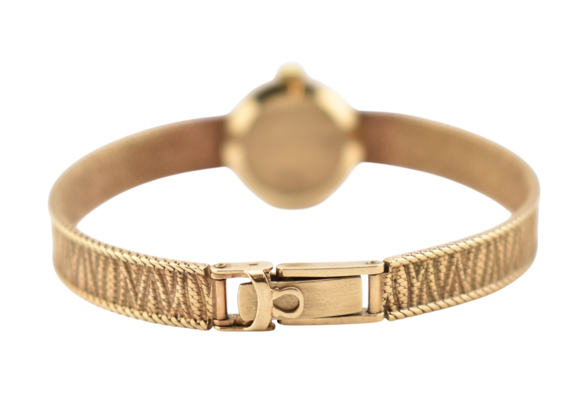 A hallmarked 9ct gold Omega wristwatch and strap. The silvered dial with baton markers. Set with original ornate textured twin-sided strap. Complete with presentation case and box with original guarantee (dated 12/12/1969). Total weight 17.5g. Total length 17.5cm. The watch is ticking at the time of cataloguing; however, we do not guarantee it will continue to do so.