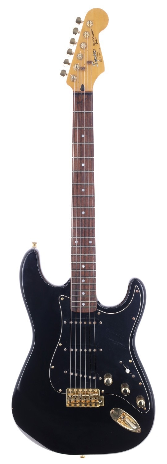 Squier by Fender Stratocaster electric guitar, made in Korea, circa 1991; Body: black finish, various minor dings and surface scratches; Neck: maple, dings and marks throughout; Fretboard: rosewood; Frets: mild wear throughout; Electrics: working, some minor switch intermittence; Hardware: upgraded Wilkinson tuners, upgraded bridge, replacement control knobs, missing spring cavity back plate; Overall condition: good