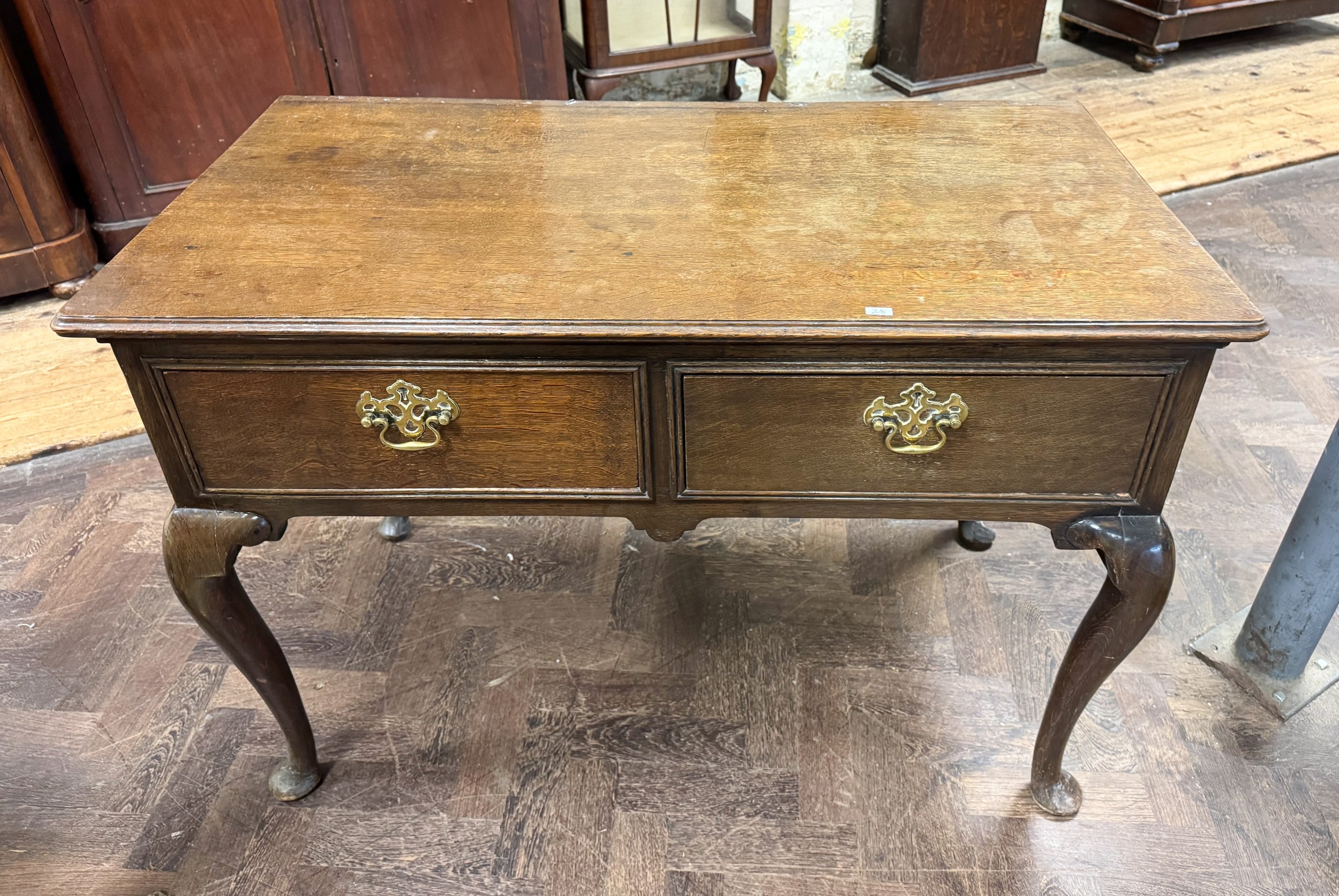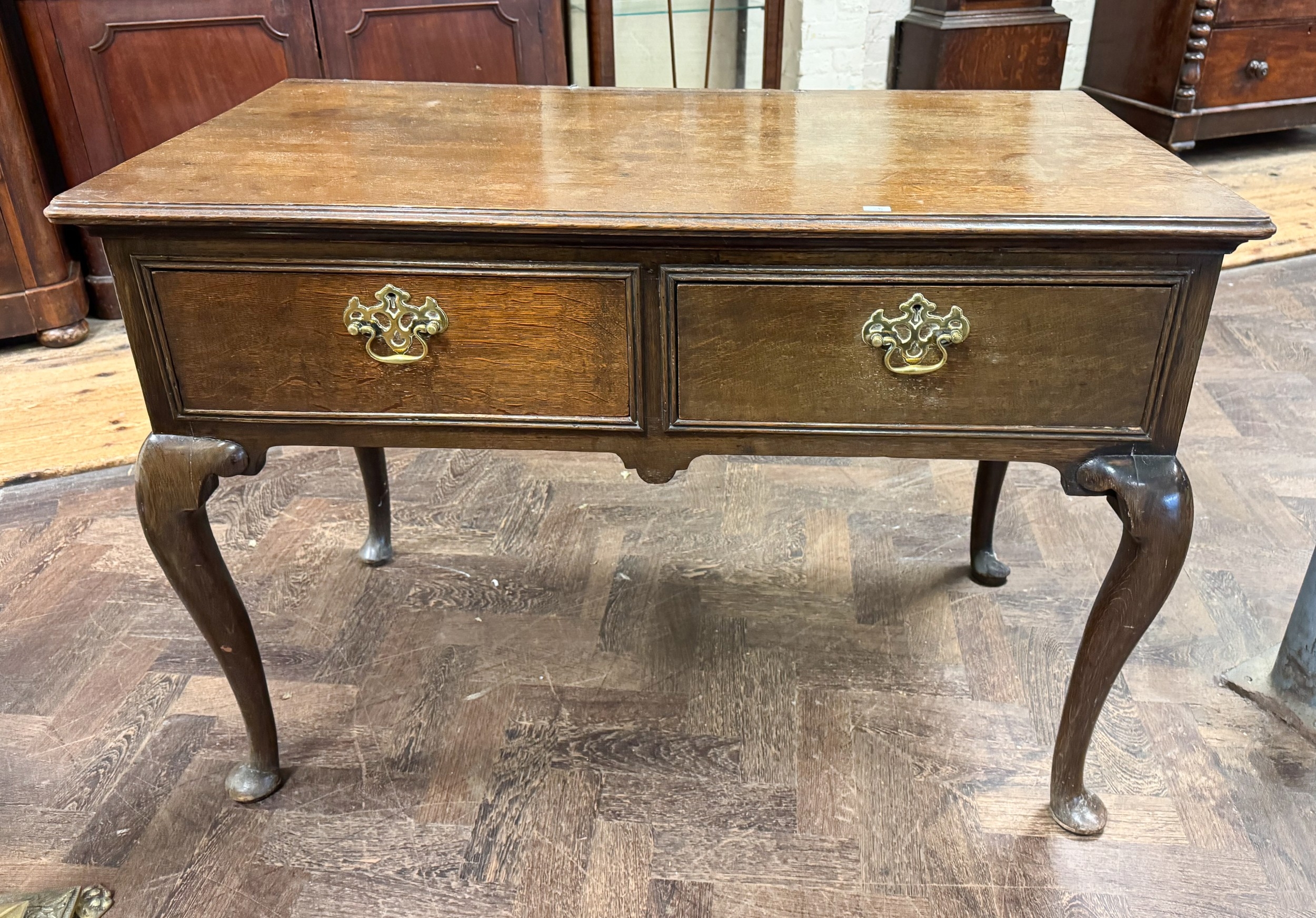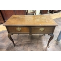 An antique style oak hall table fitted two drawers with brass handles, raised on cabriole legs