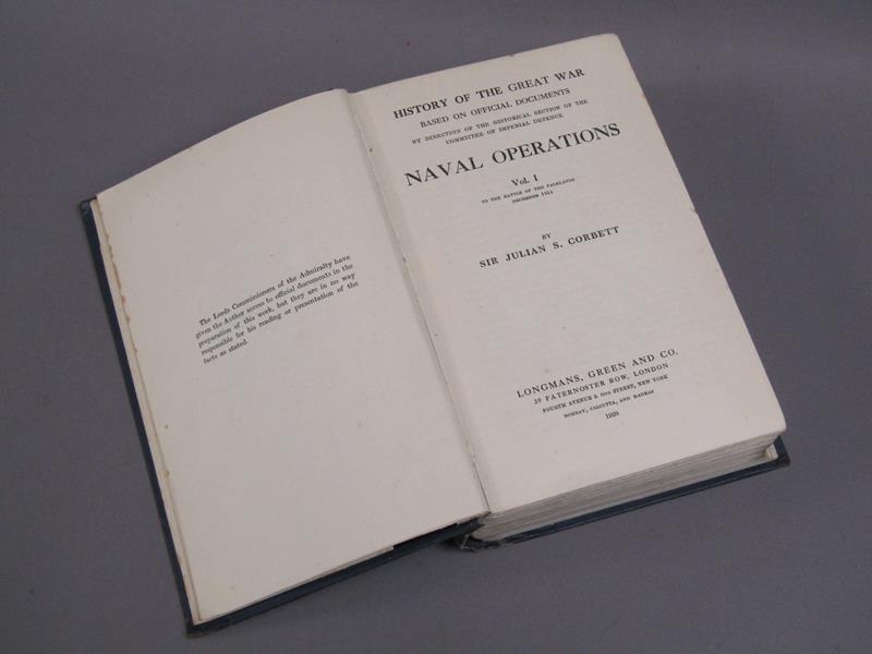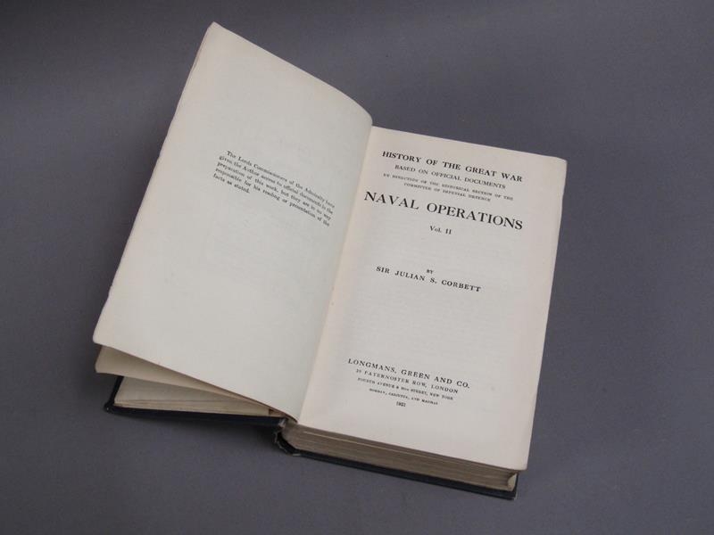 A collection of Naval books and documents comprising two books - History of the Great War based on official documents, Naval operations volumes I & II, by Sir Julian S Corbett, published by Longmans Green & Co, 1920. Together with a book of maps - Naval operations Volume I to the battle of the Falklands. no.1 - 18. and a Naval Officers epaulette.