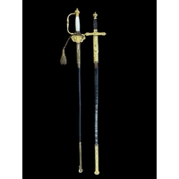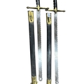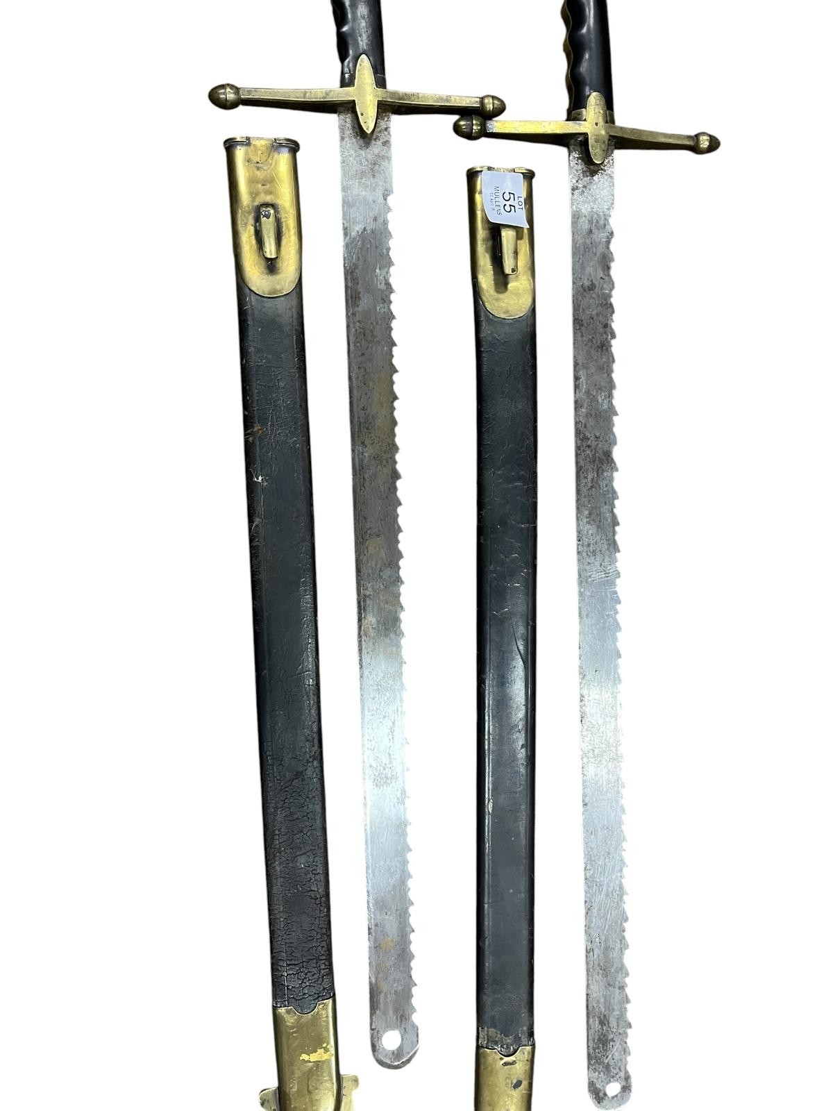A PAIR OF 19TH CENTURY SAWBACK SWORDS with single edged blades having sawbacks and rounded tips with a pierced hole in each. Complete with scabbards. No apparent maker's marks.