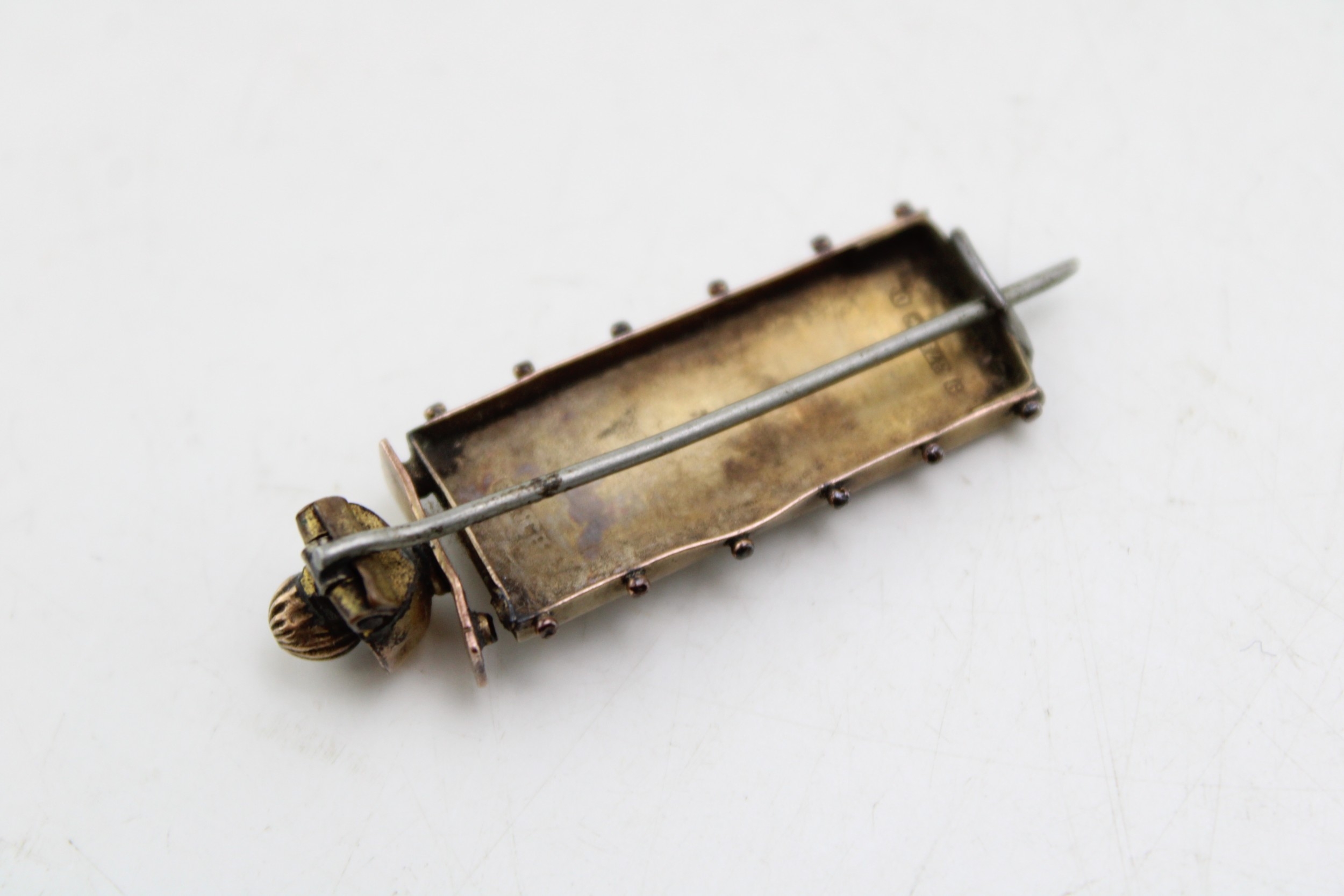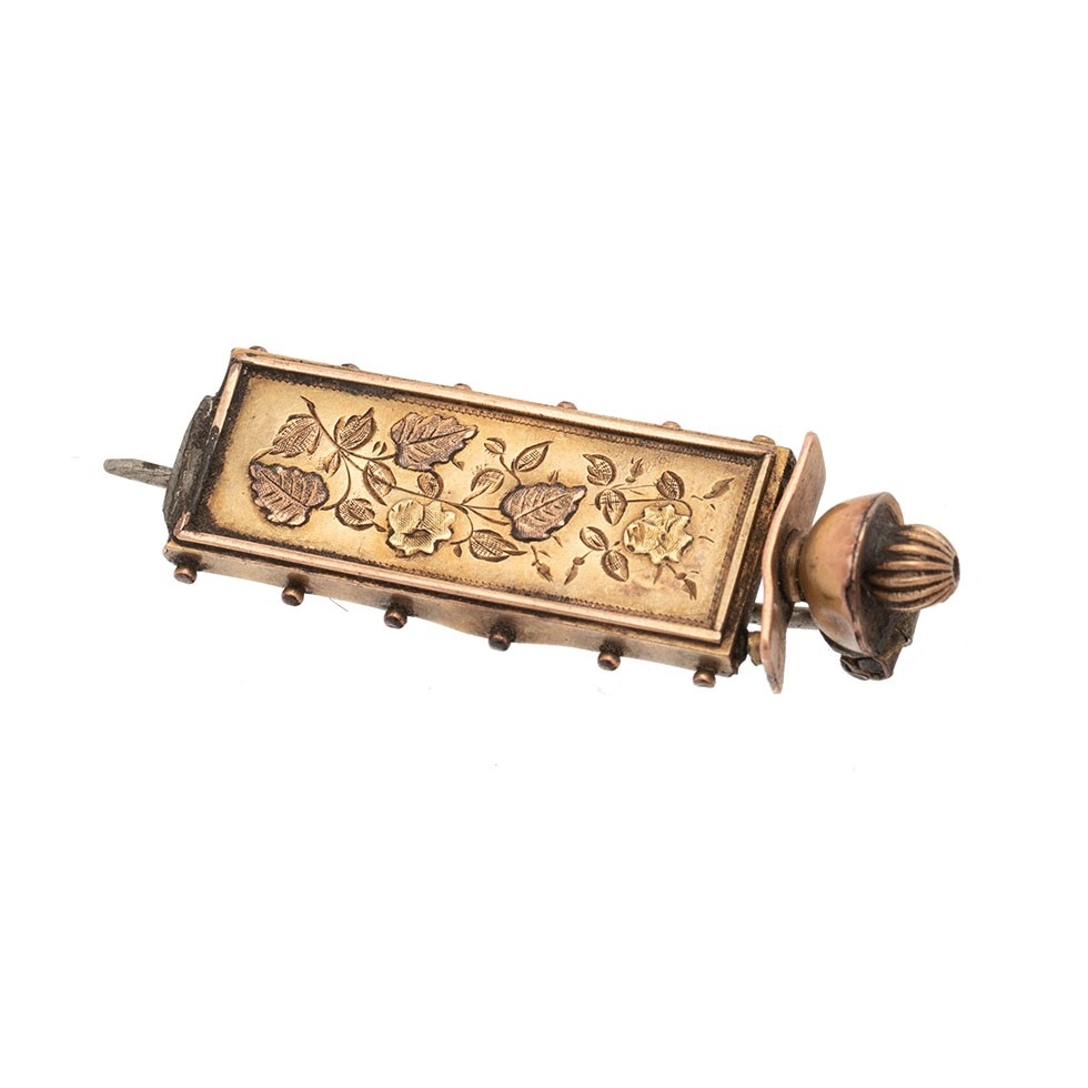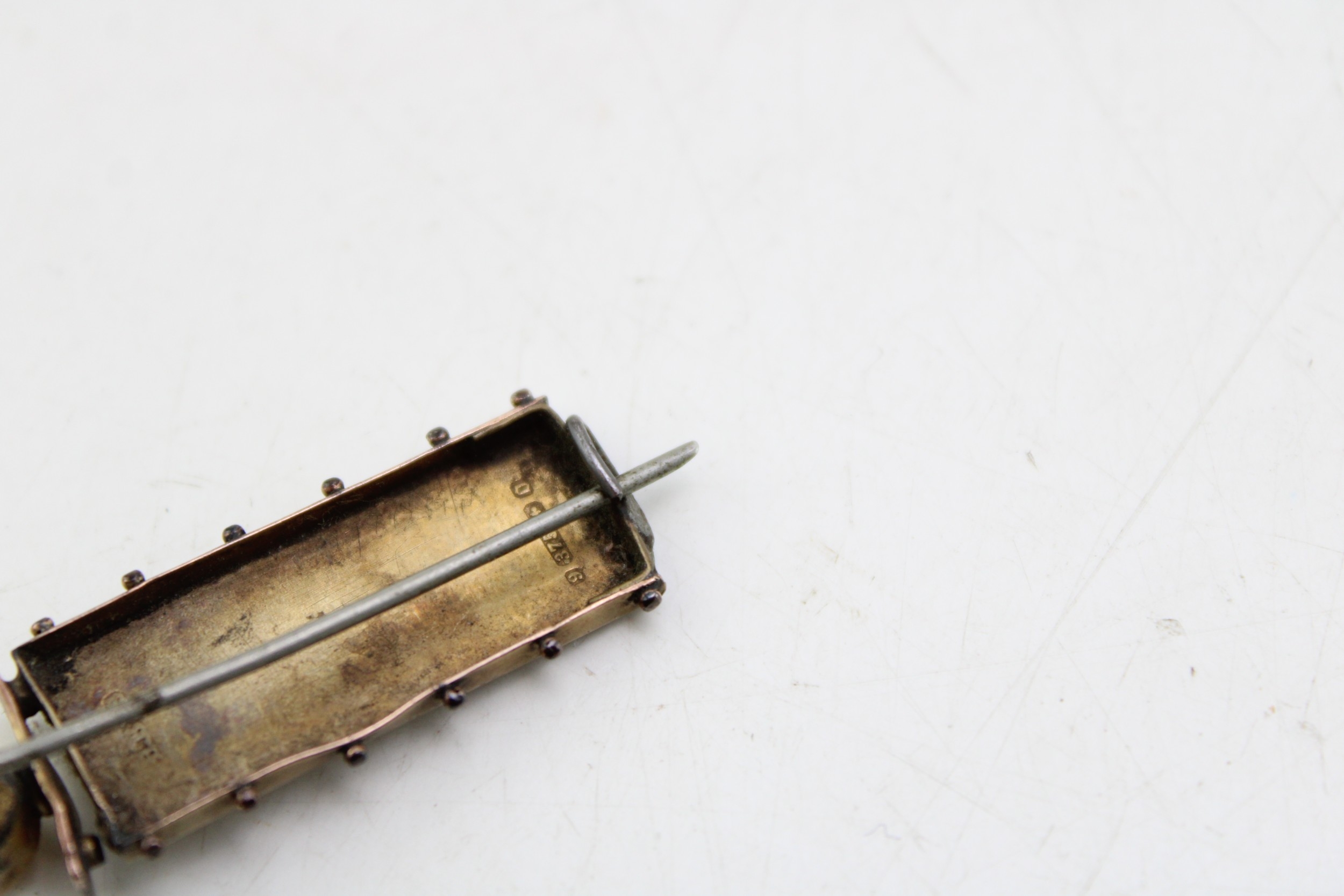 A 9ct brooch with foliate engraving, 2.9g, with steel pin, 40mm wide.